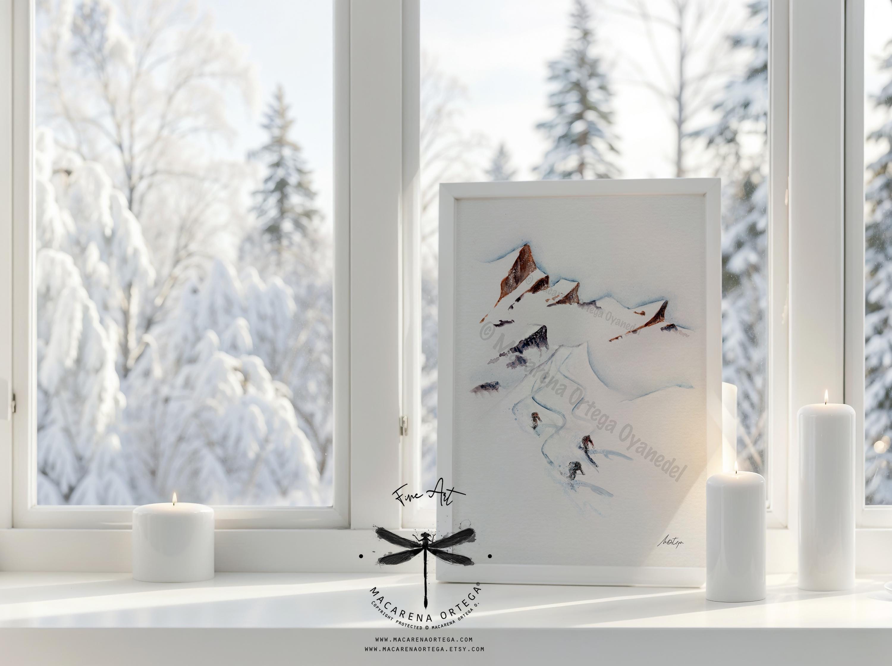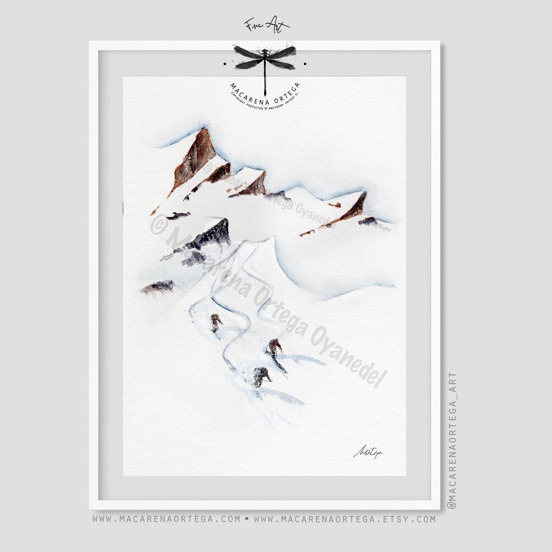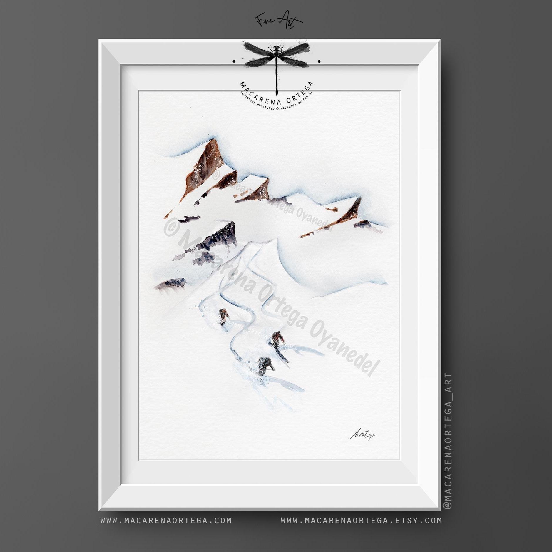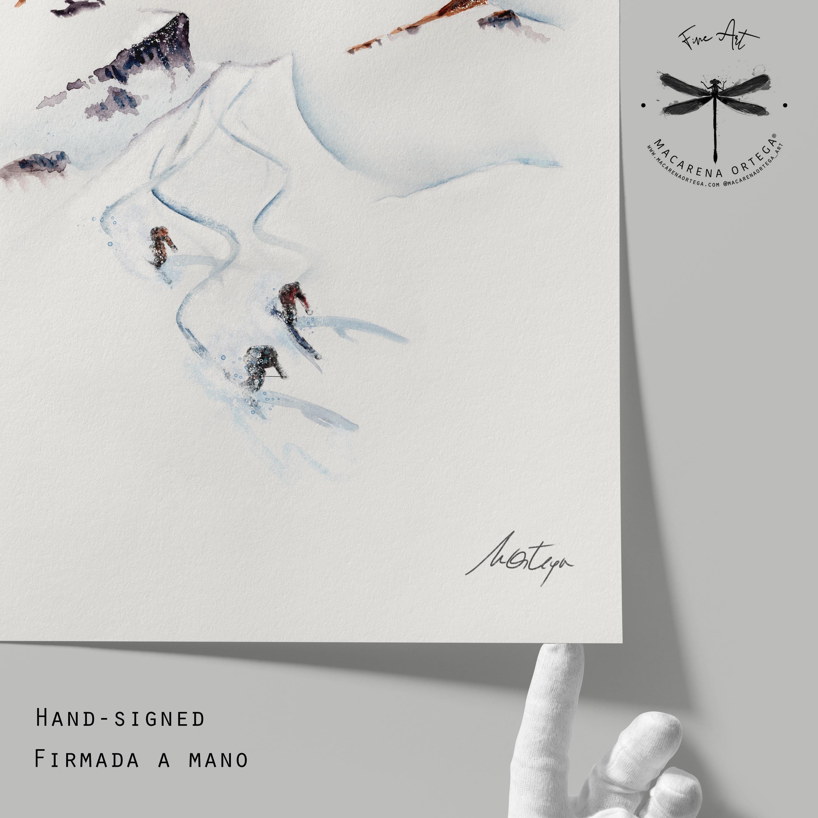 Carving through the snow in freedom… relive the thrill of powder in watercolor.