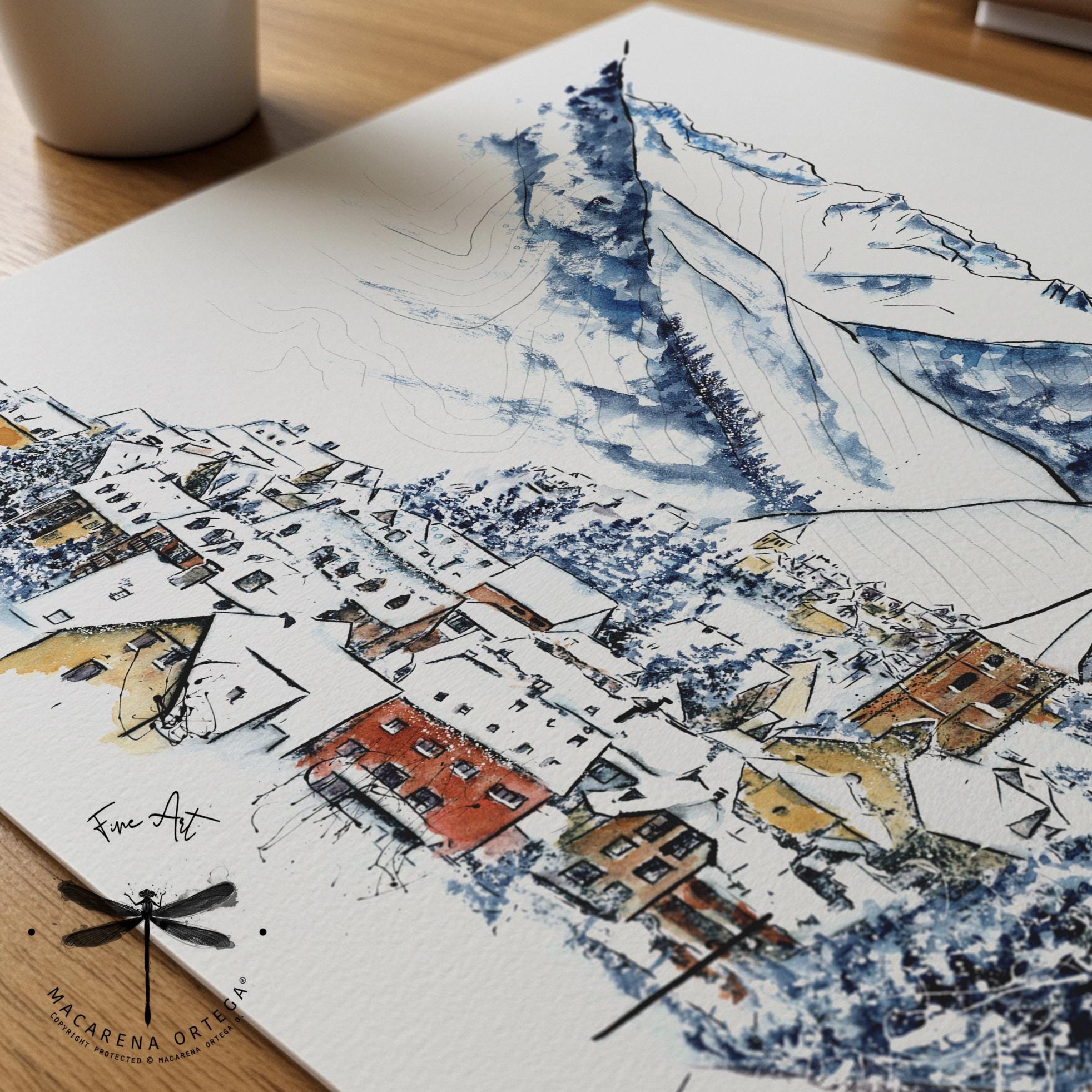 Salardú, Val d’Aran — a Pyrenean village with the. mountains rising in the background, captured in watercolor.