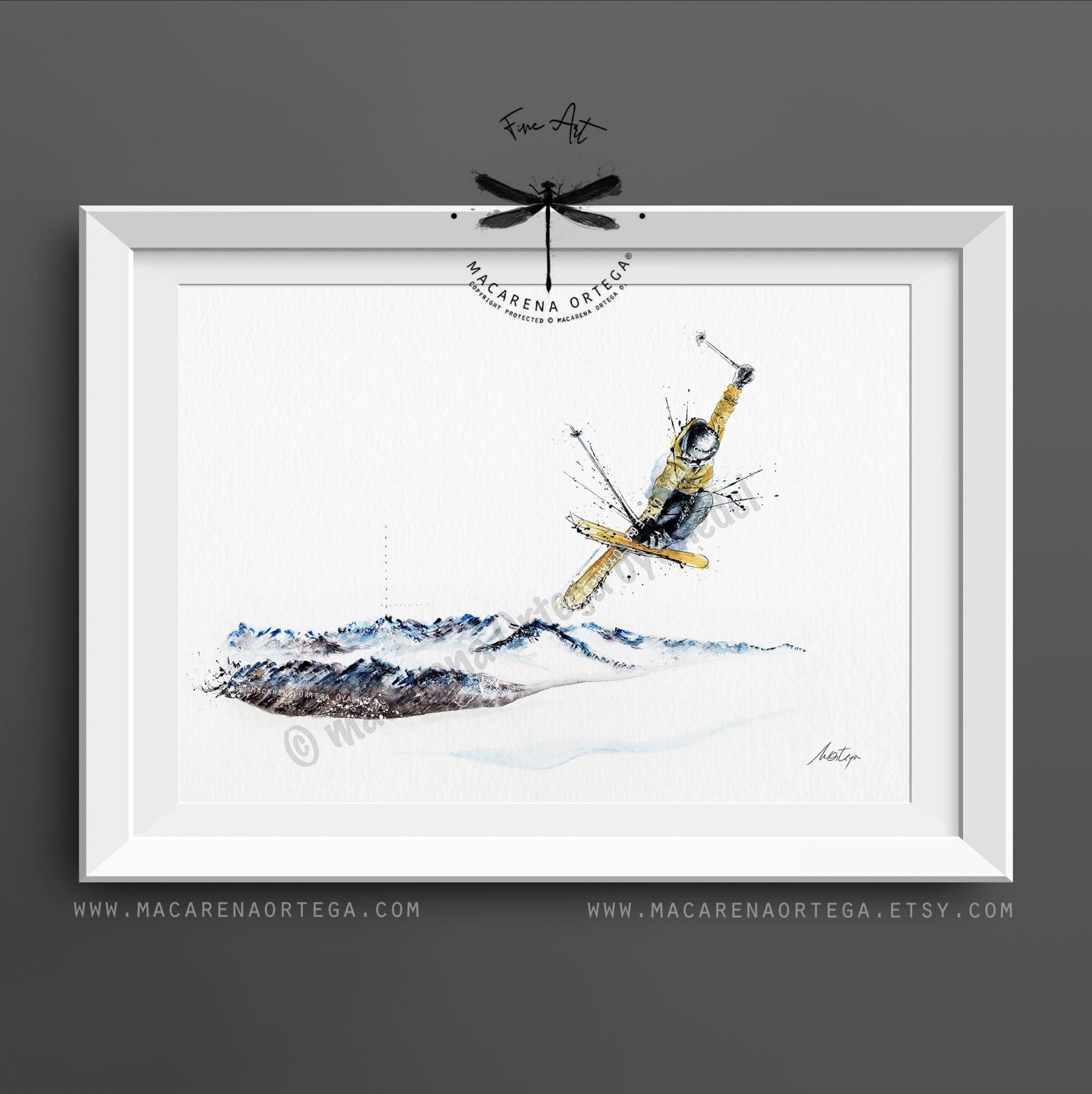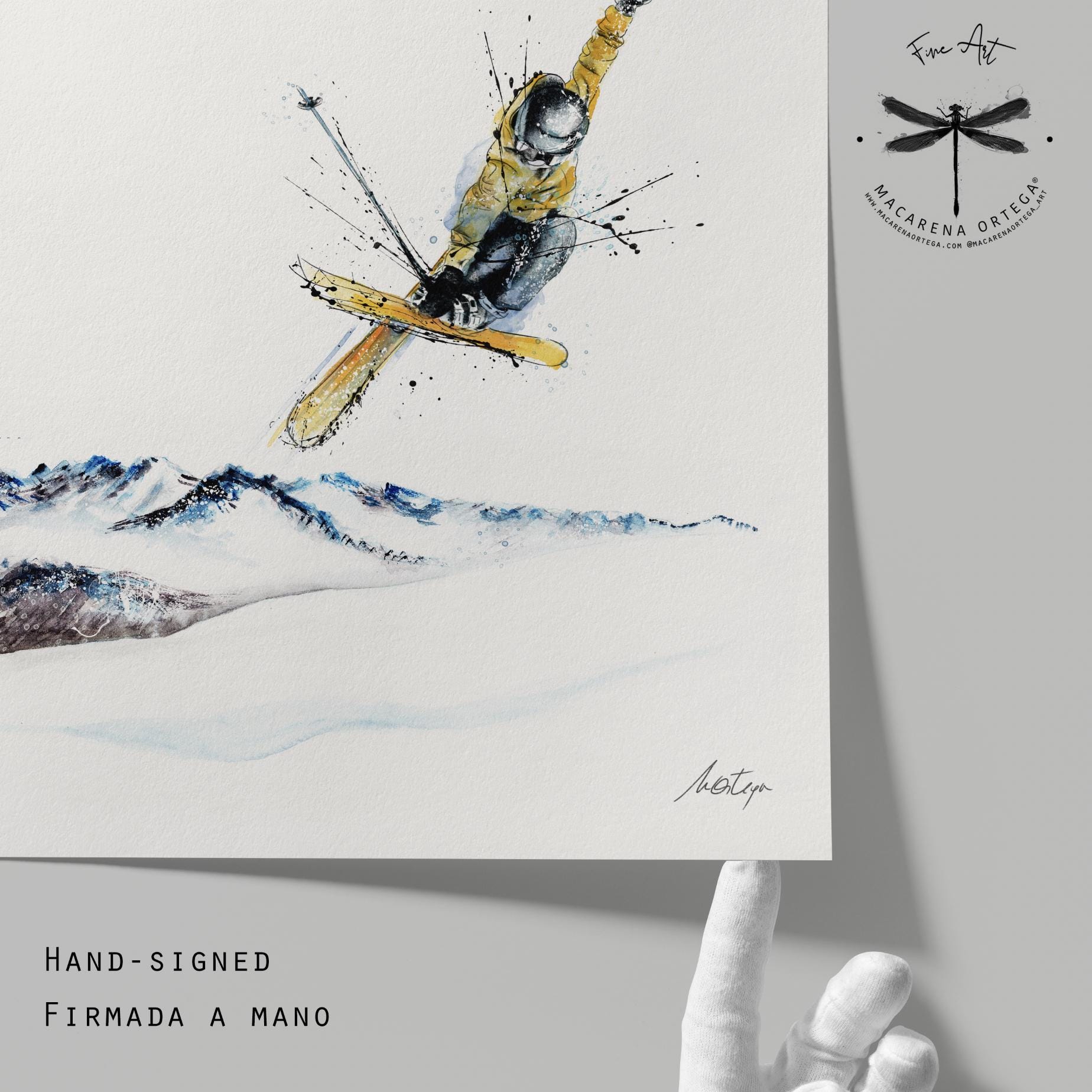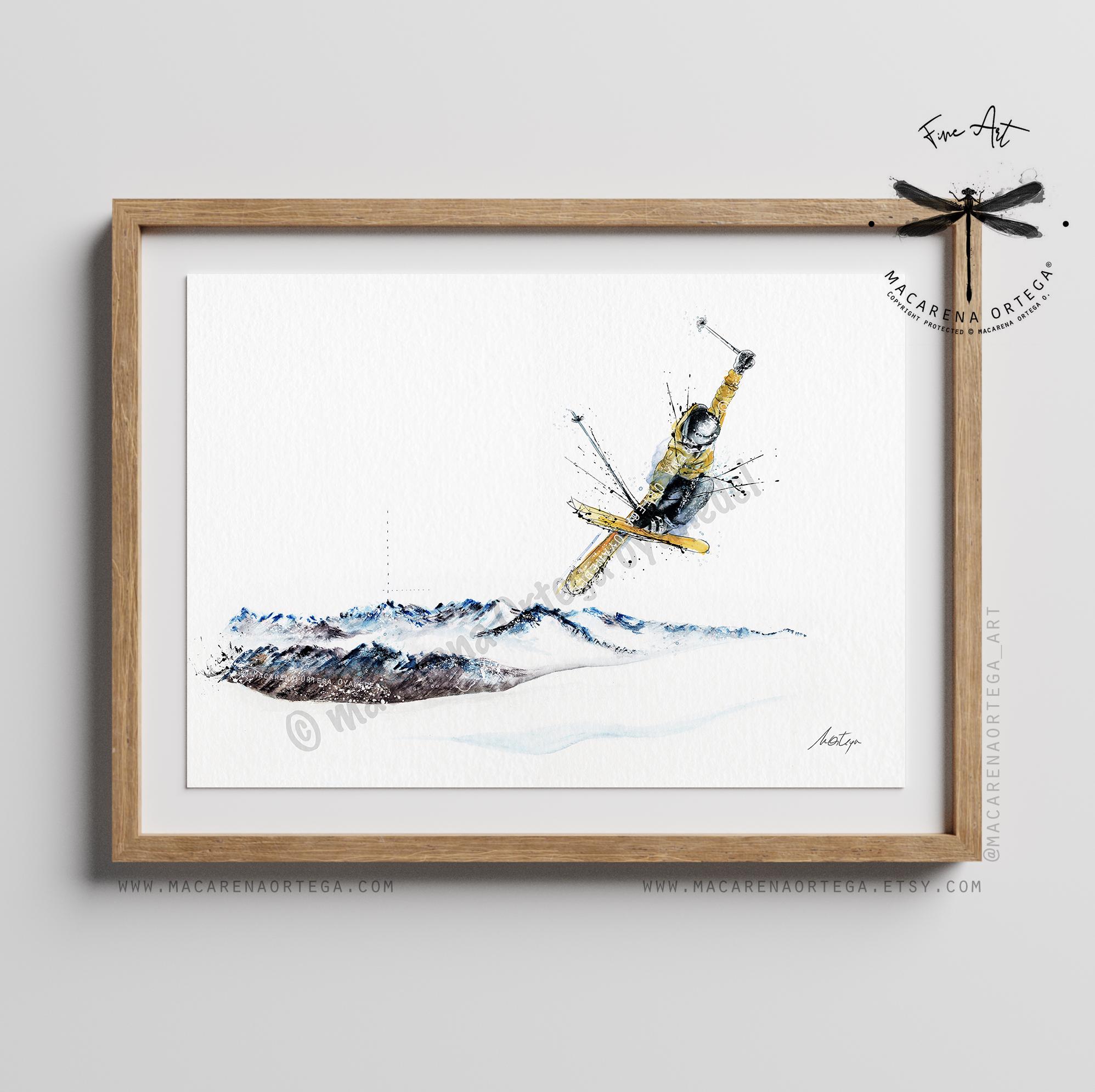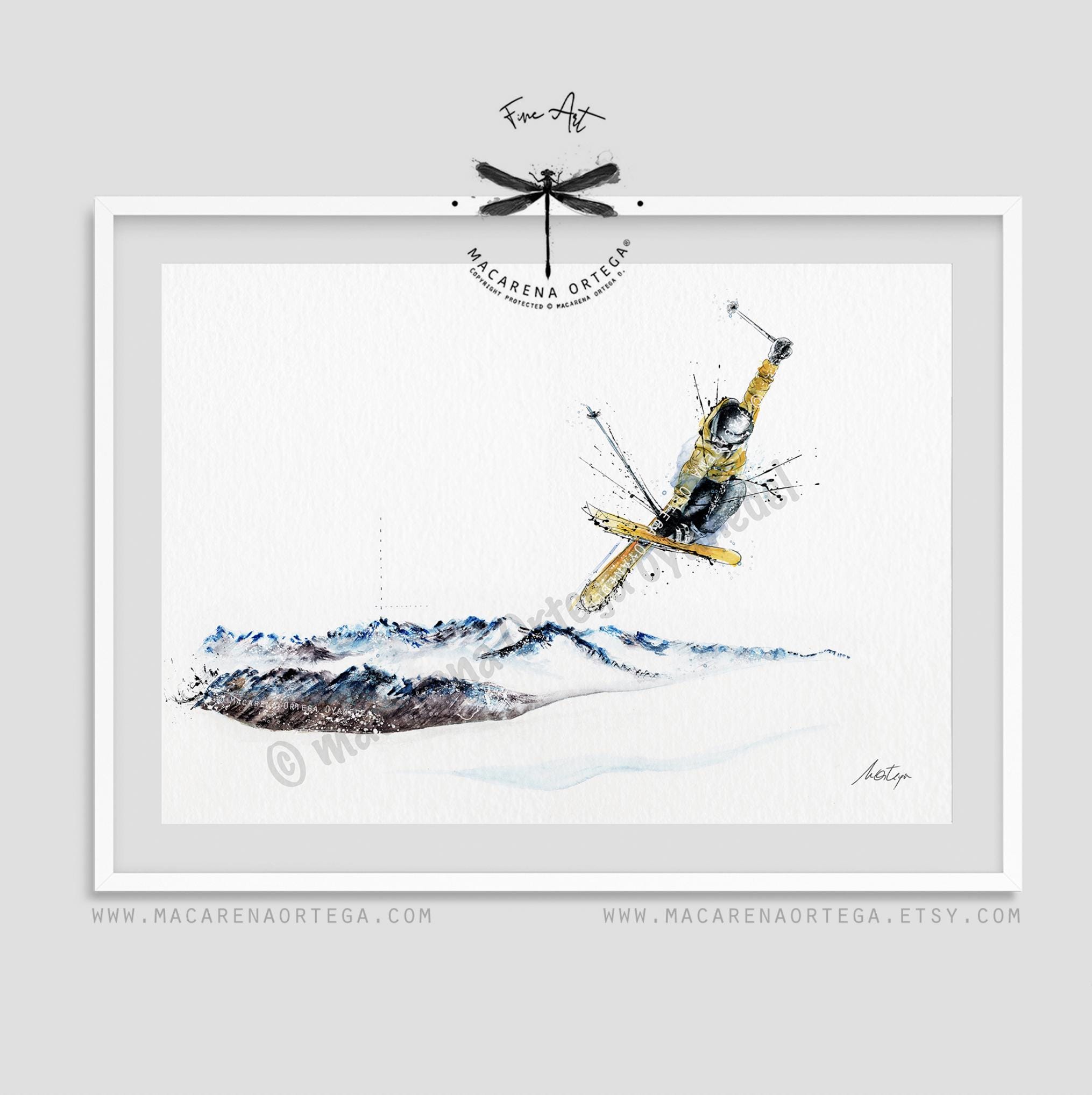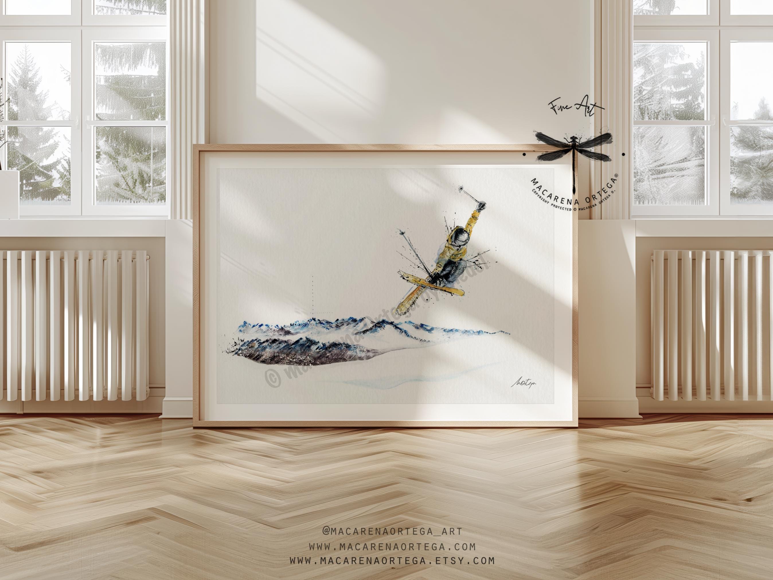 Dynamic watercolor of a freestyle skier soaring above the mountain snow.