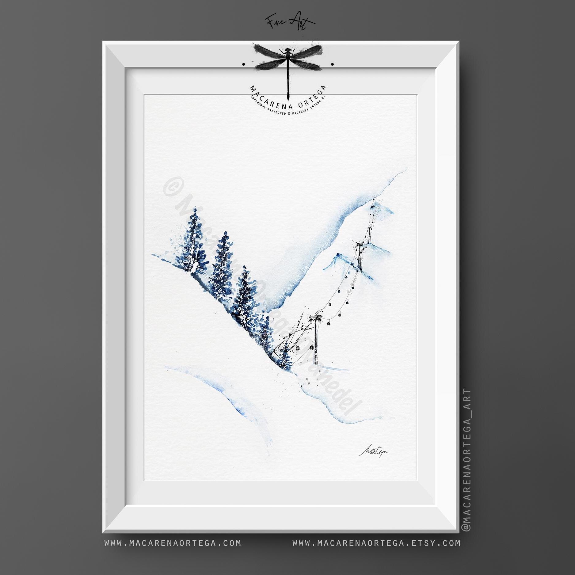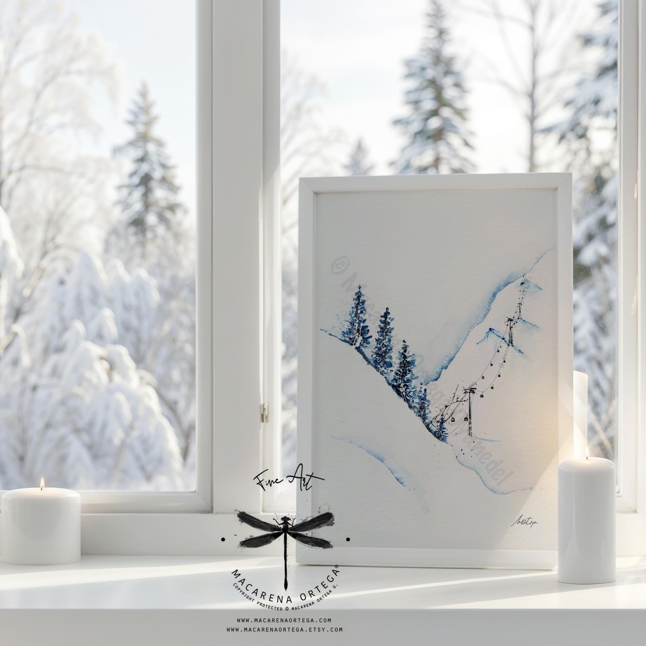 A distant chairlift rising quietly through snow and mountains, captured in a serene minimalist watercolor.