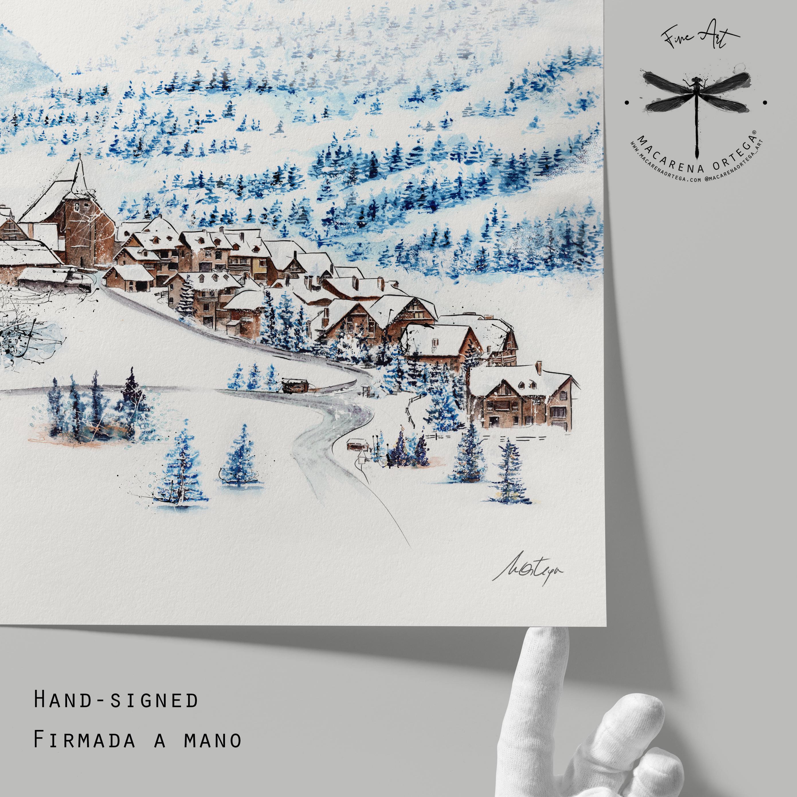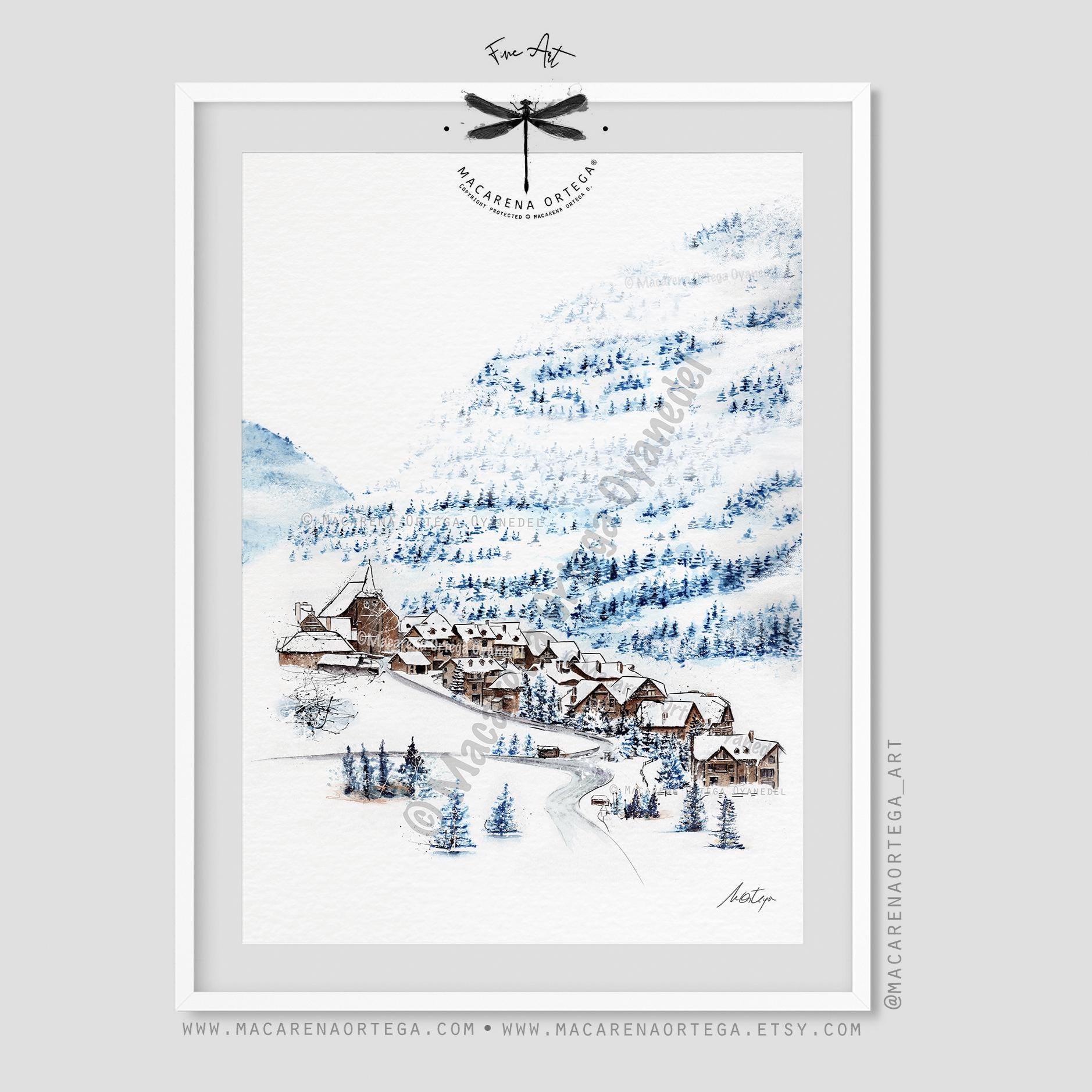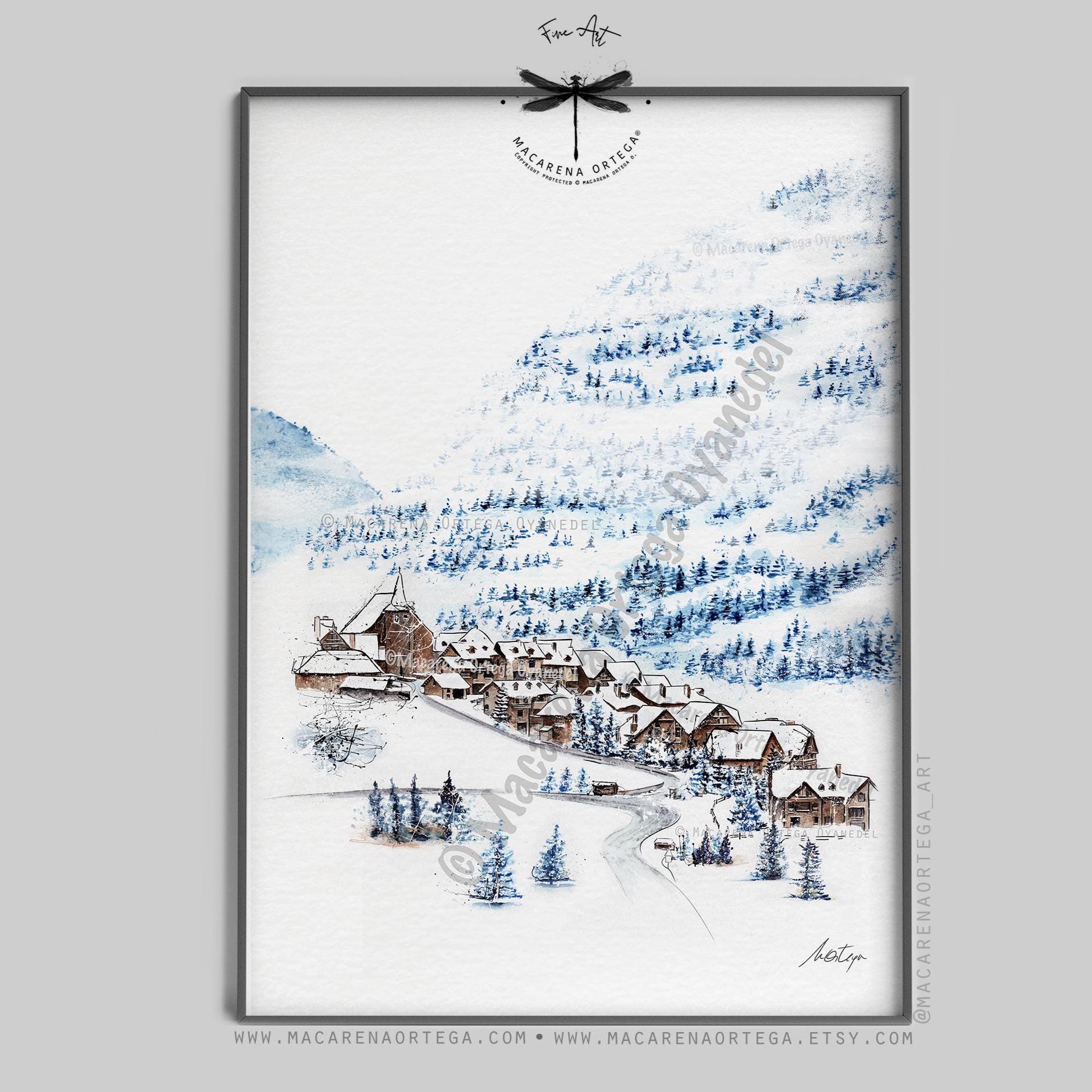 Watercolor of Tredós, a beautiful village in the Aran Valley, covered in snow. Captures the calm and magic of this Pyrenean winter scene.
