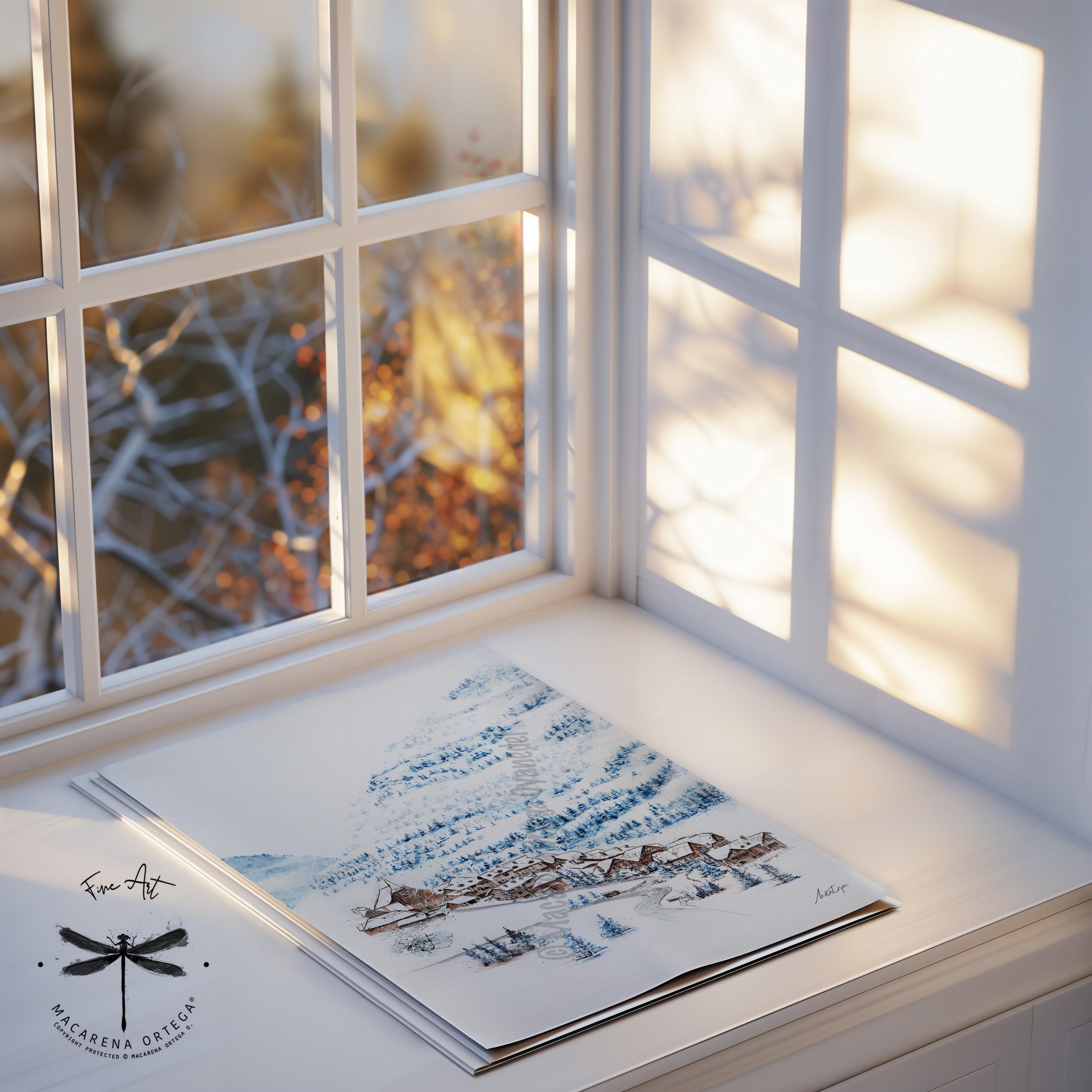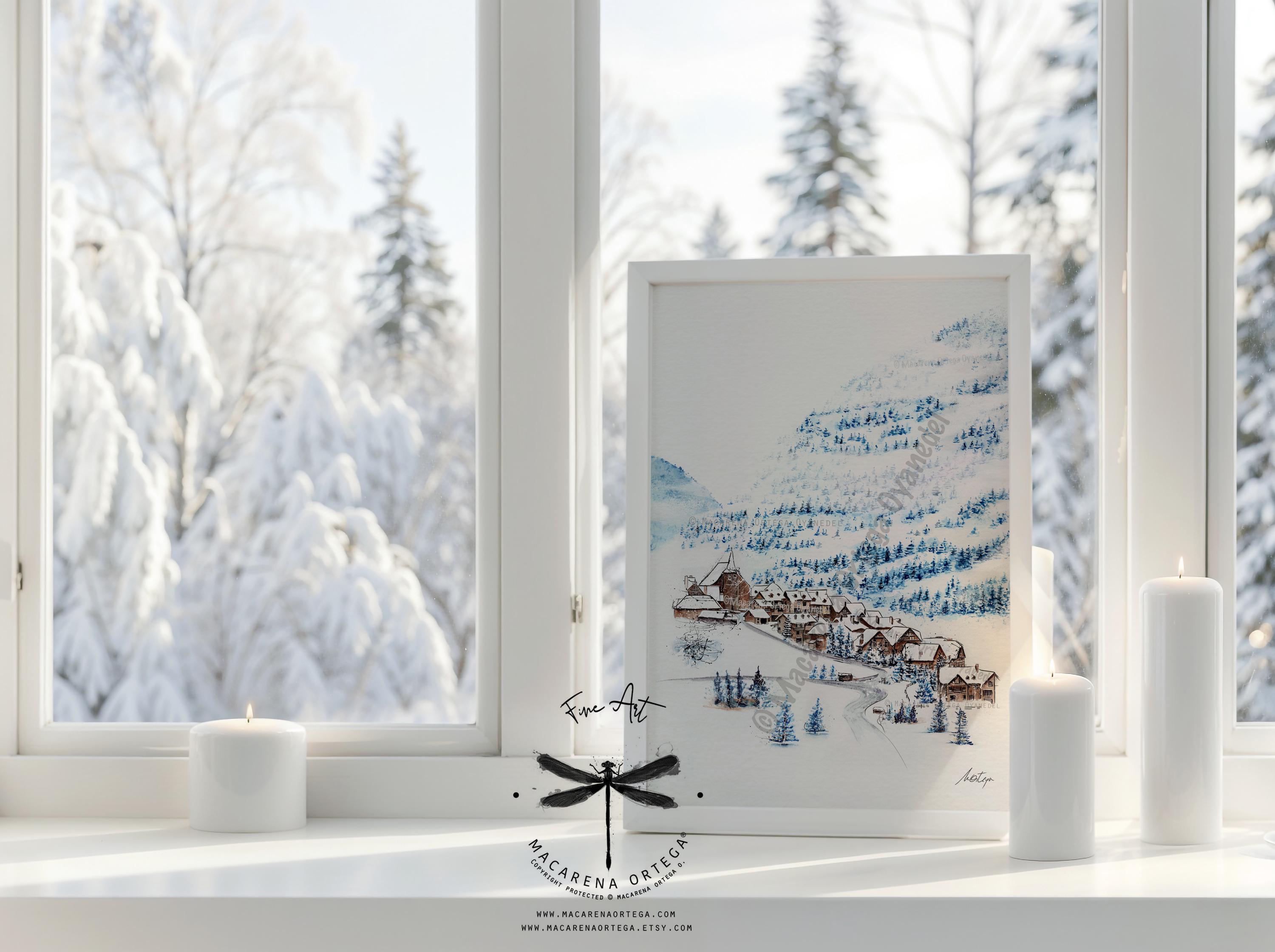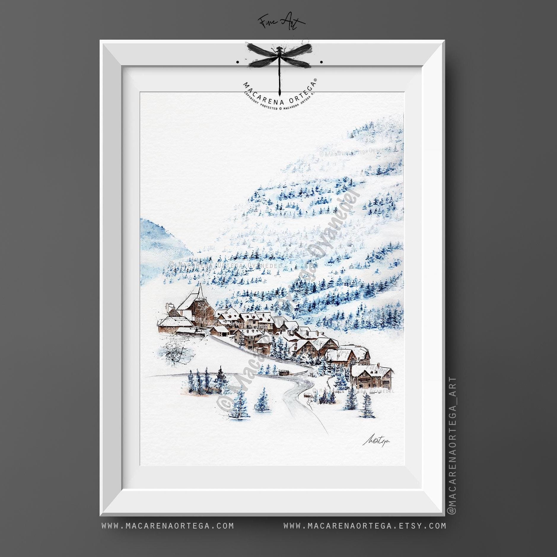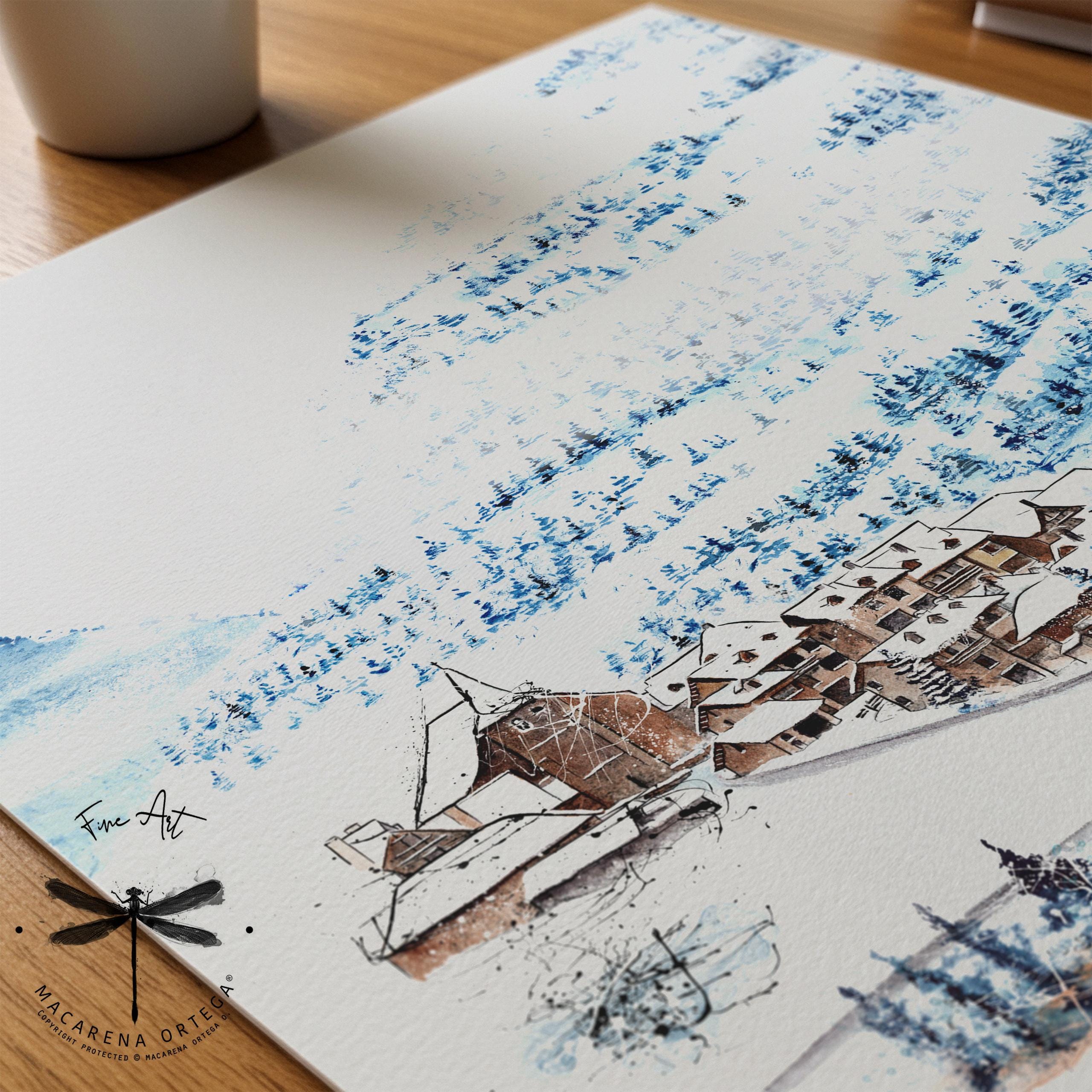 Watercolor of Tredós, a beautiful village in the Aran Valley, covered in snow. Captures the calm and magic of this Pyrenean winter scene.
