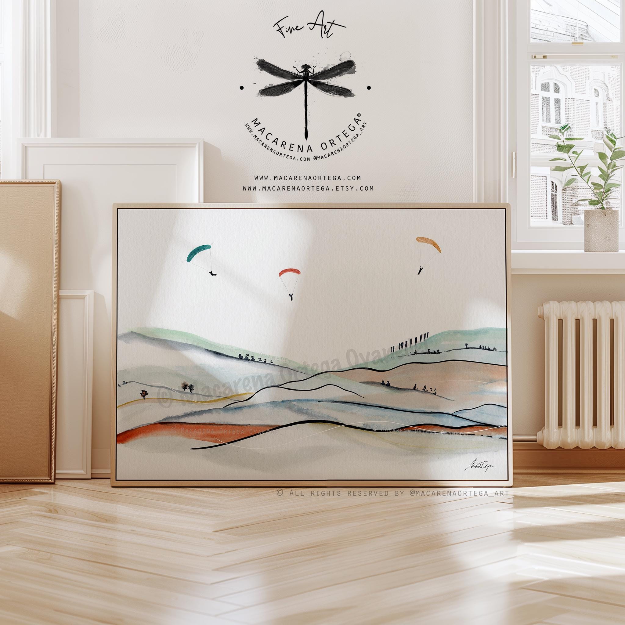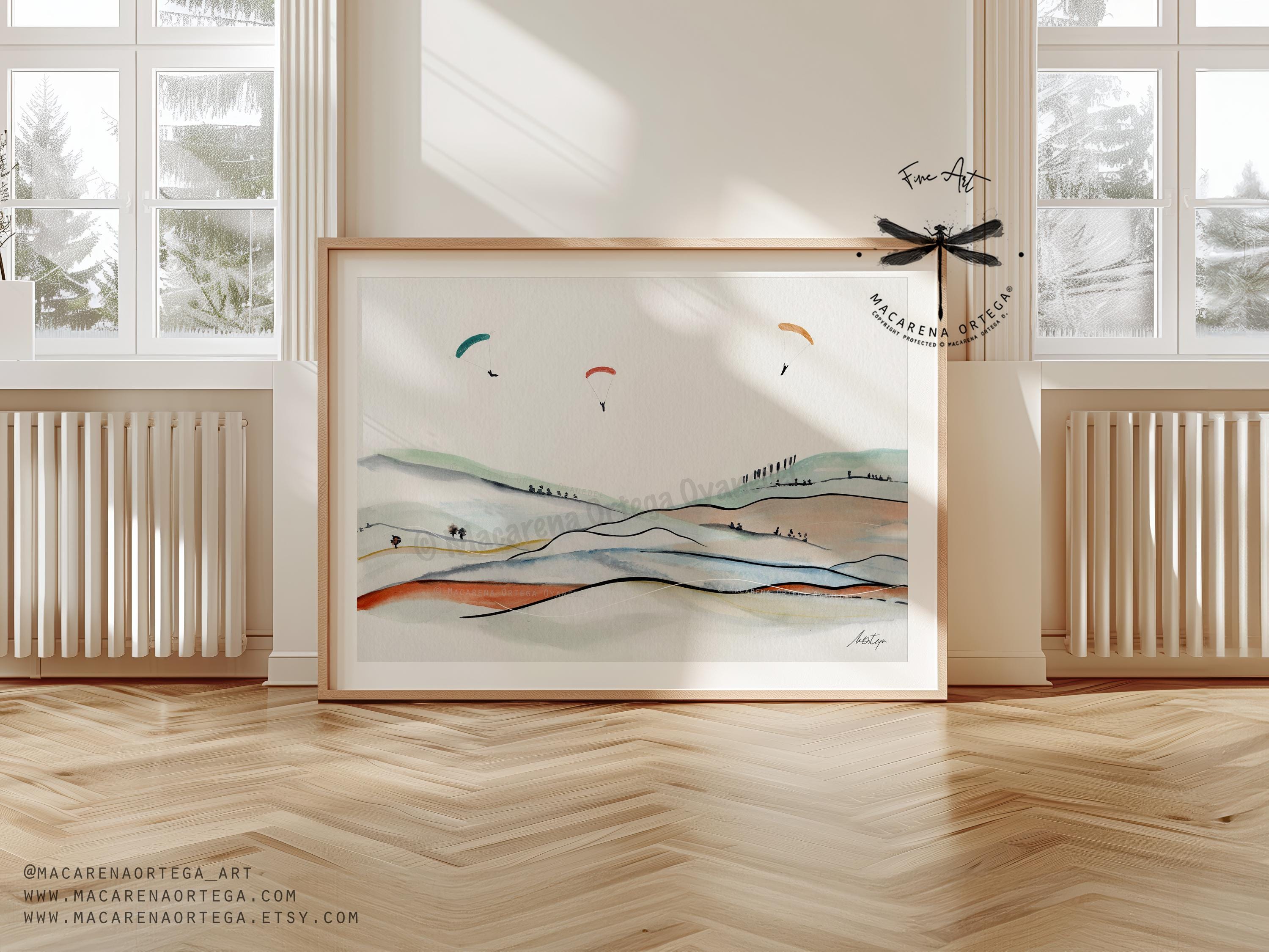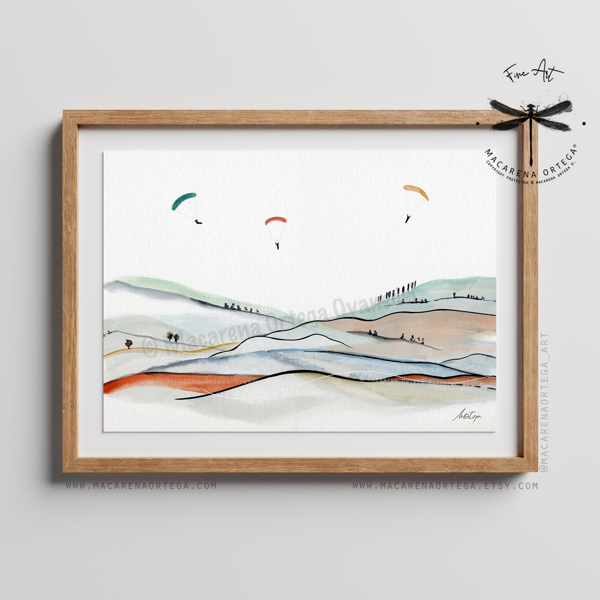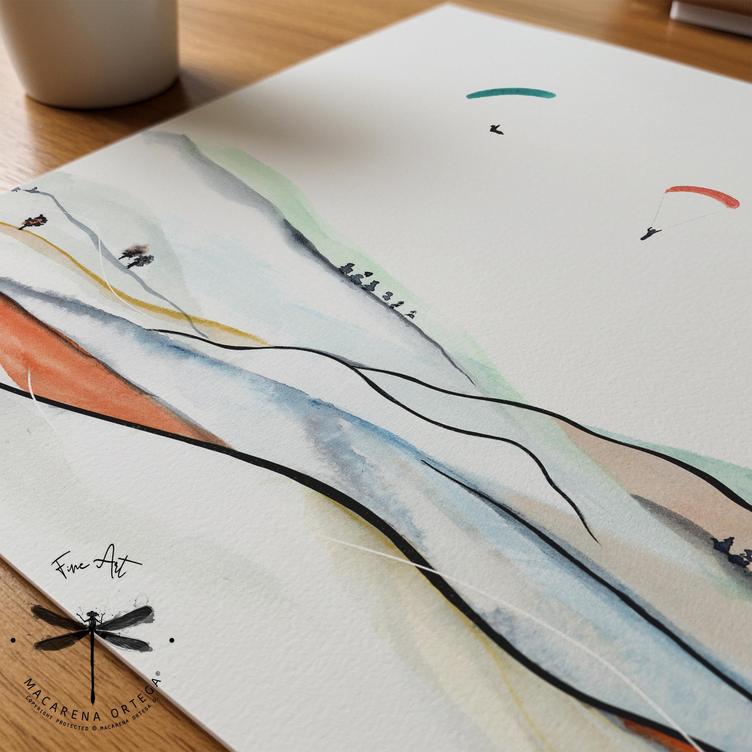 For paragliding lovers: movement and freedom in a minimalist landscape — a watercolor in rich, harmonious colors.