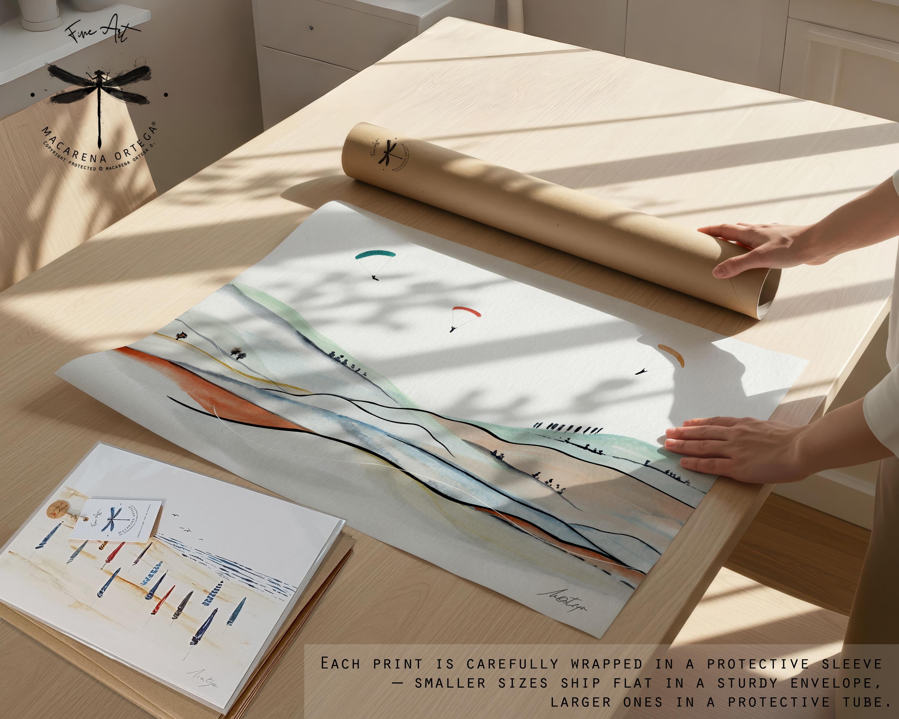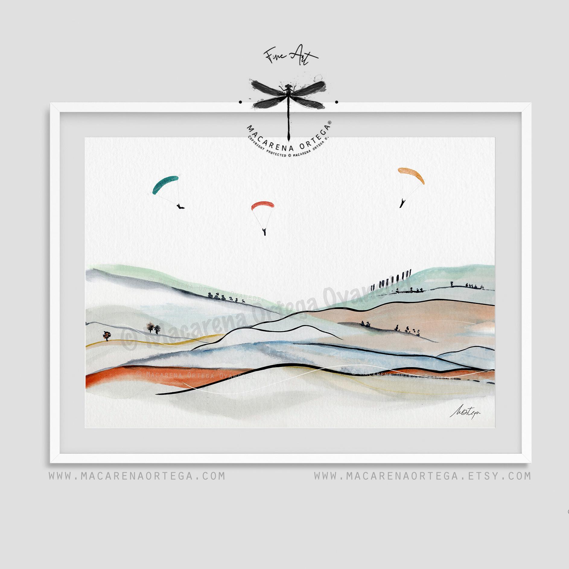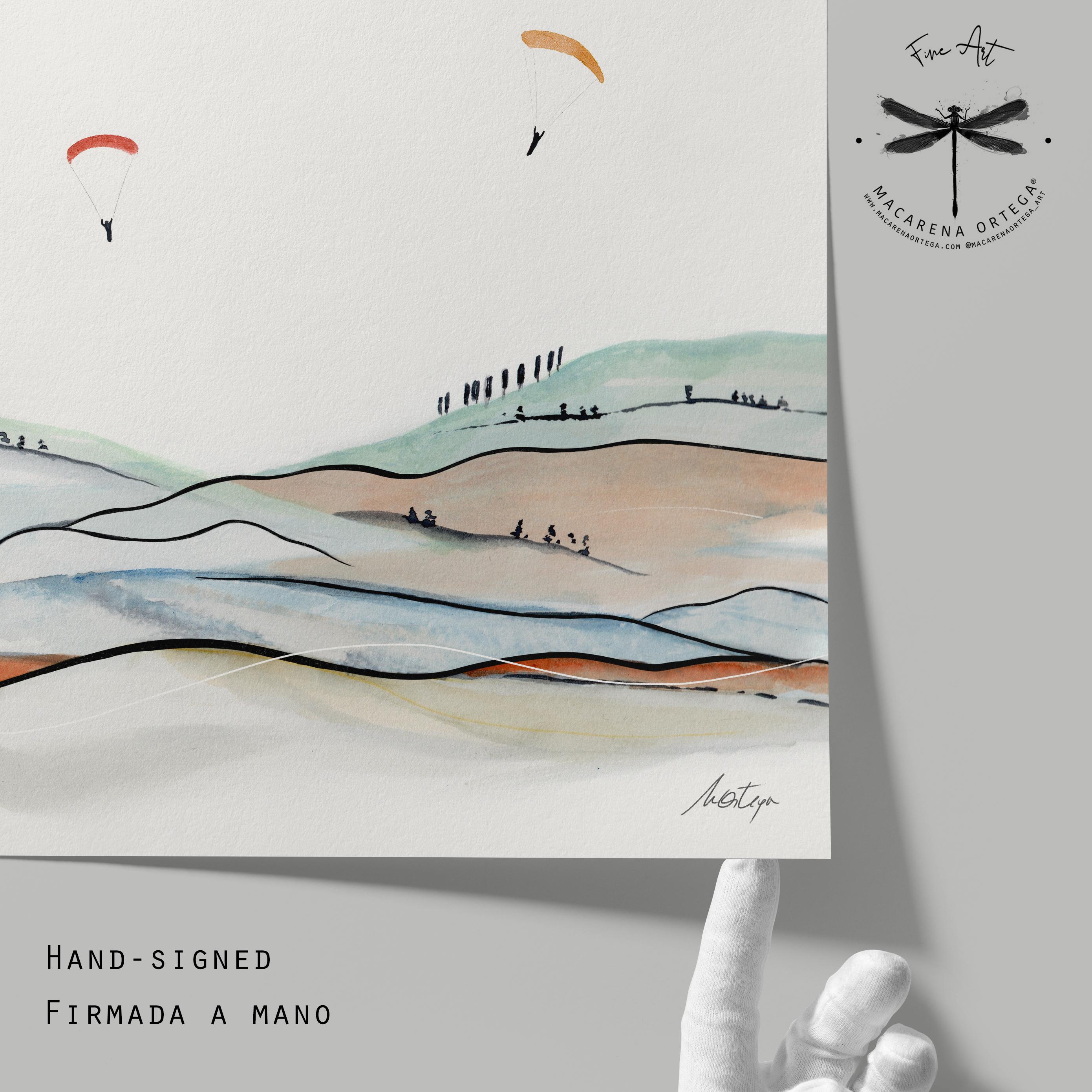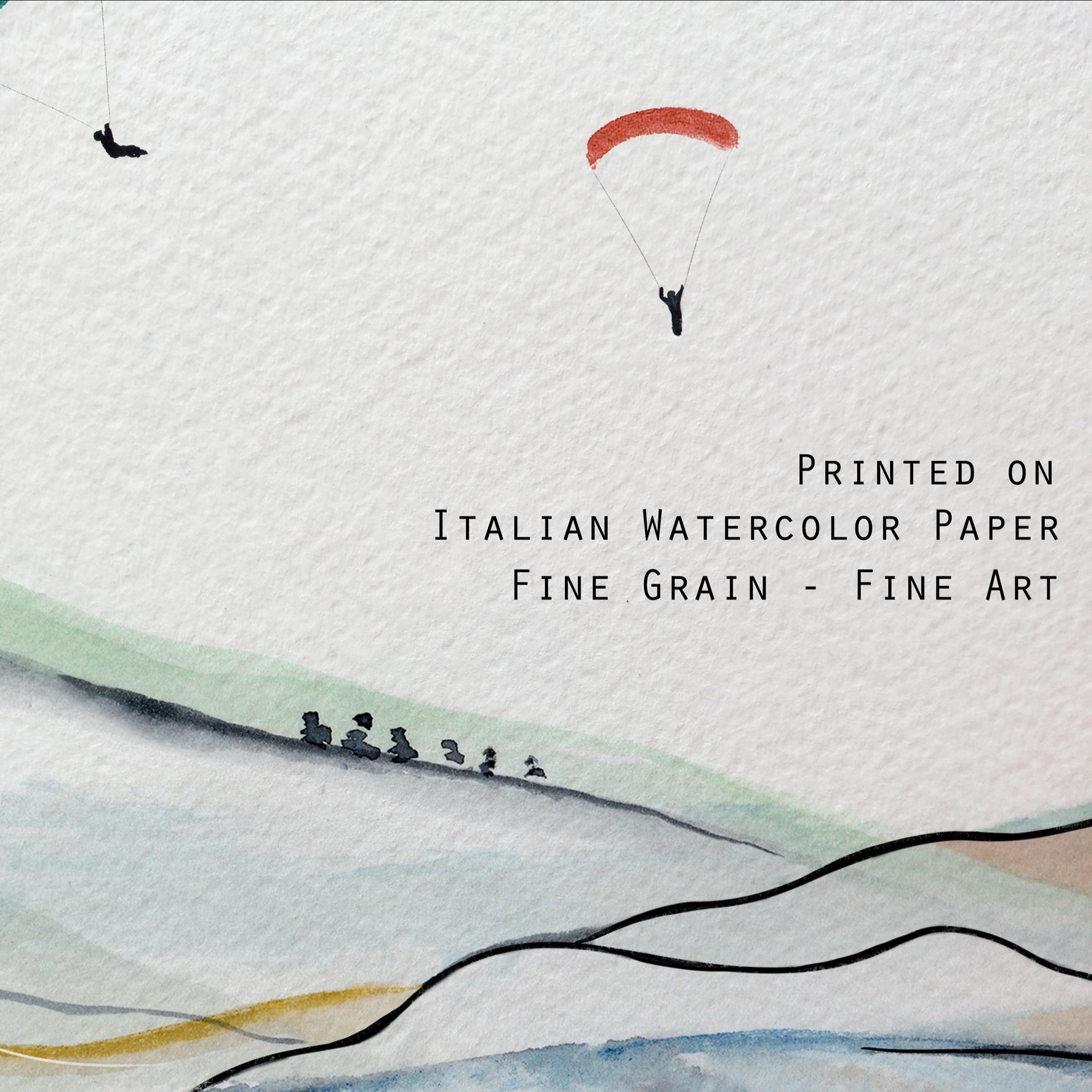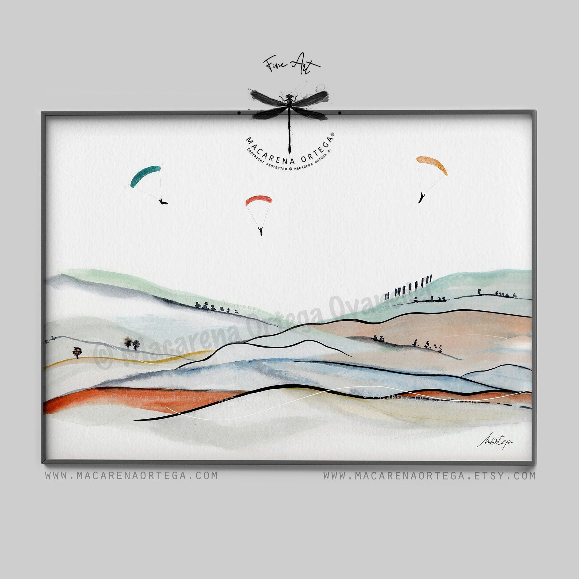 For paragliding lovers: movement and freedom in a minimalist landscape — a watercolor in rich, harmonious colors.