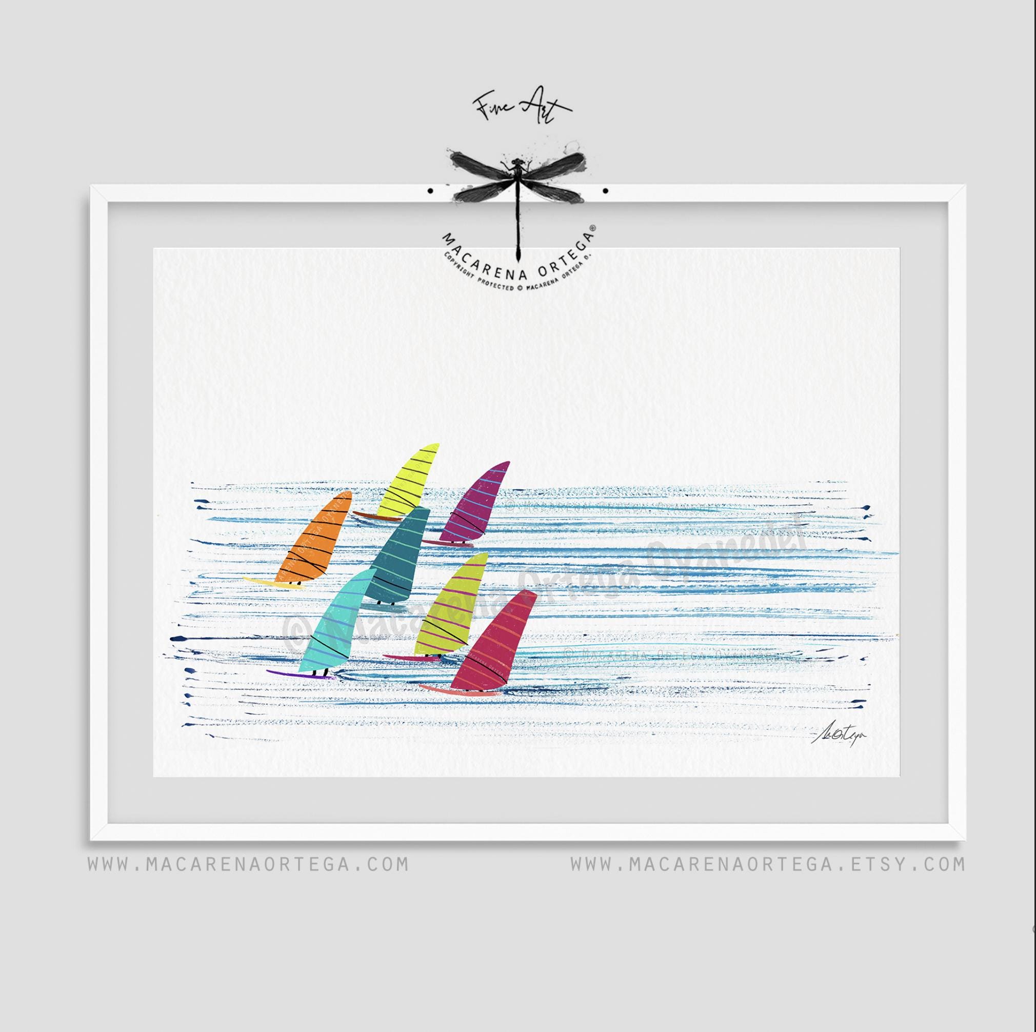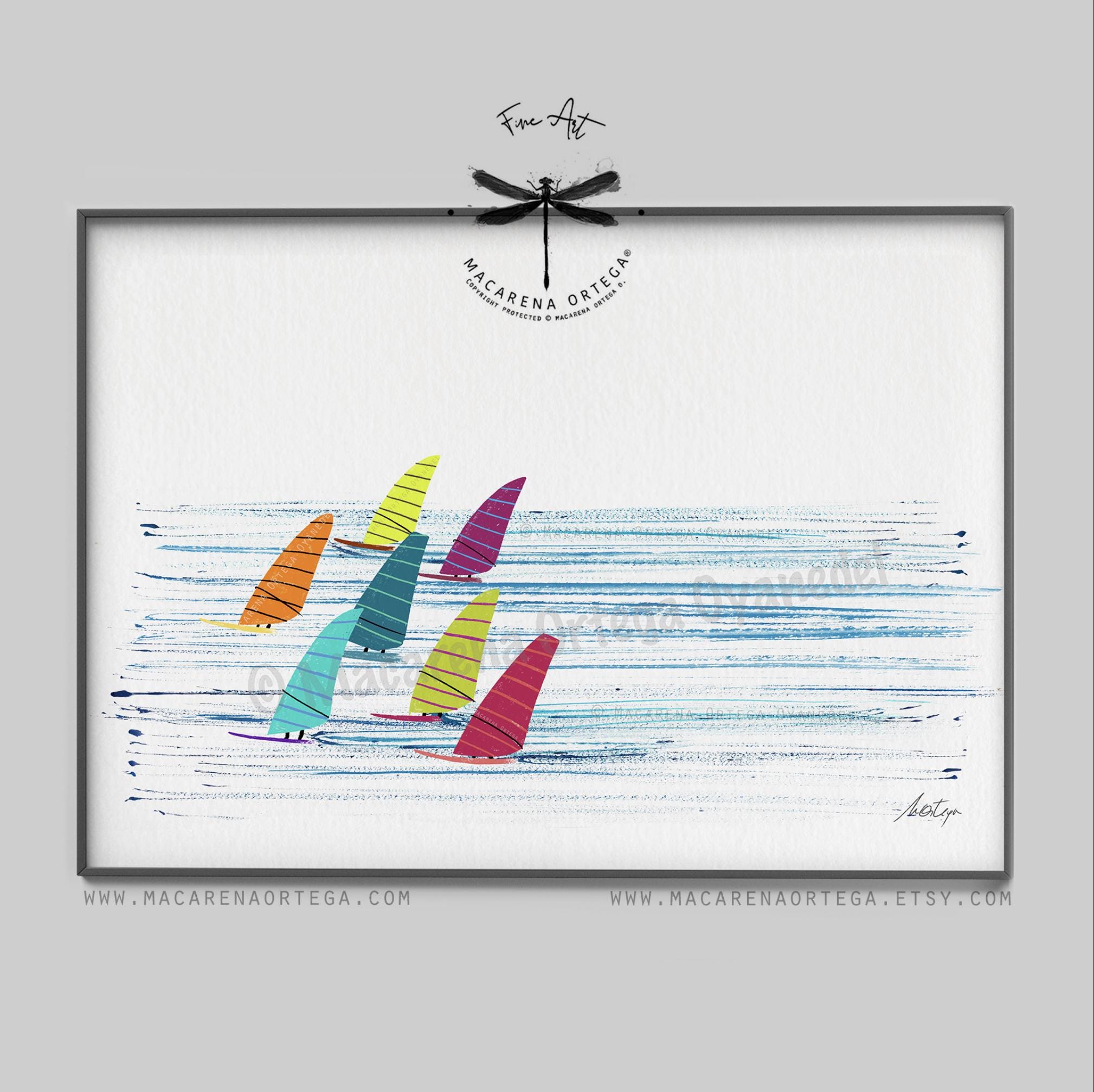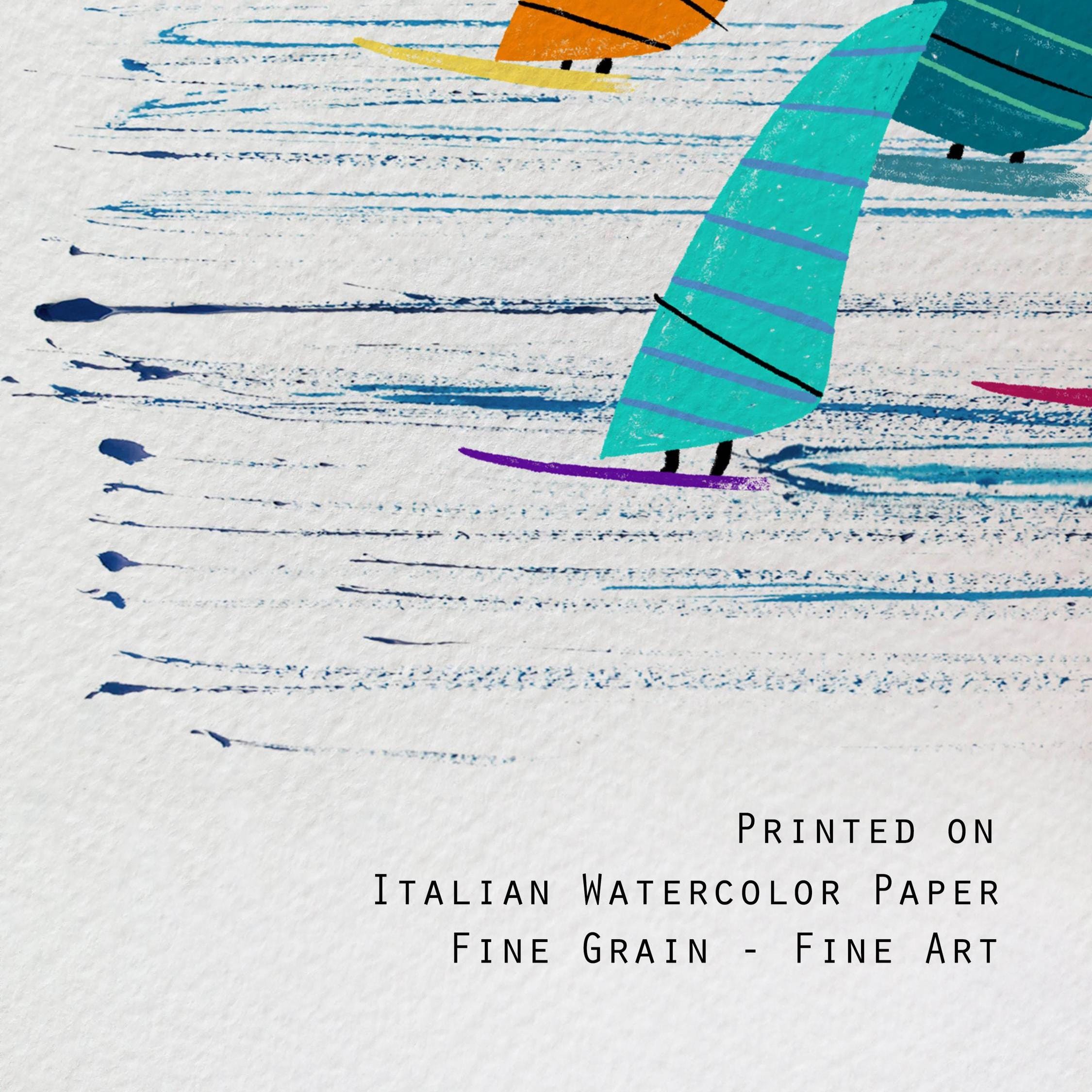 A minimalist abstract watercolor inspired by a colorful windsurf regatta, capturing the vibrant rhythm of sails racing across the sea.