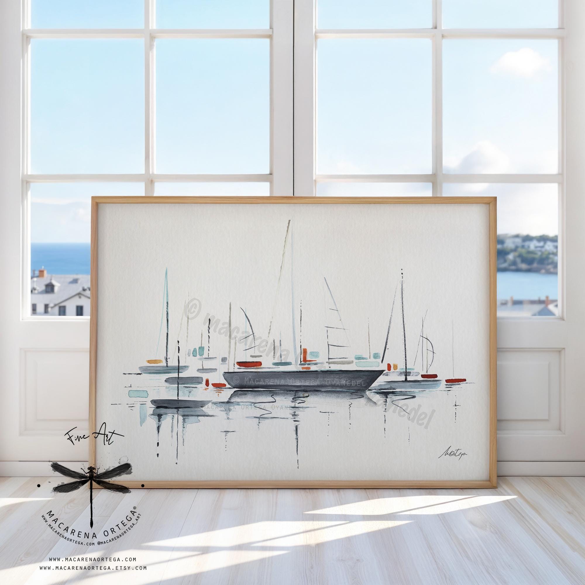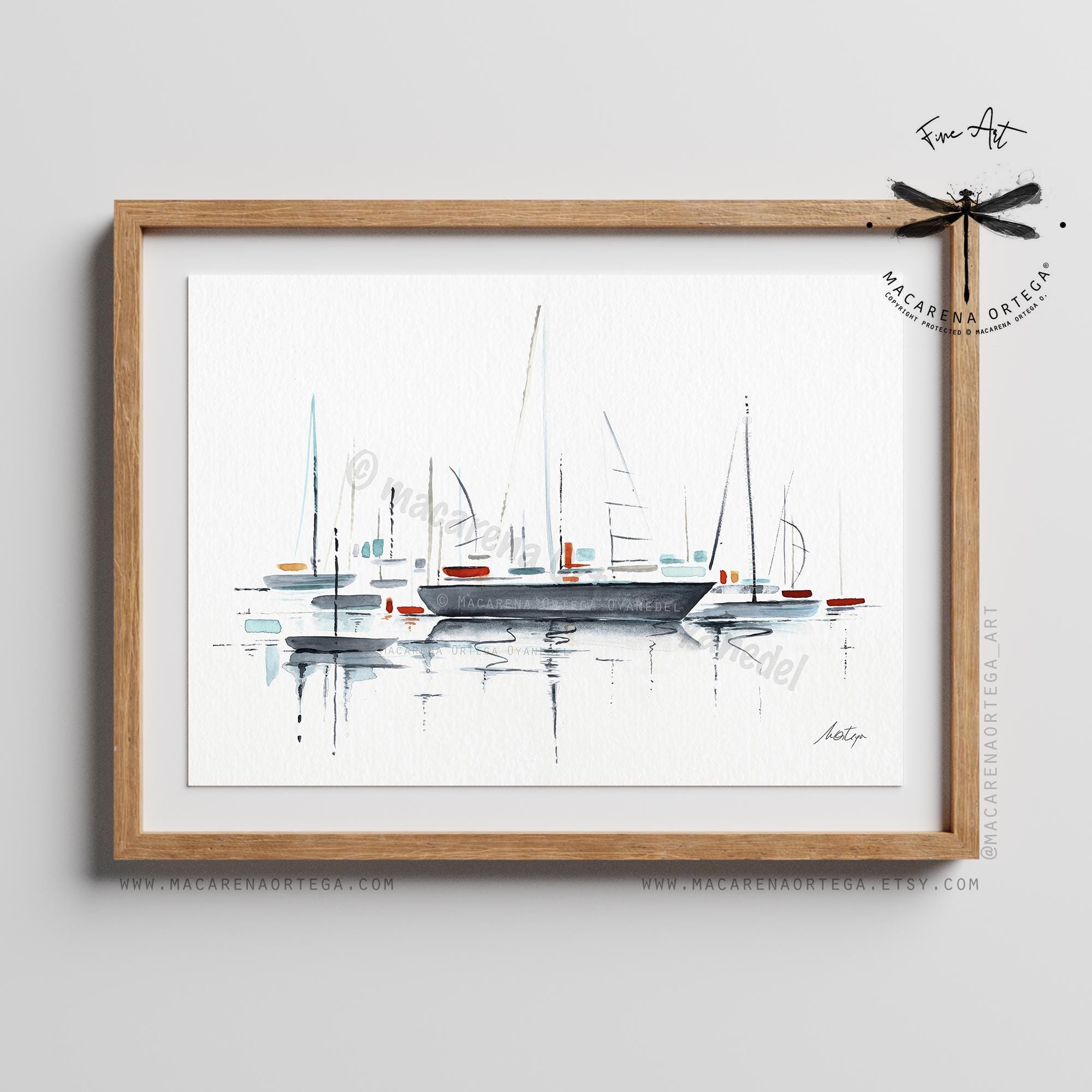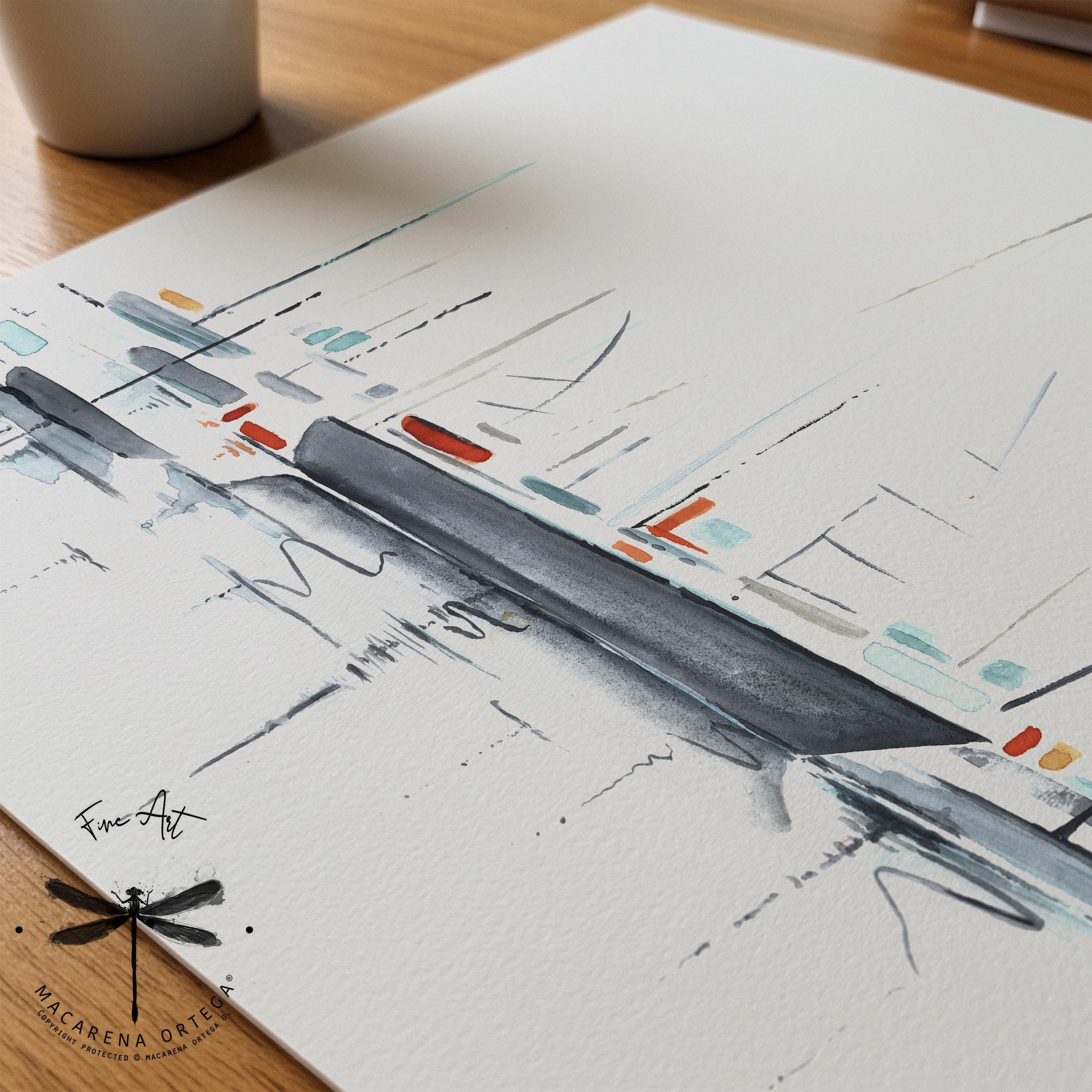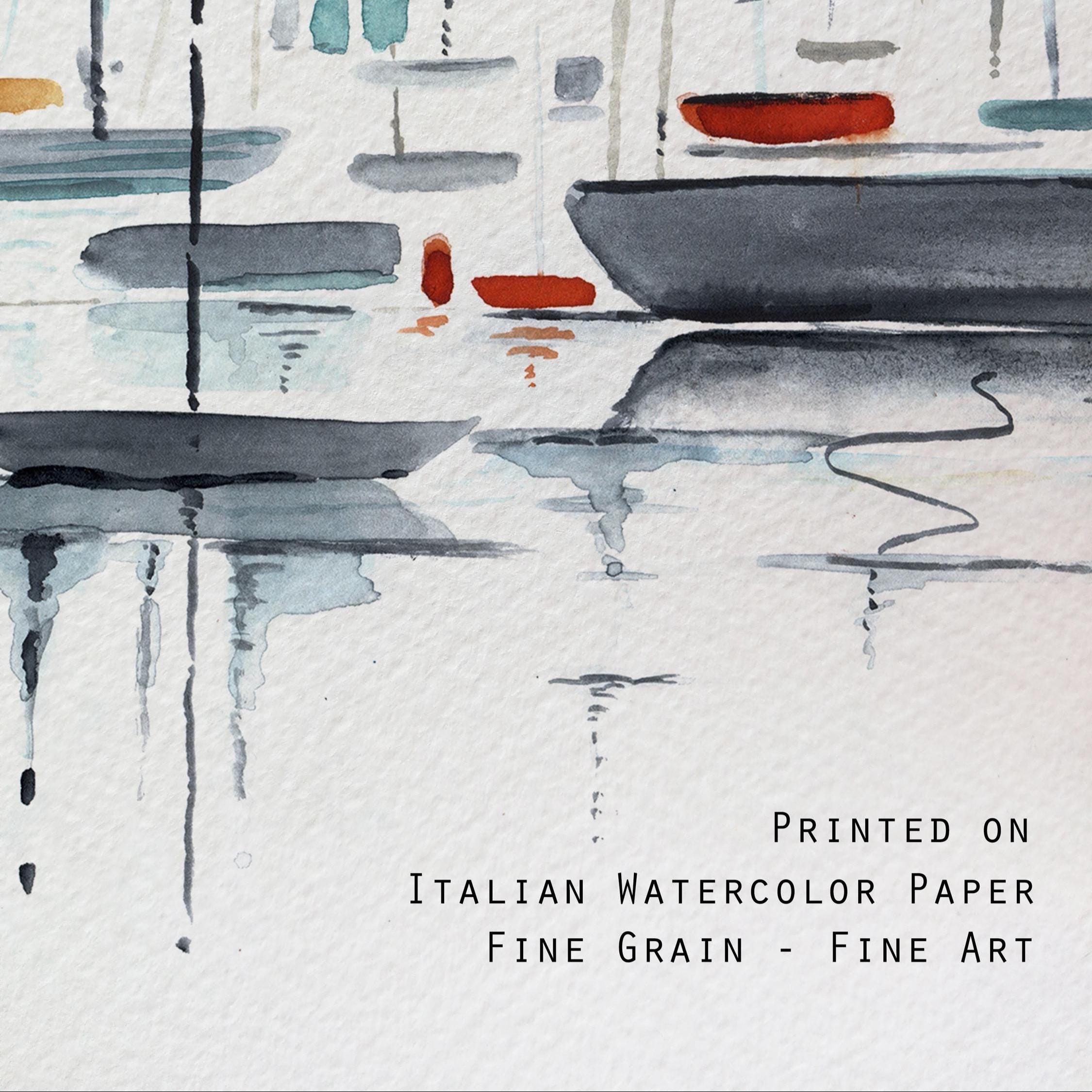 Minimal sailboats in port — a watercolor in modern, elegant colors. I had so much fun painting this one; it was a challenge to capture everything using simple shapes.