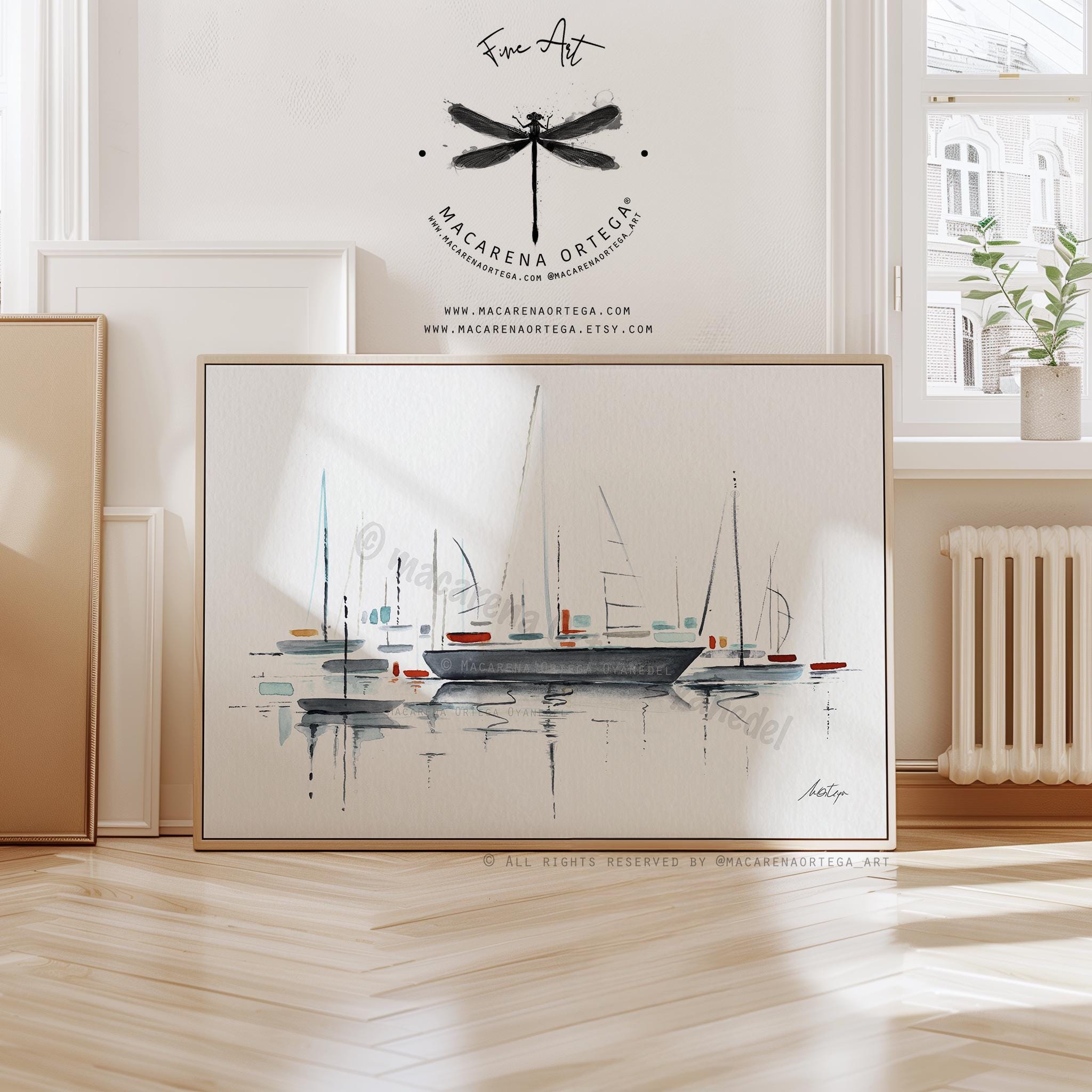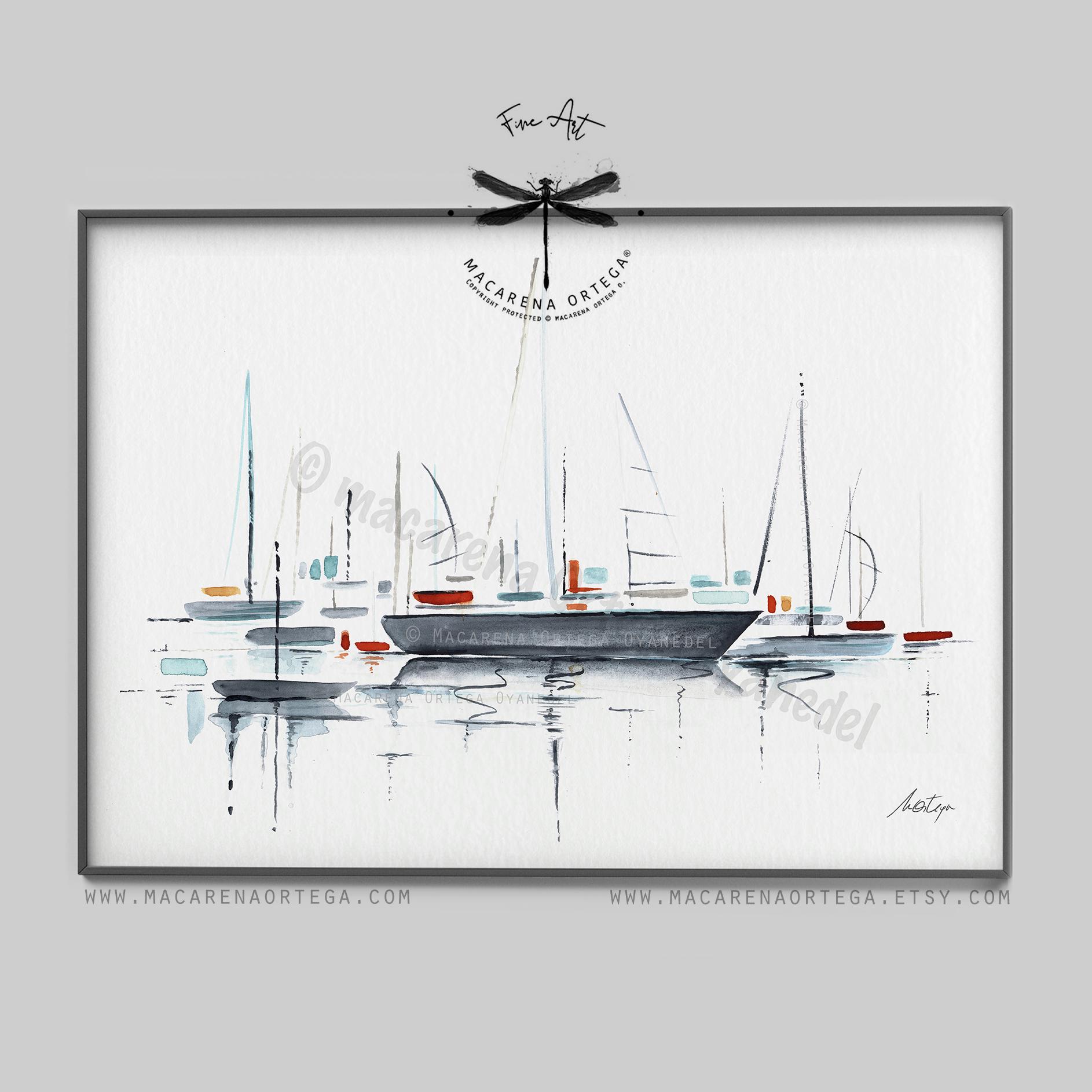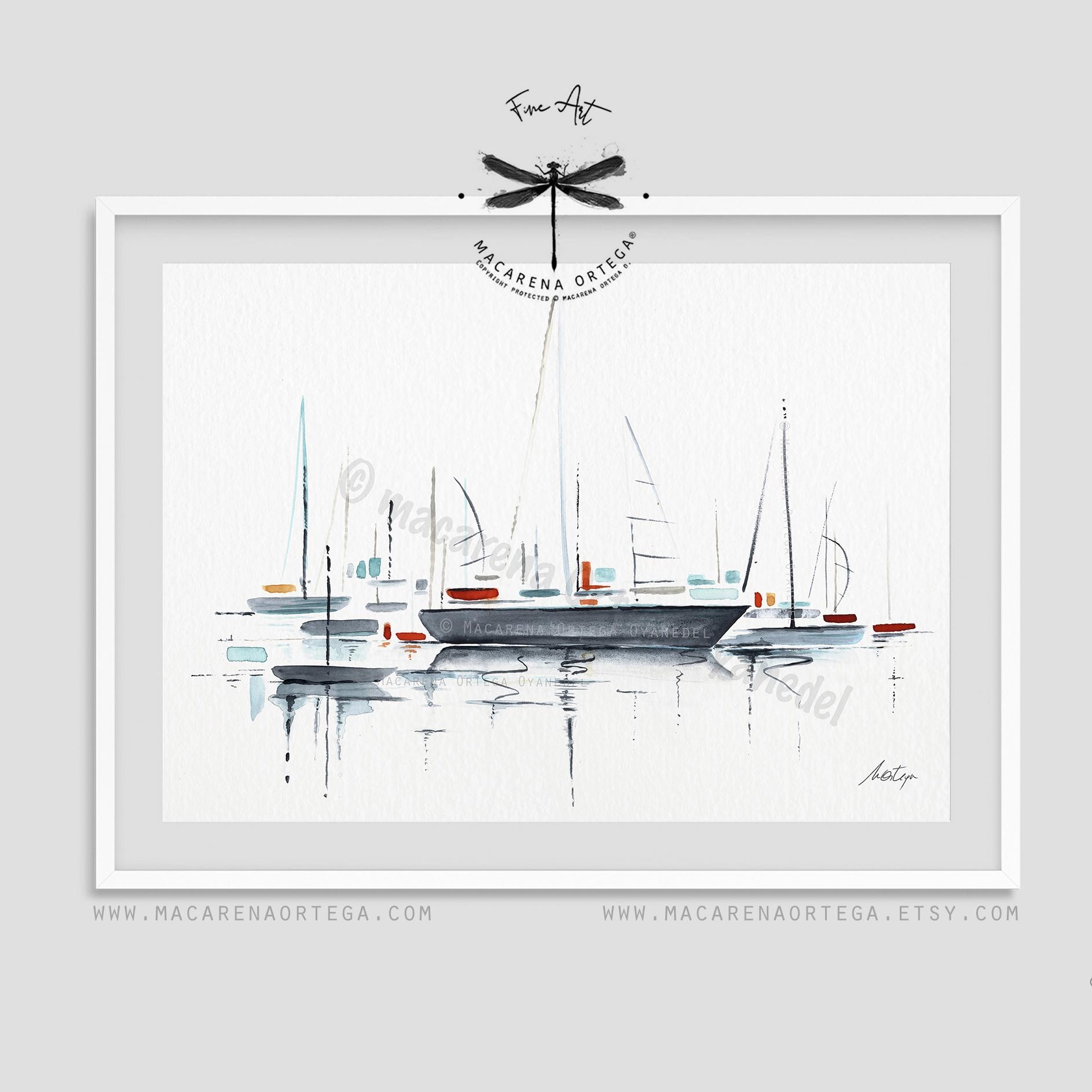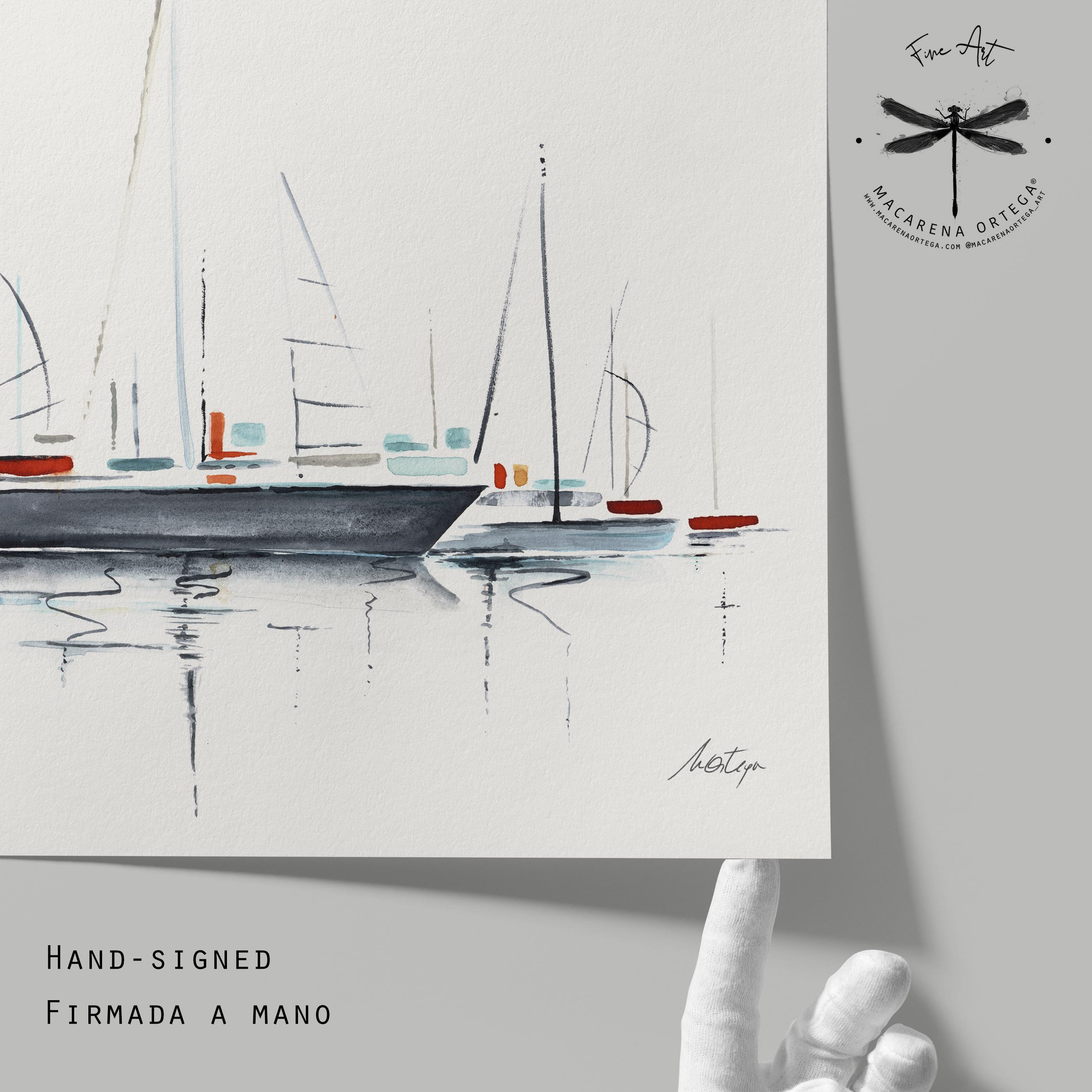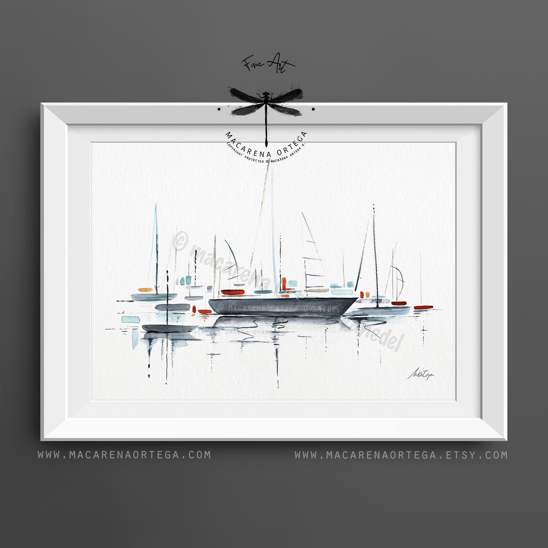 Minimal sailboats in port — a watercolor in modern, elegant colors. I had so much fun painting this one; it was a challenge to capture everything using simple shapes.
