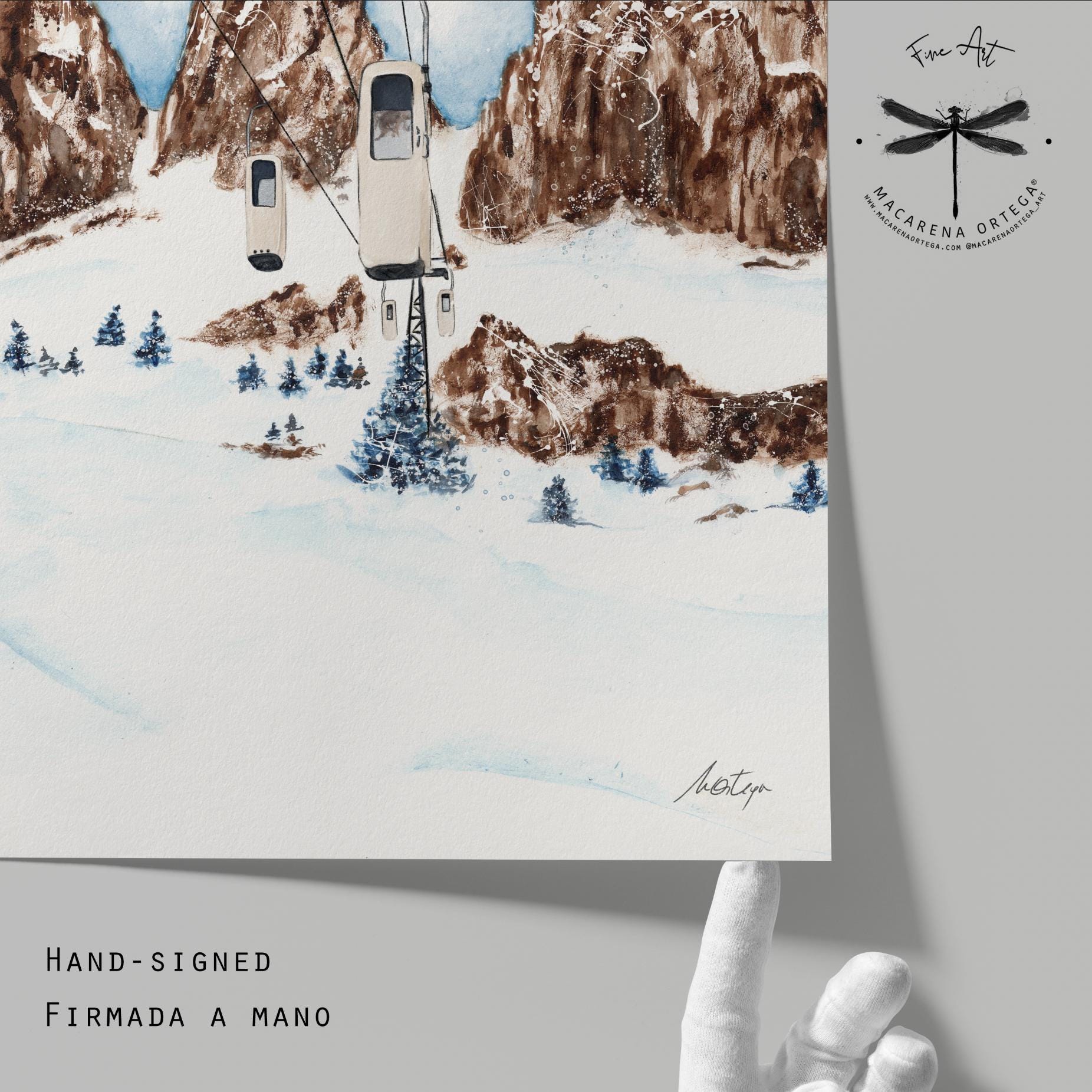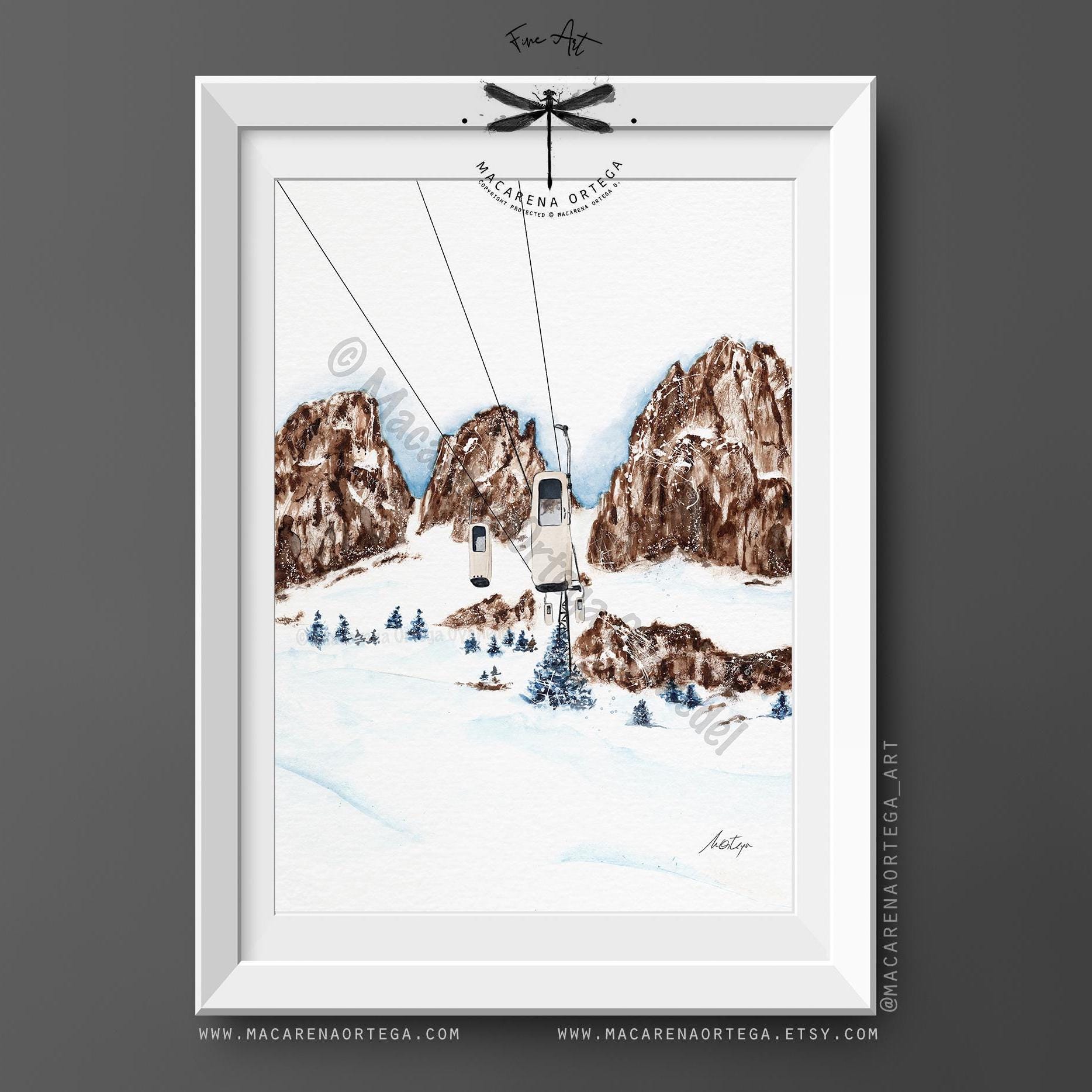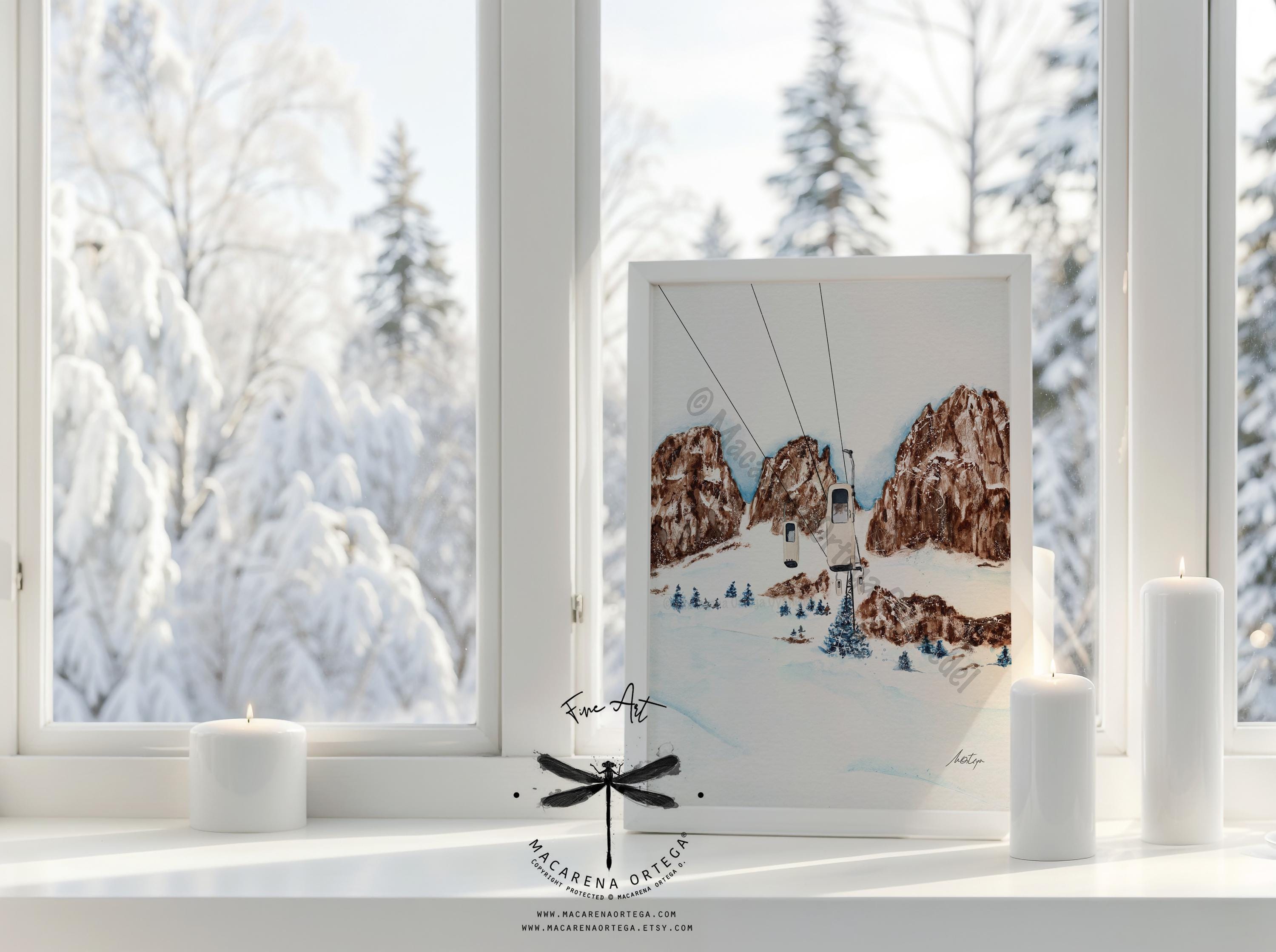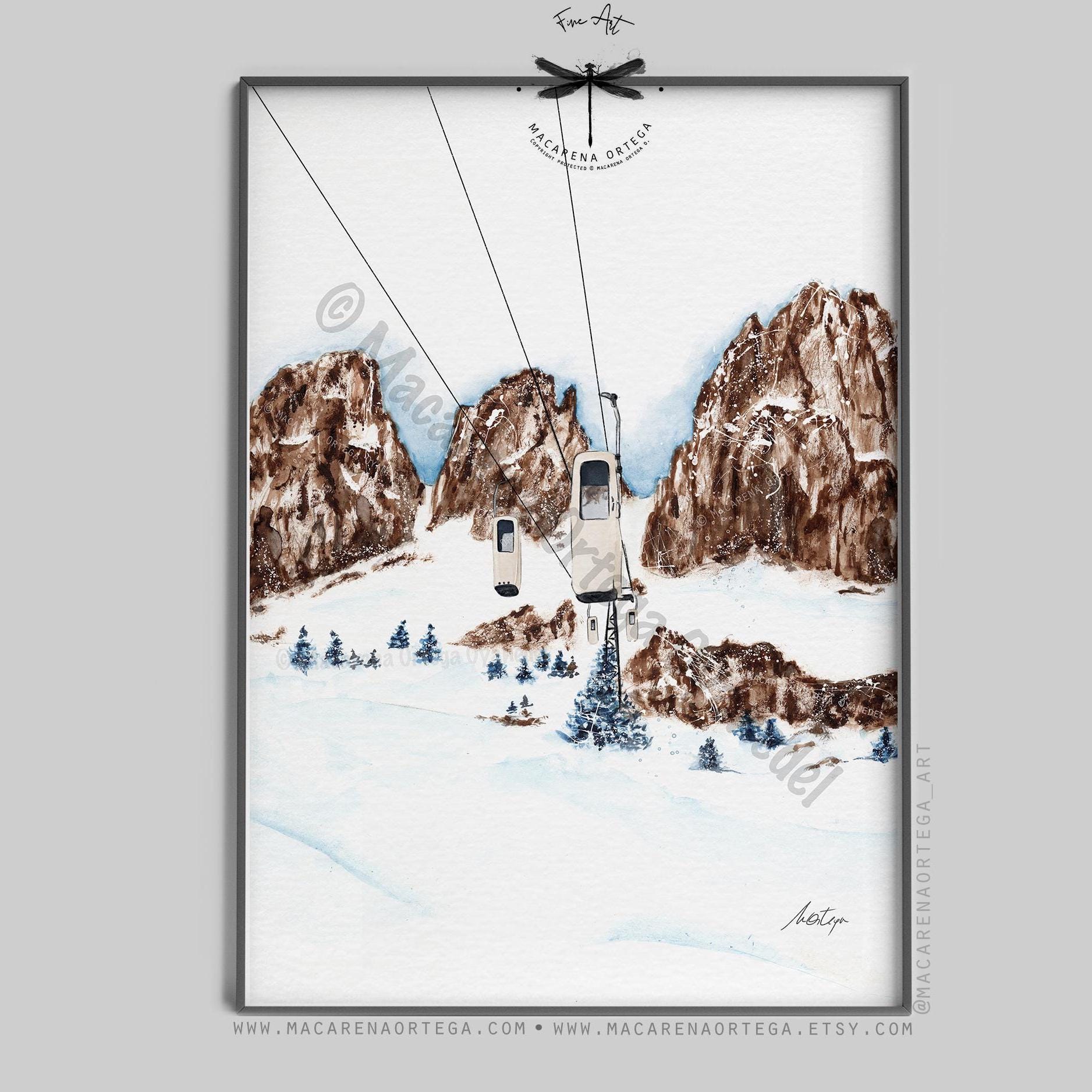 Watercolor inspired by the historic Forcella Sassolungo cable car — the first in the Dolomites, gliding between golden rocks and snow. A tribute to the Alpine spirit.