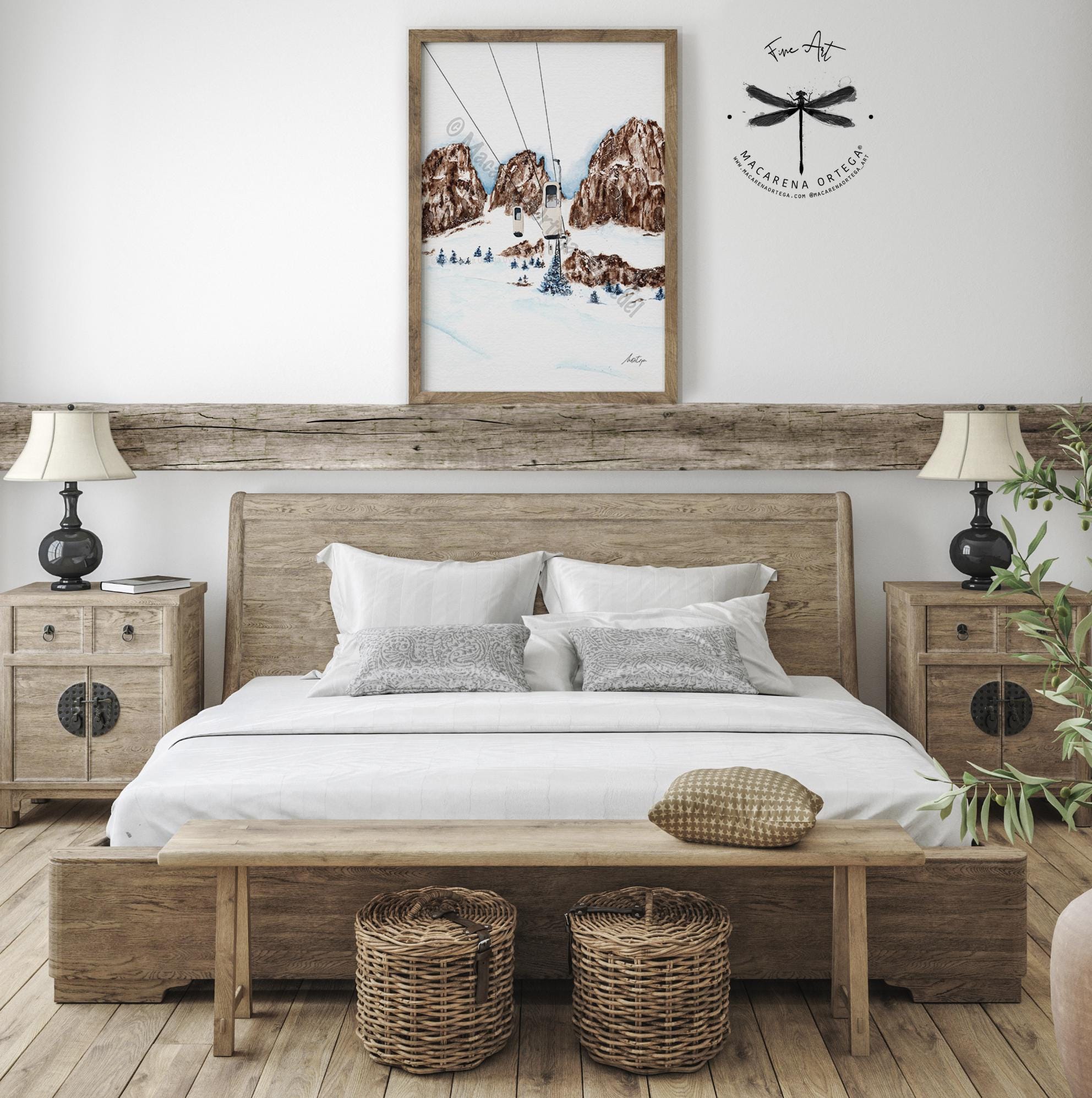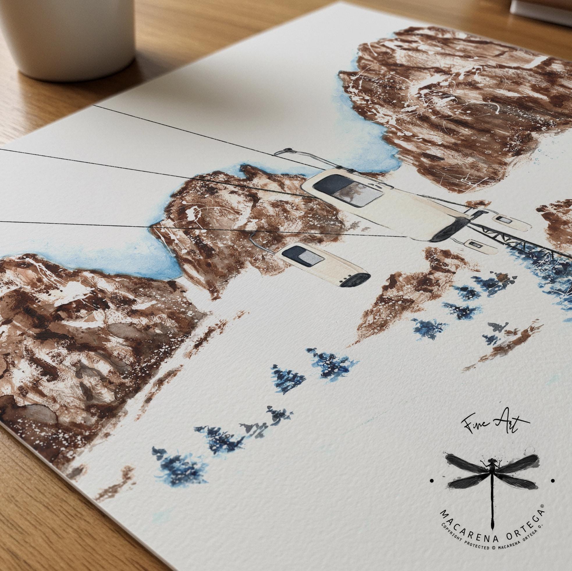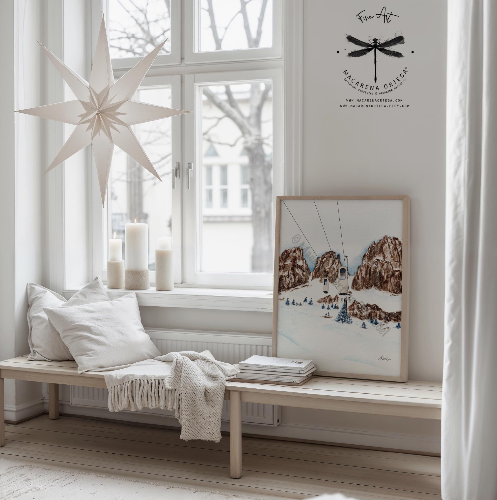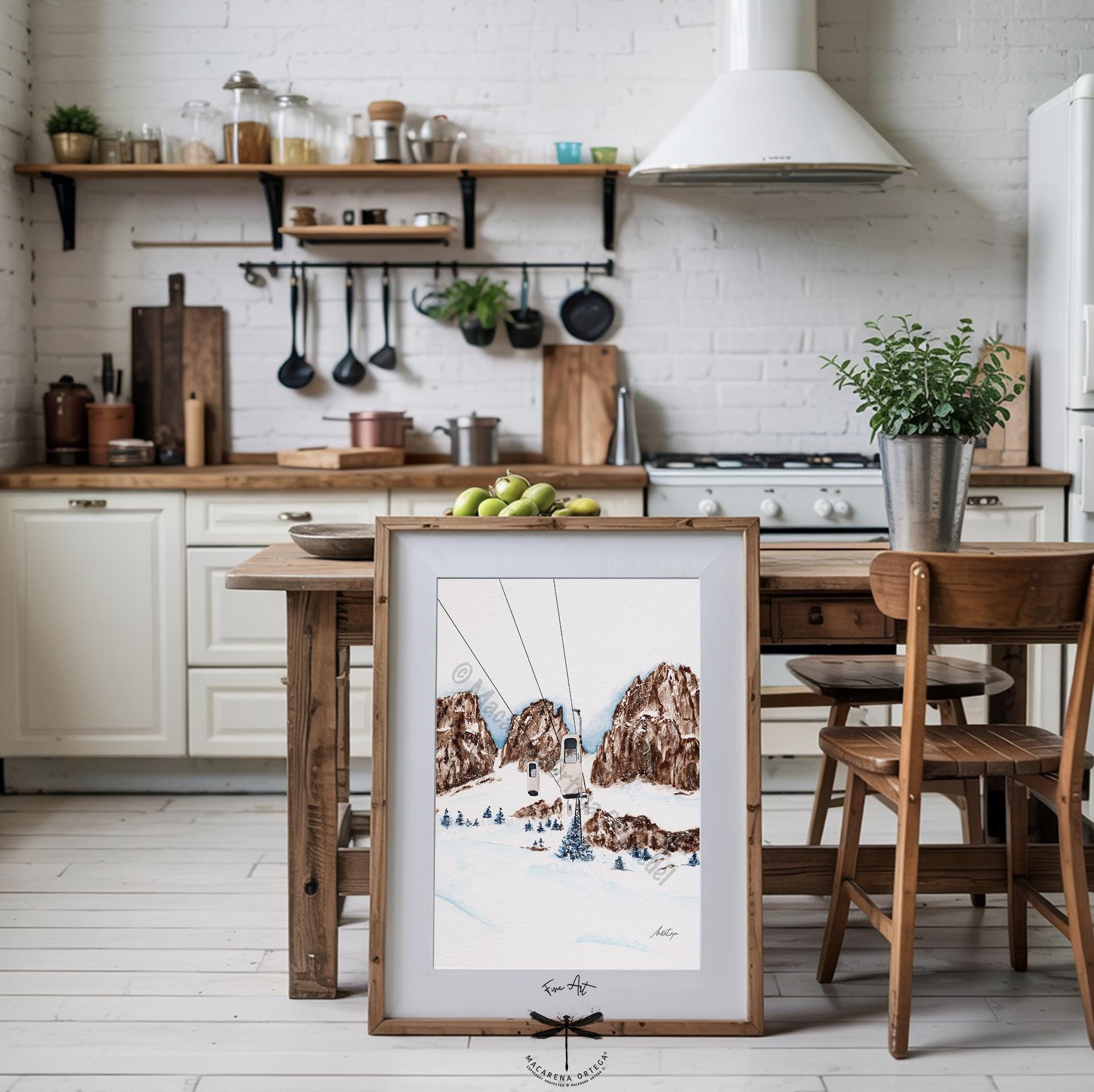 Watercolor inspired by the historic Forcella Sassolungo cable car — the first in the Dolomites, gliding between golden rocks and snow. A tribute to the Alpine spirit.