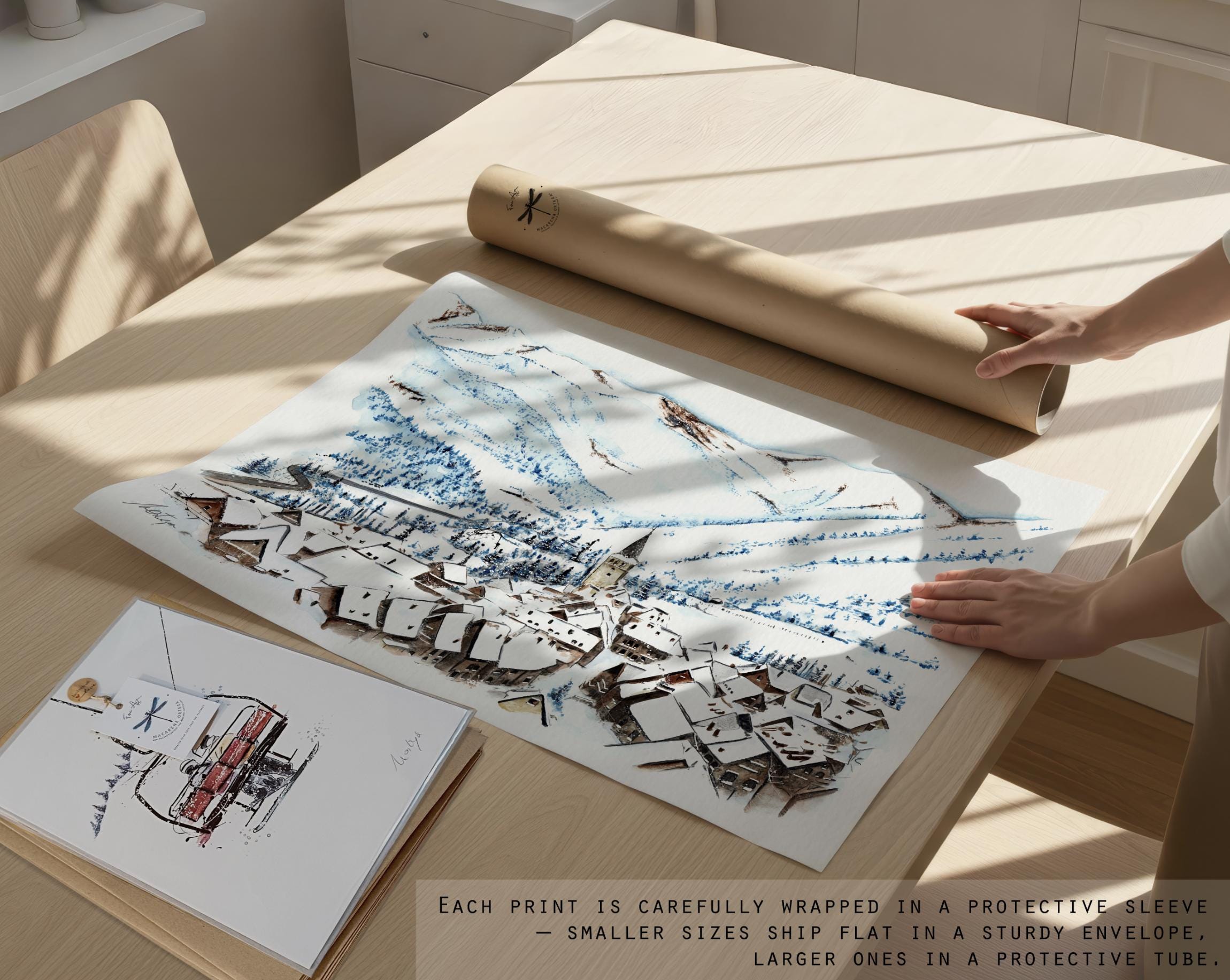 Garòs Watercolor Art Print | Valle de Aran Pyrenees, Mountain Town Painting Ski Center Spain, Winter Village Pirineos Print | Ski Art | N147