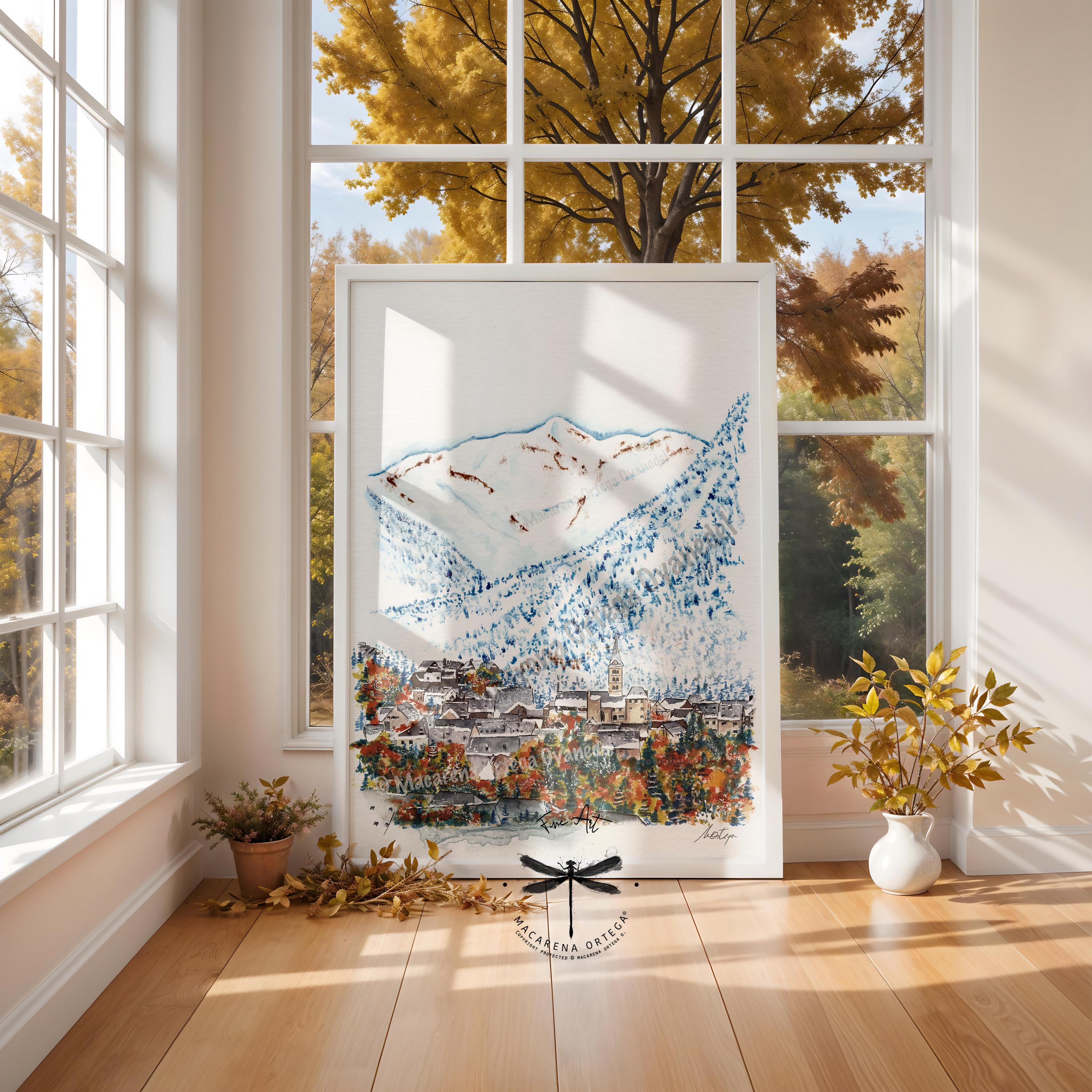Arties, Val d’Aran — a Pyrenean village between autumn and the first snowfalls, with Montarto rising in the background, captured in watercolor.