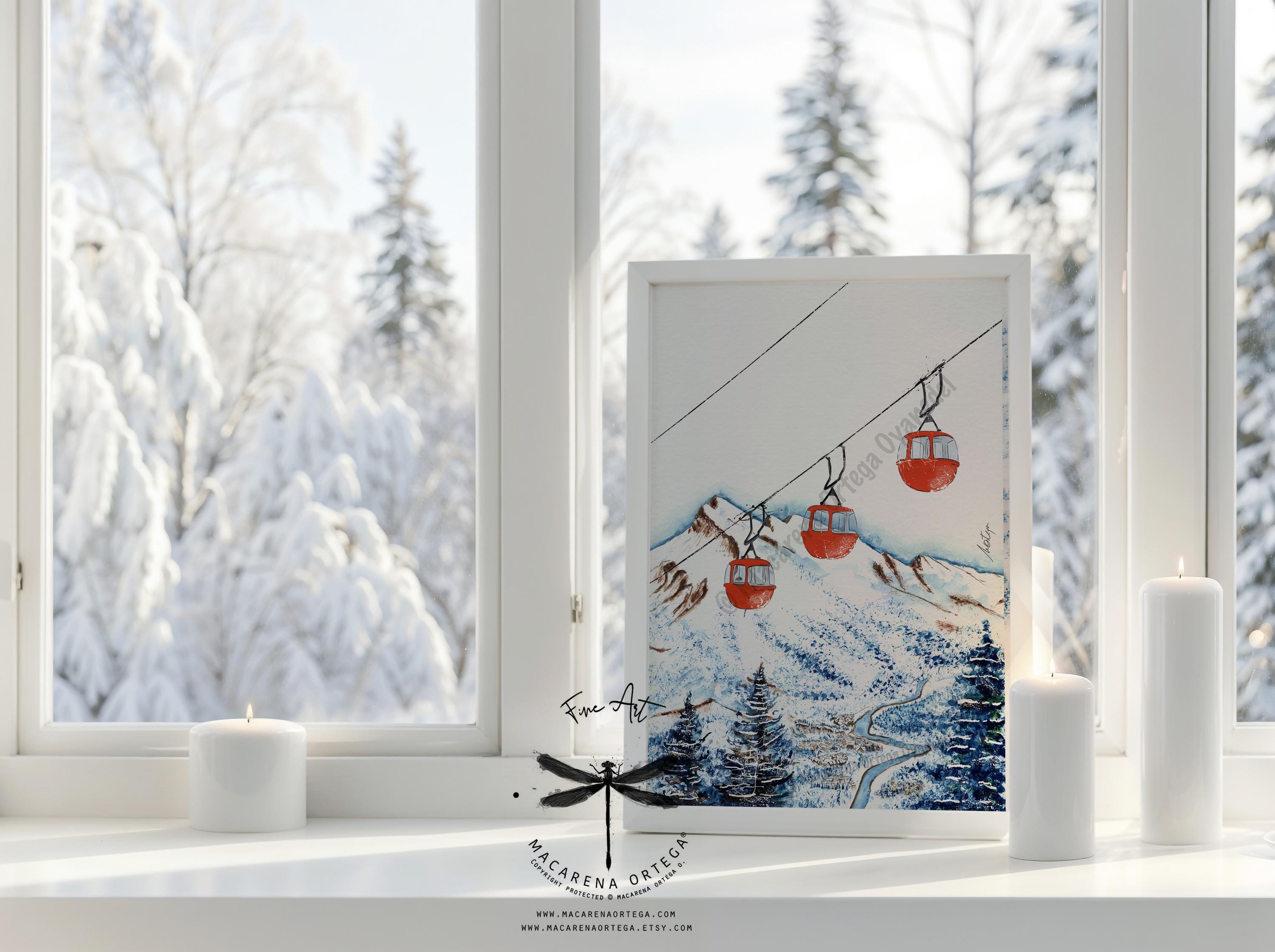 Watercolor of a retro chairlift in Norquay, where each ride through the snow brings back the charm of classic skiing.