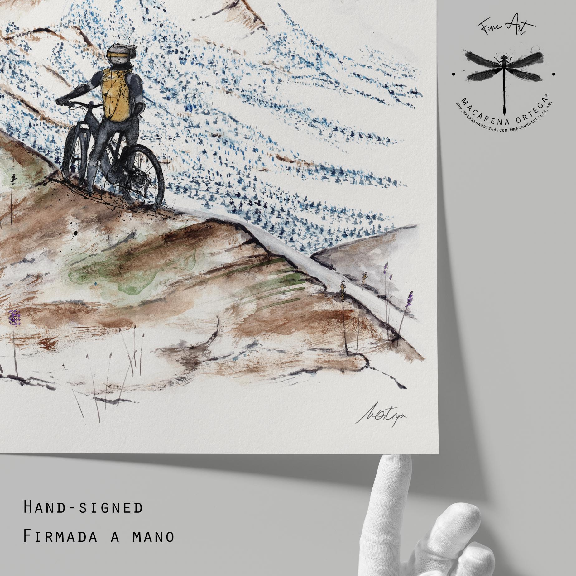 Watercolor capturing the moment an enduro rider reaches the summit, gazing at the mountain and the endless views from above.
