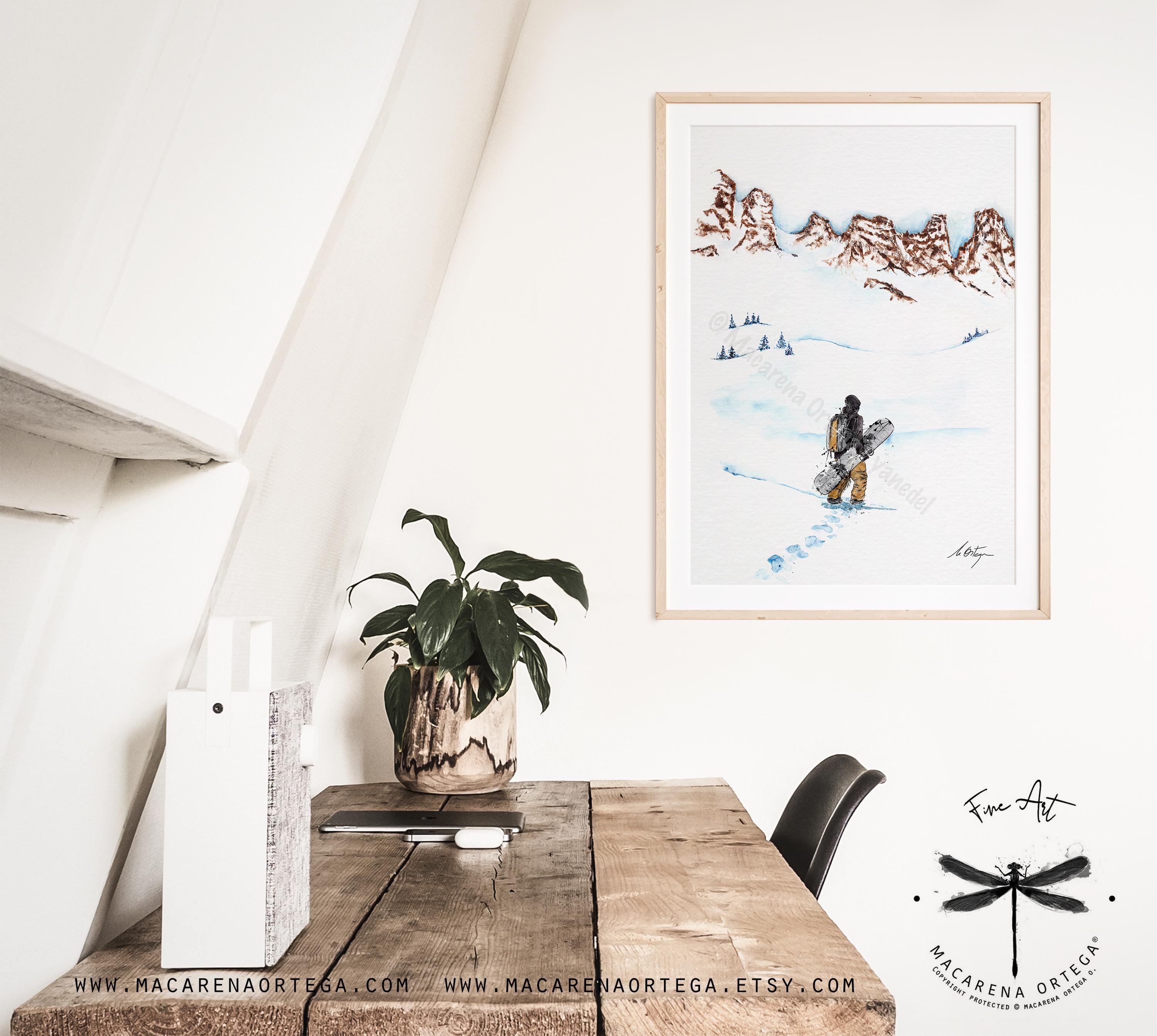 Watercolor of a Splitboard day in the mountains, chasing freedom, vastness, and unexplored places.