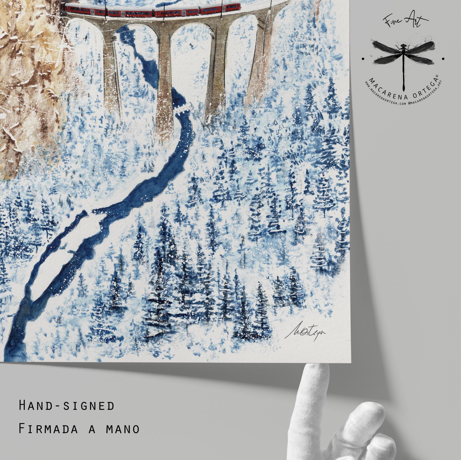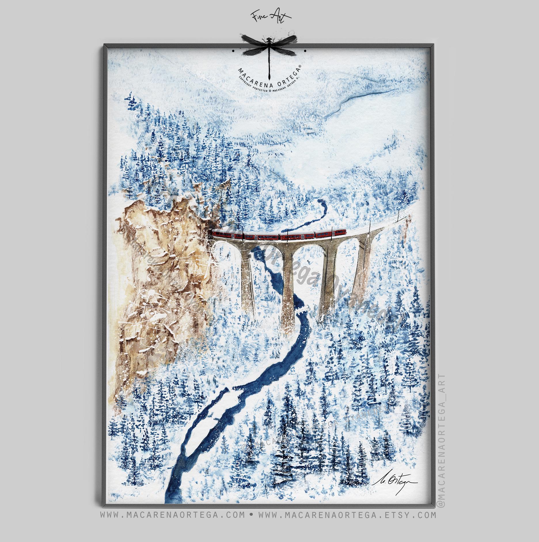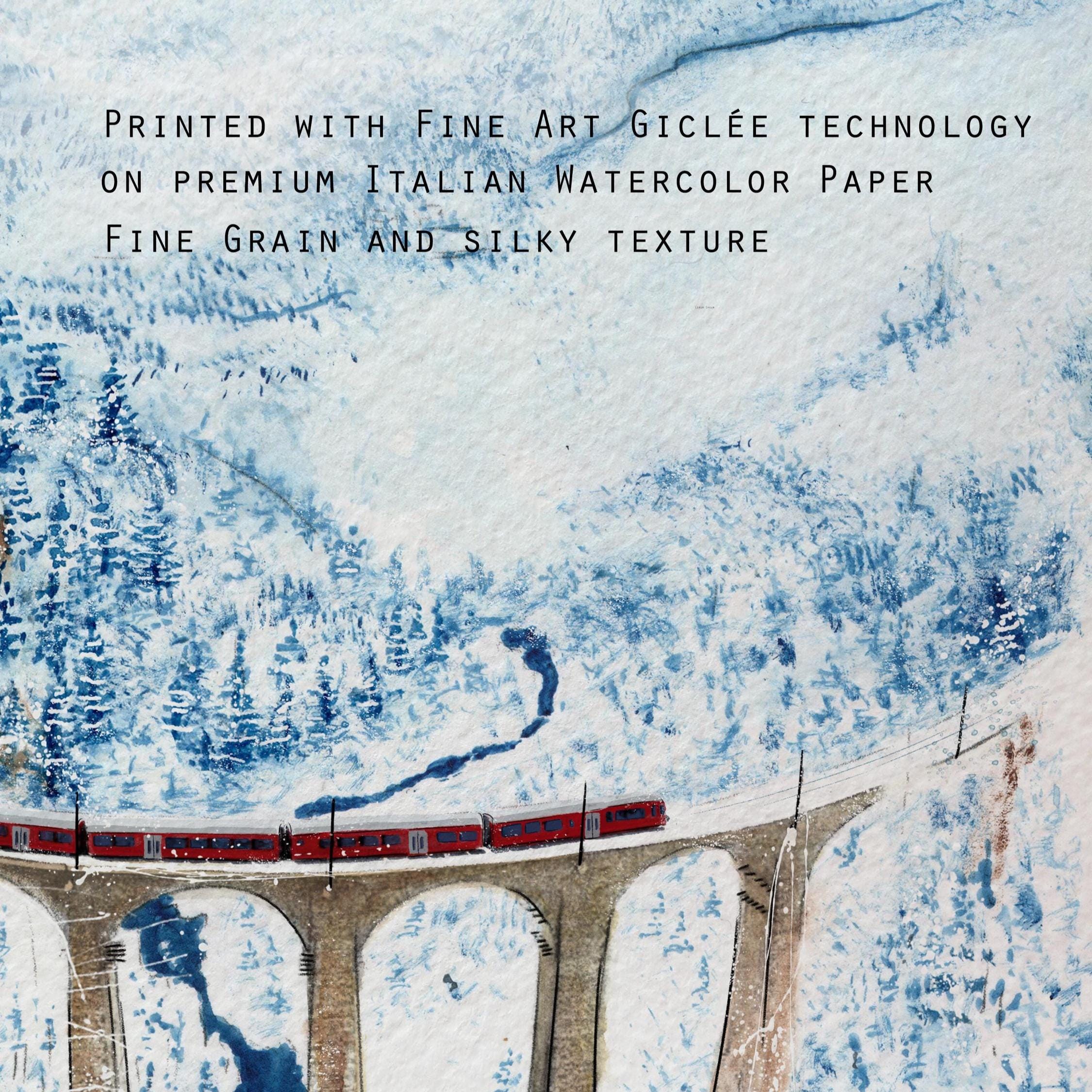 Watercolor inspired by the Glacier Express crossing the legendary Landwasser Viaduct, one of the most breathtaking scenes in the Swiss Alps.