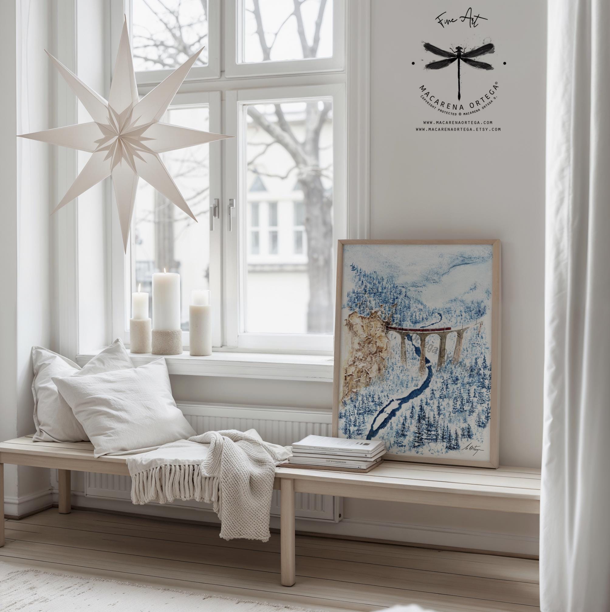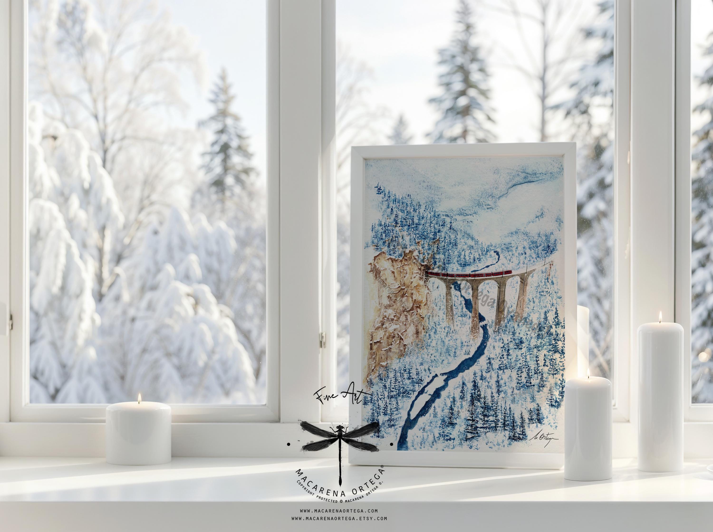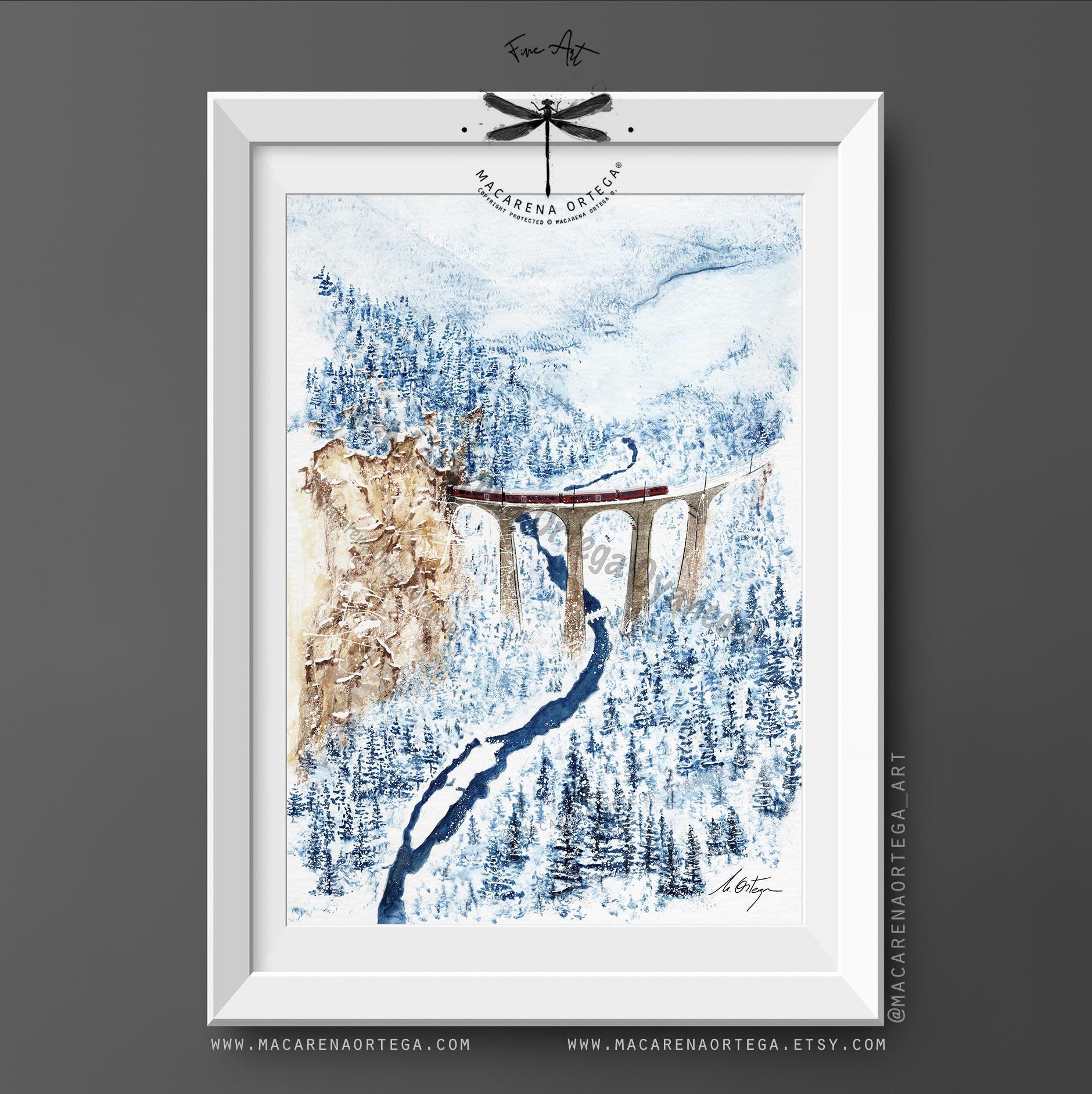 Watercolor inspired by the Glacier Express crossing the legendary Landwasser Viaduct, one of the most breathtaking scenes in the Swiss Alps.