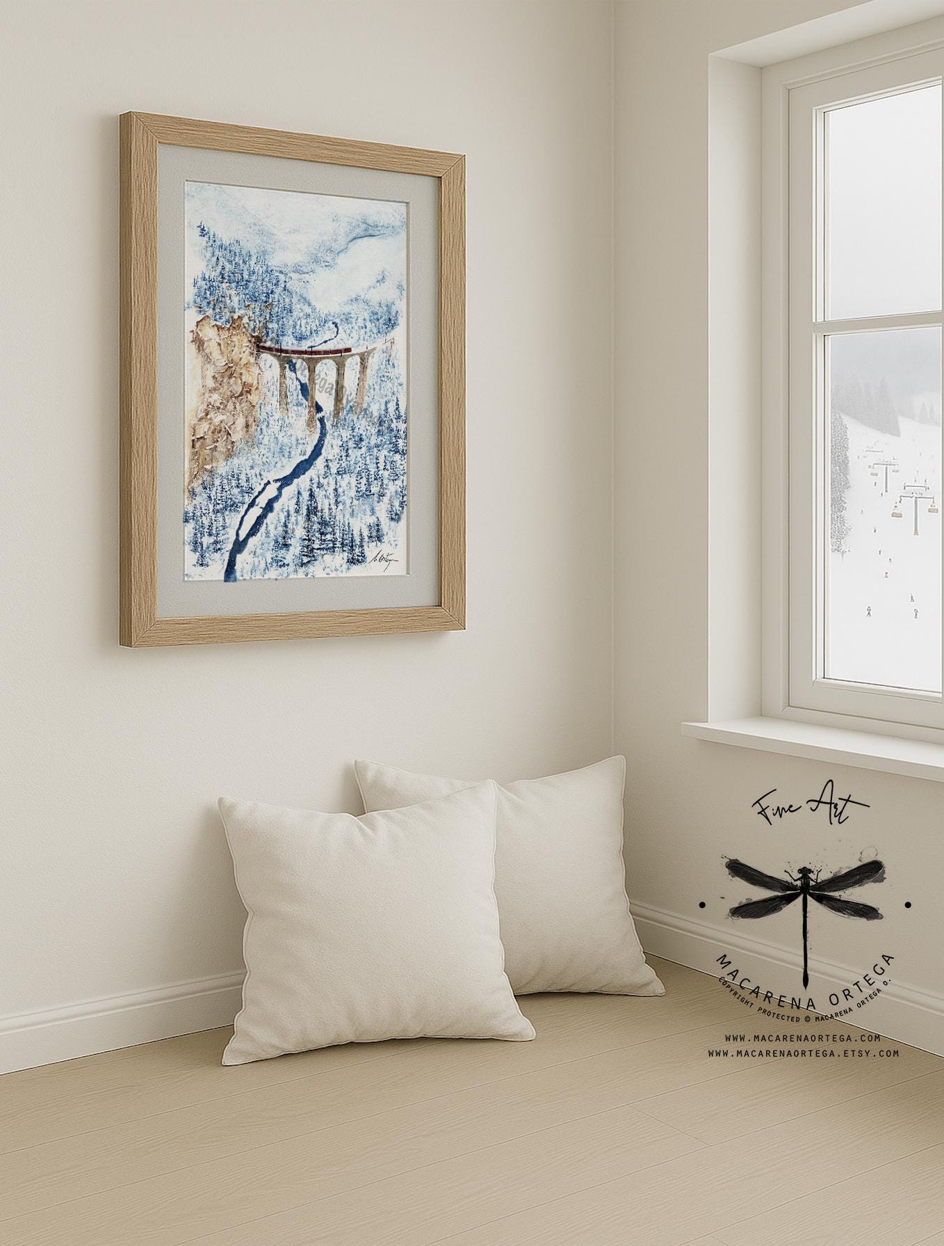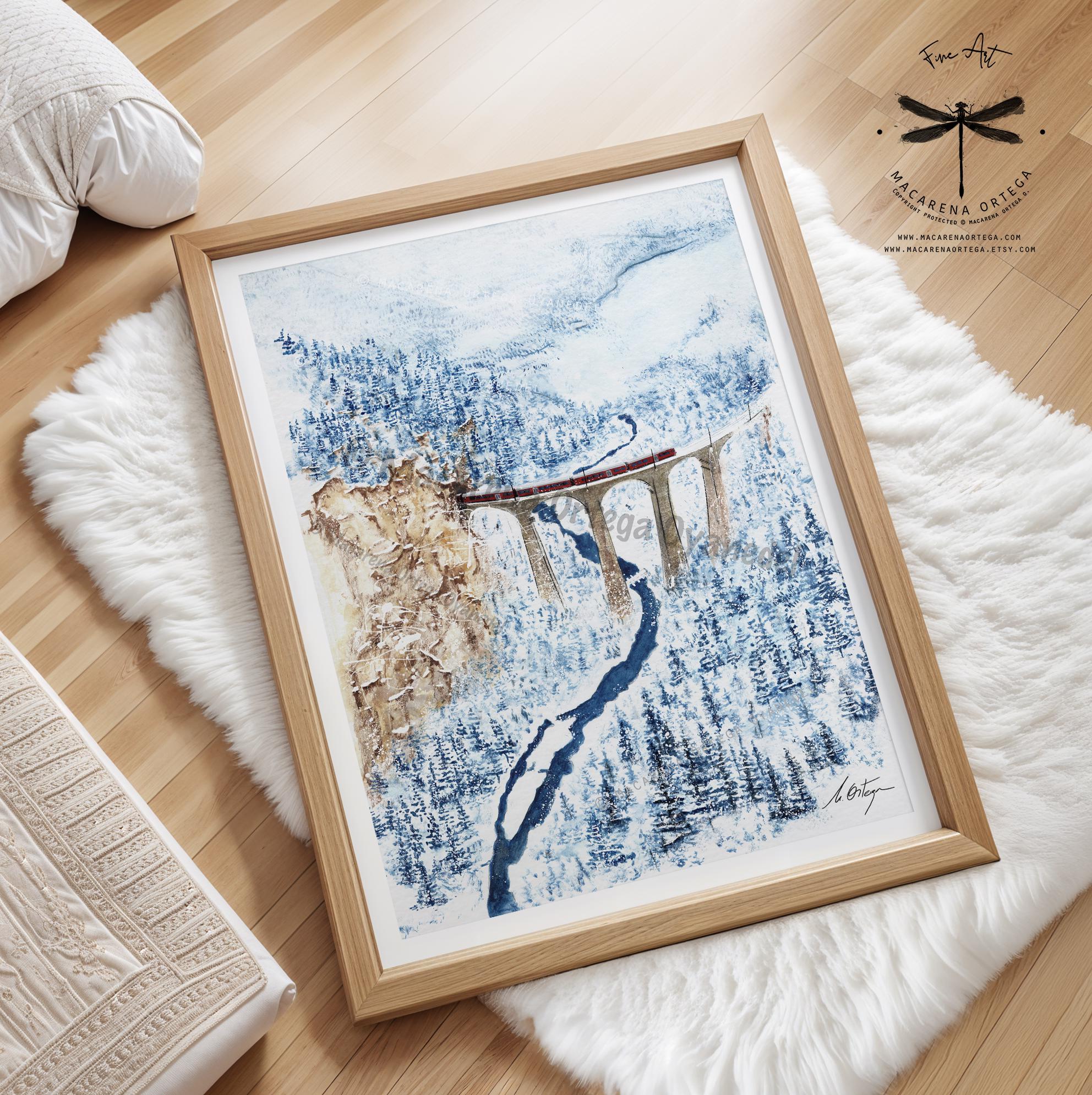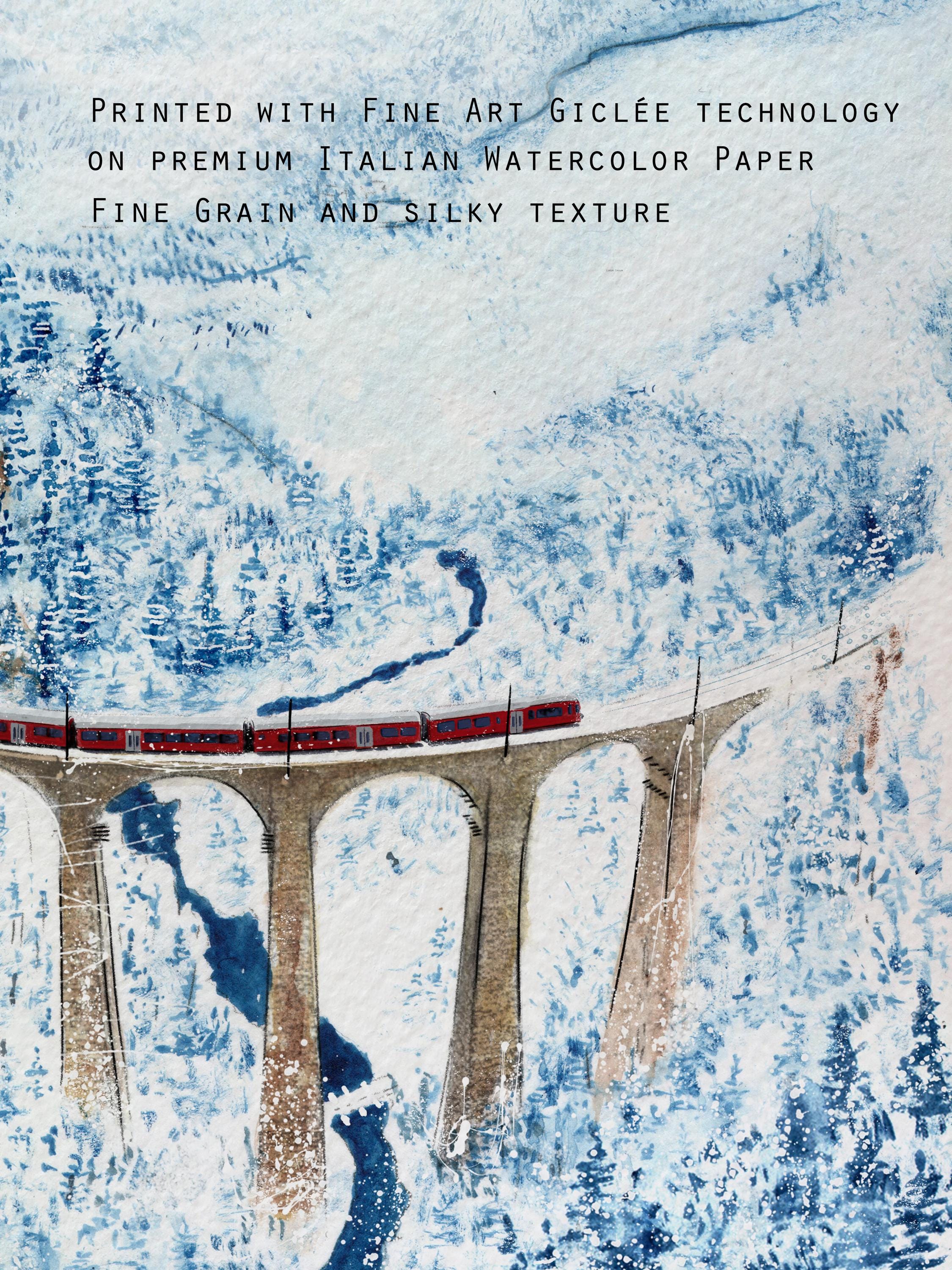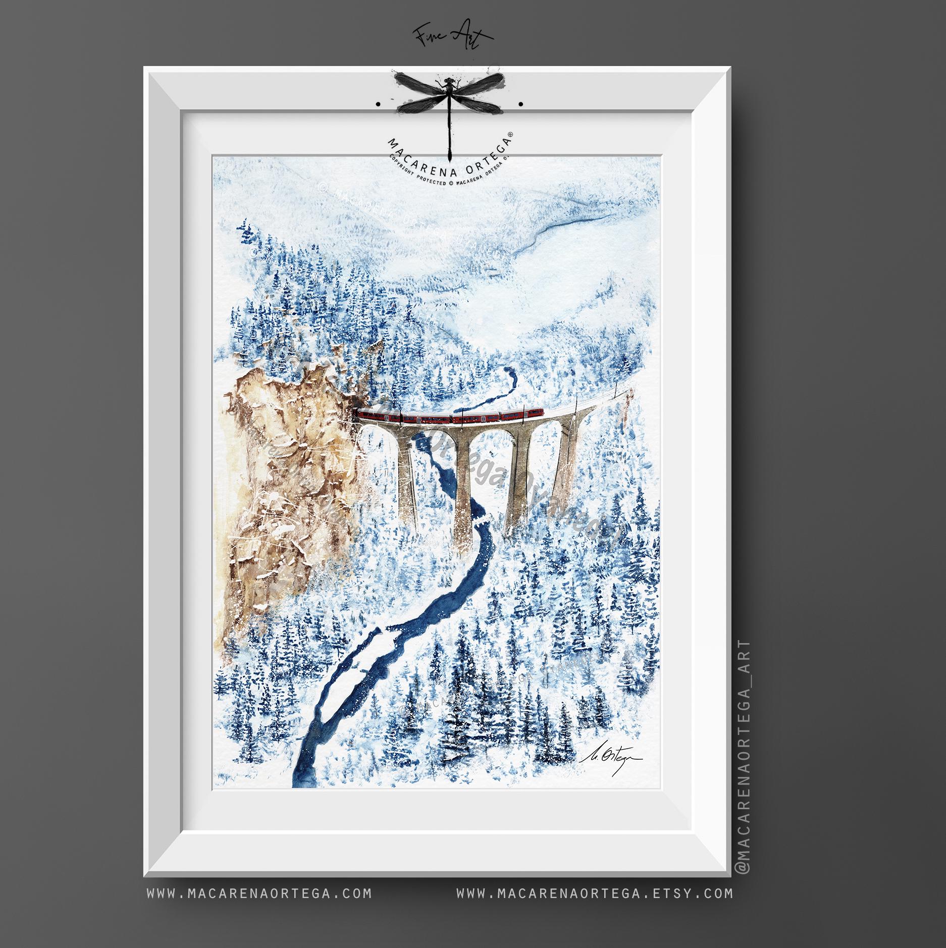 Glacier Express on Landwasser Viaduct Art | Swiss Alps Watercolor Print, Zermatt to St. Moritz Scenic Train Art | Travel Wall Art | N152