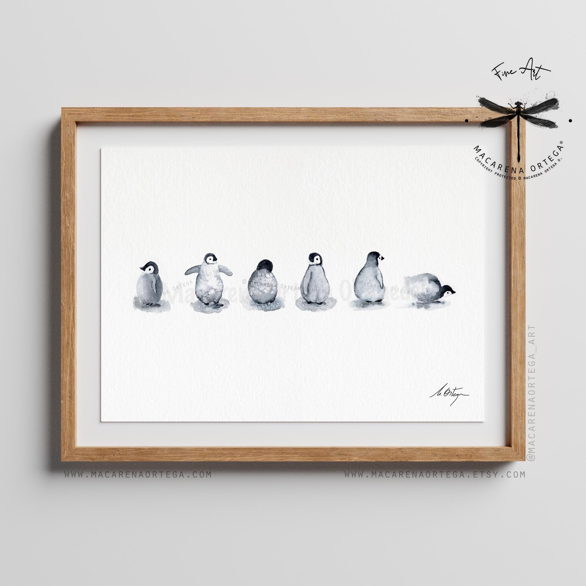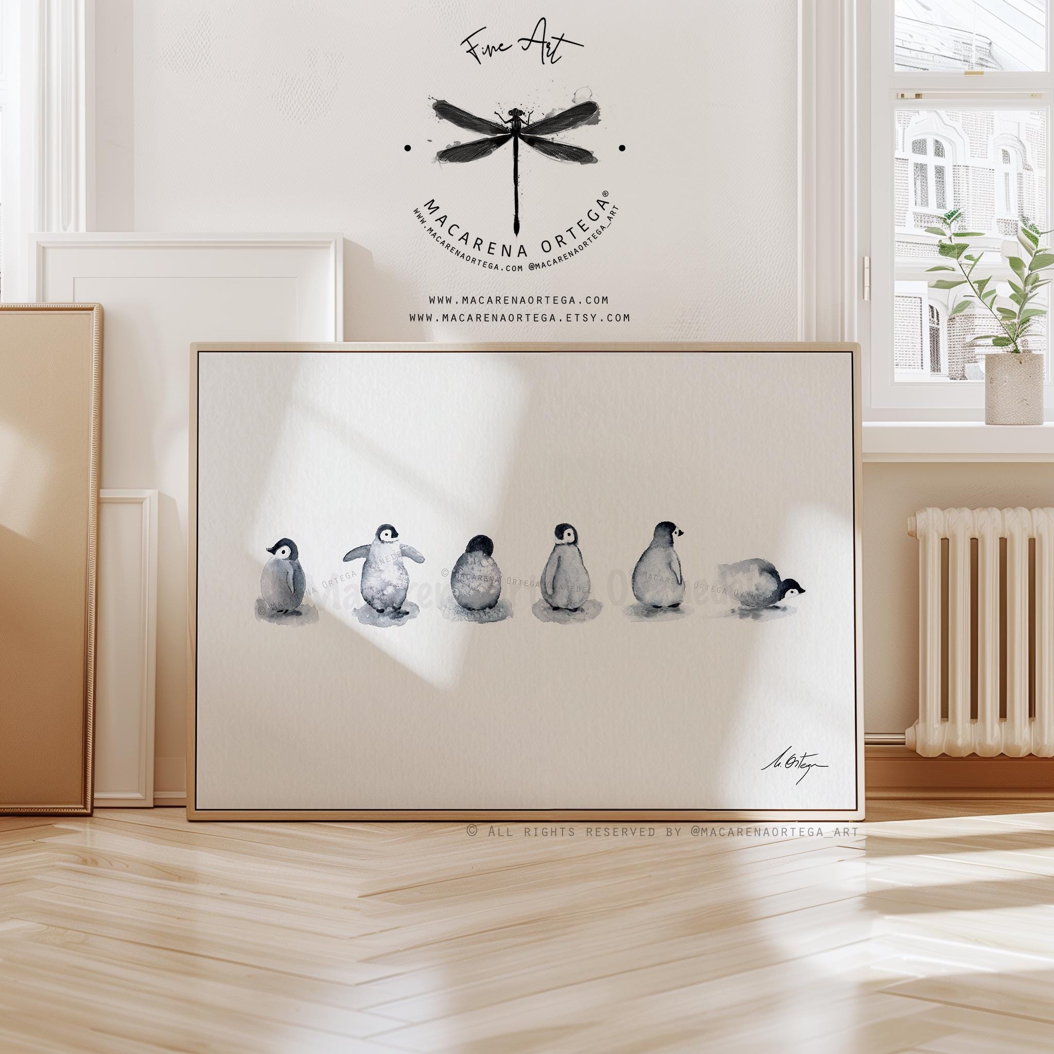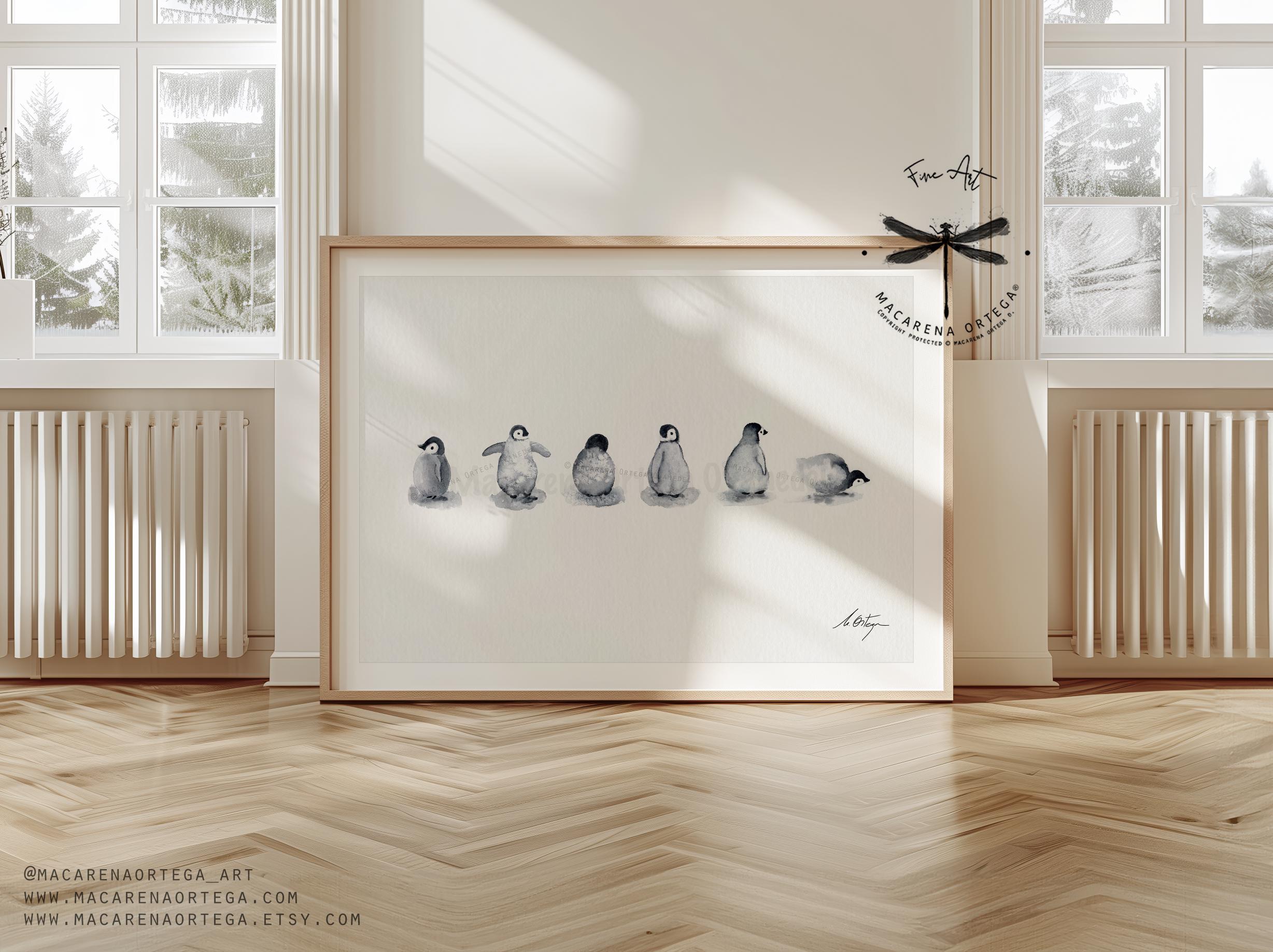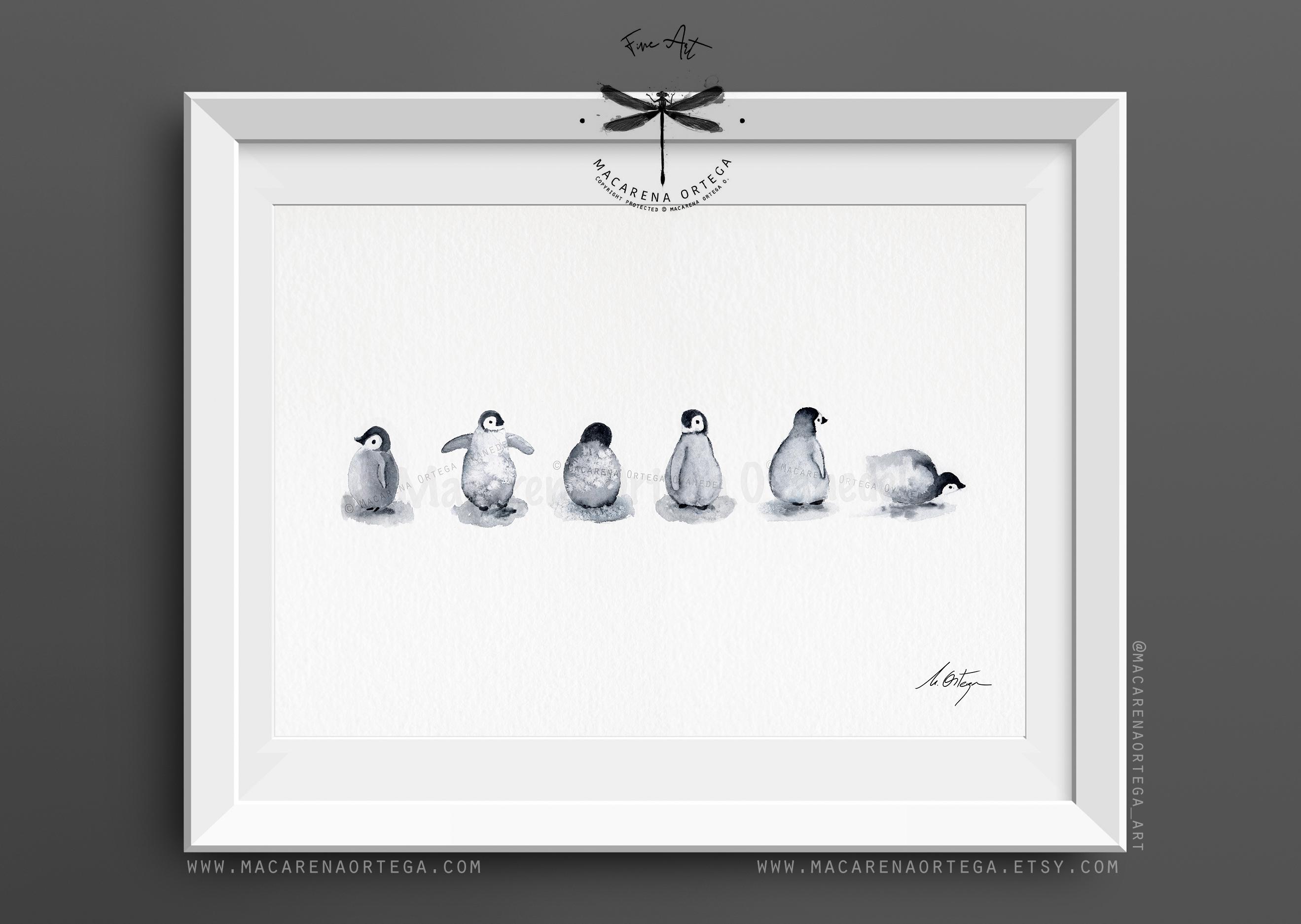 🐧 Six little penguin friends, captured in a soft and minimalist watercolor scene — a gentle tribute to the quiet beauty of Arctic life.