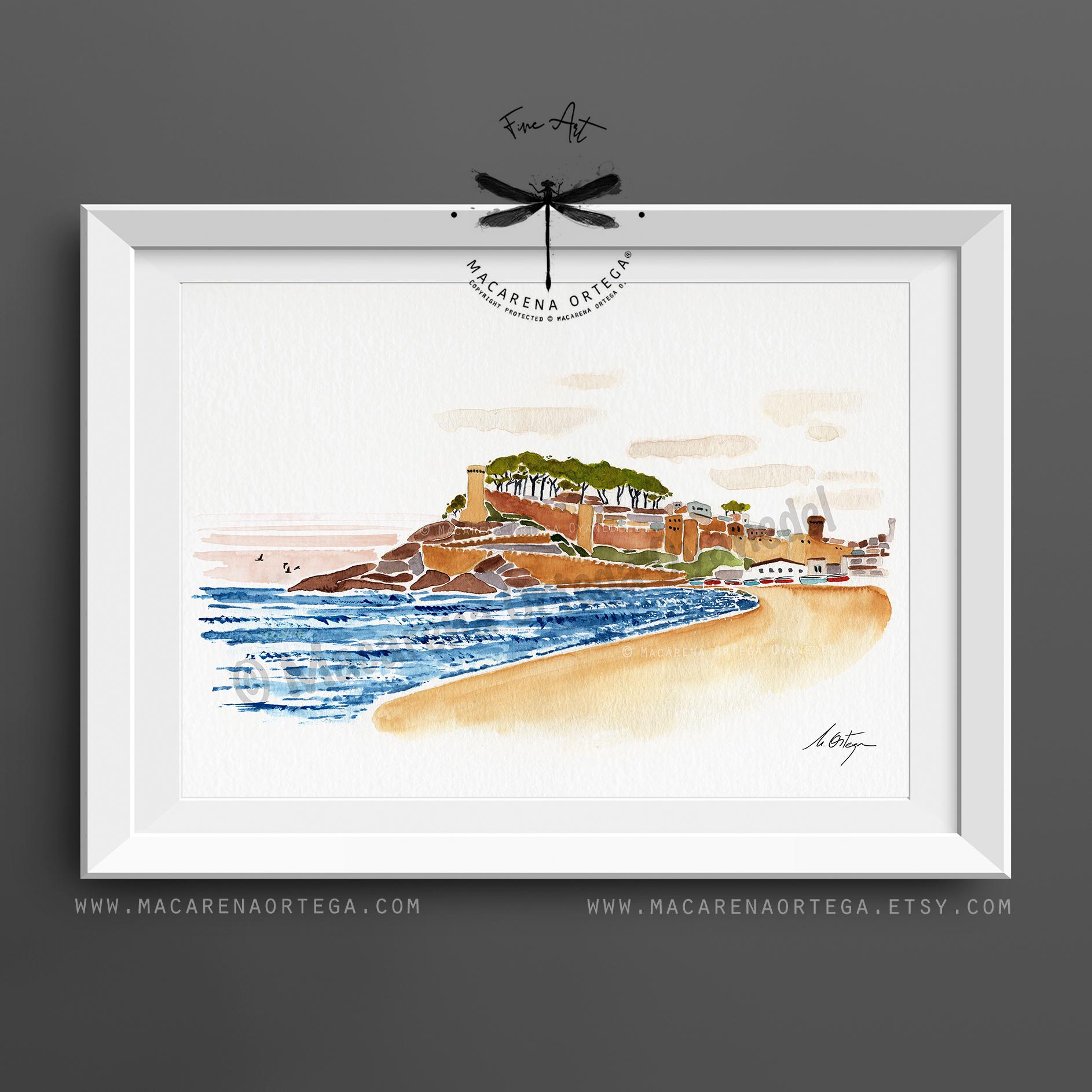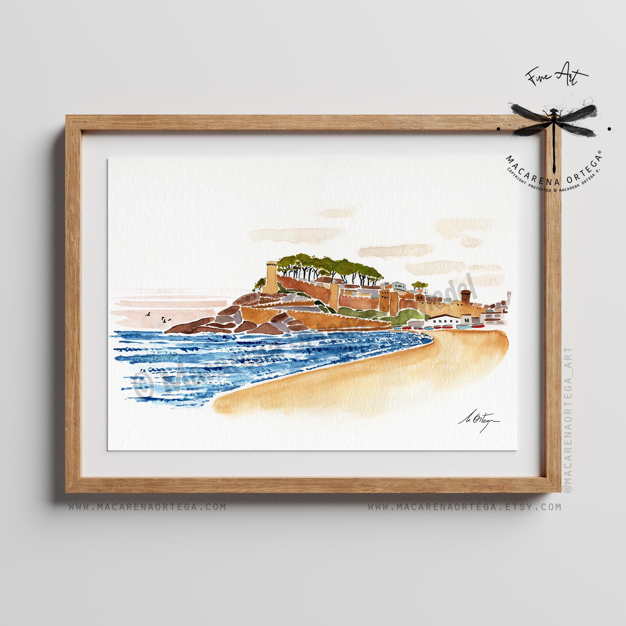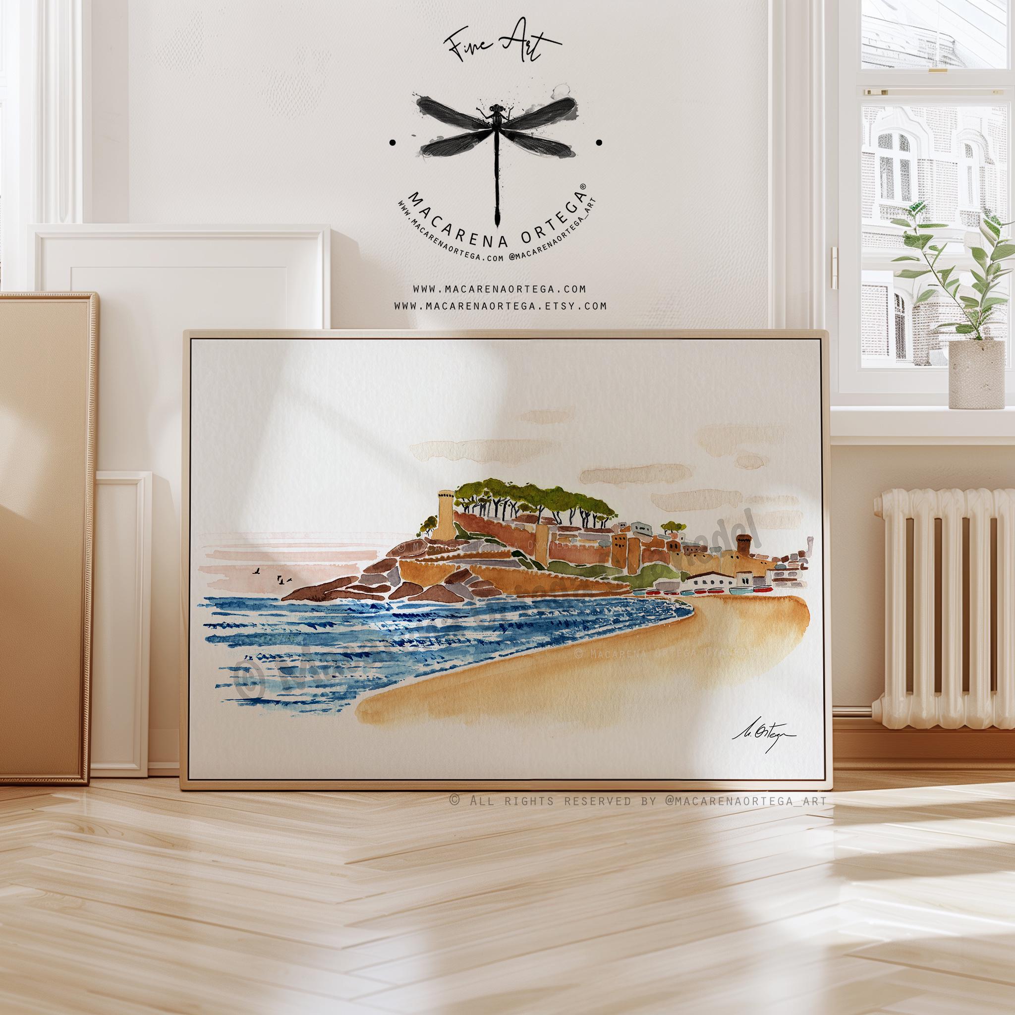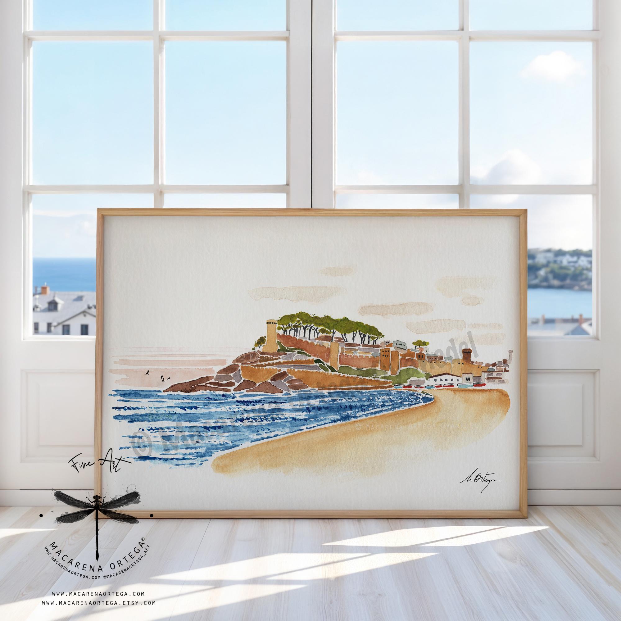 A modern and minimalist watercolor of Tossa de Mar, inspired by Mediterranean light and the soft, coastal colors of the Costa Brava, painted by hand with light, airy brushstrokes.