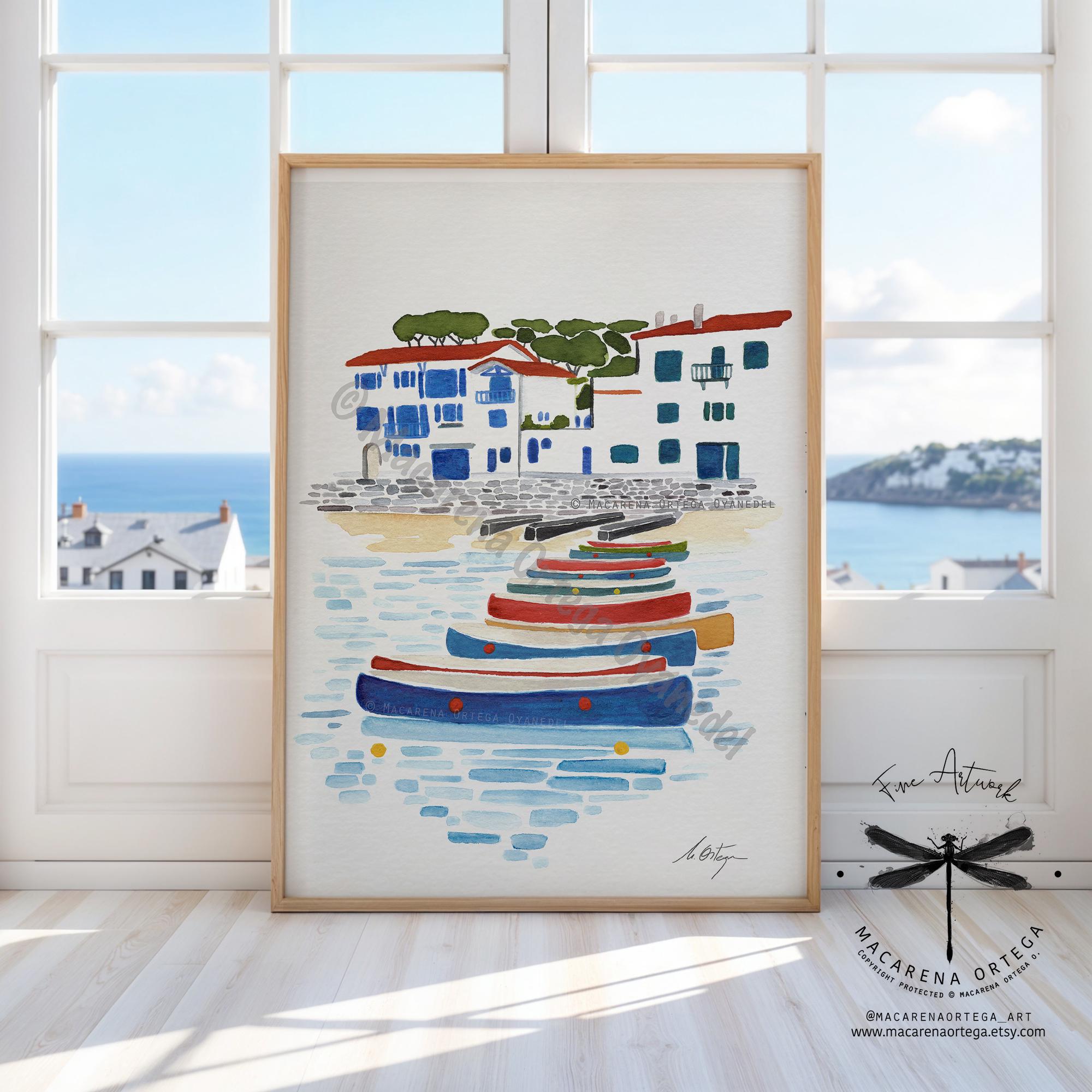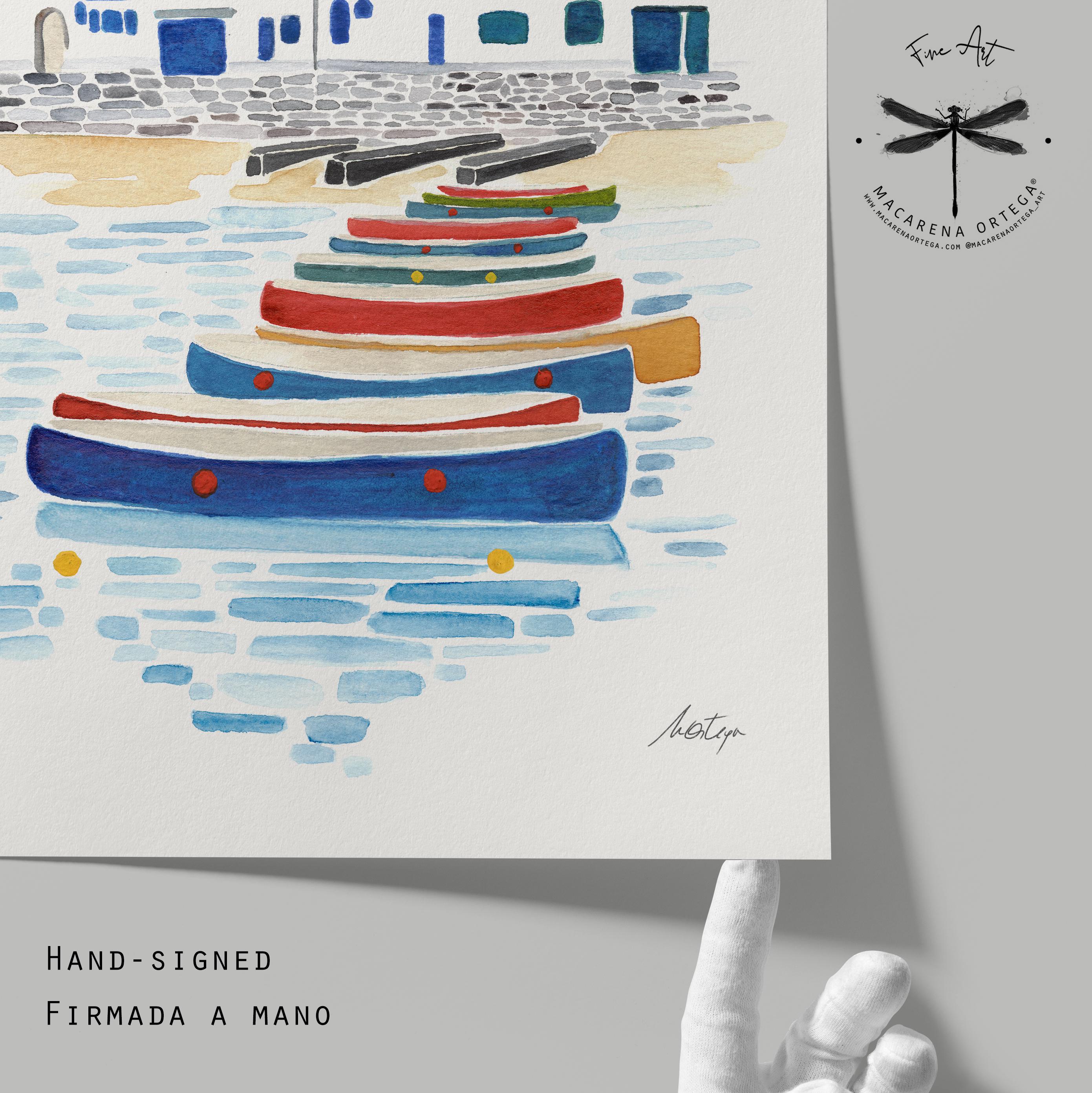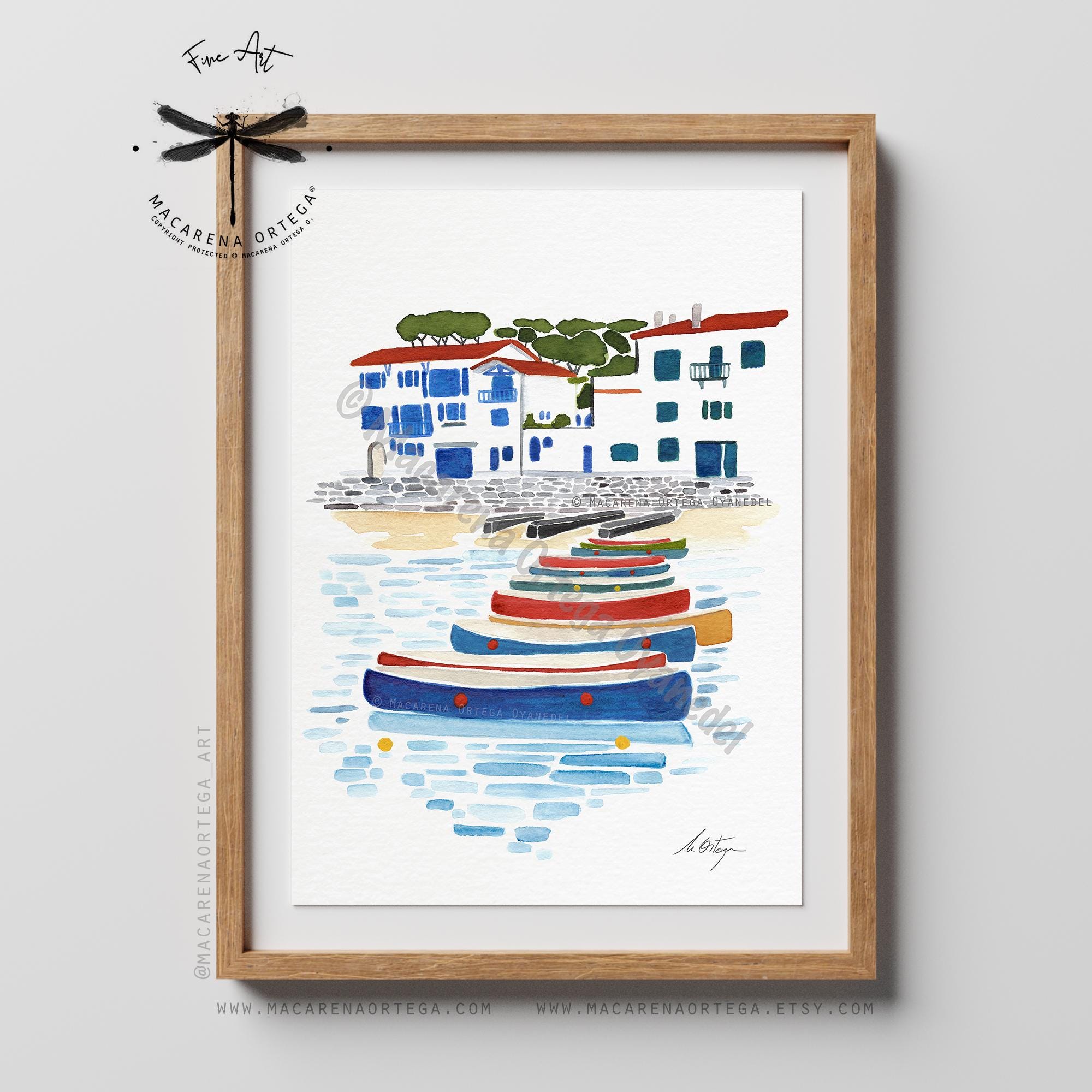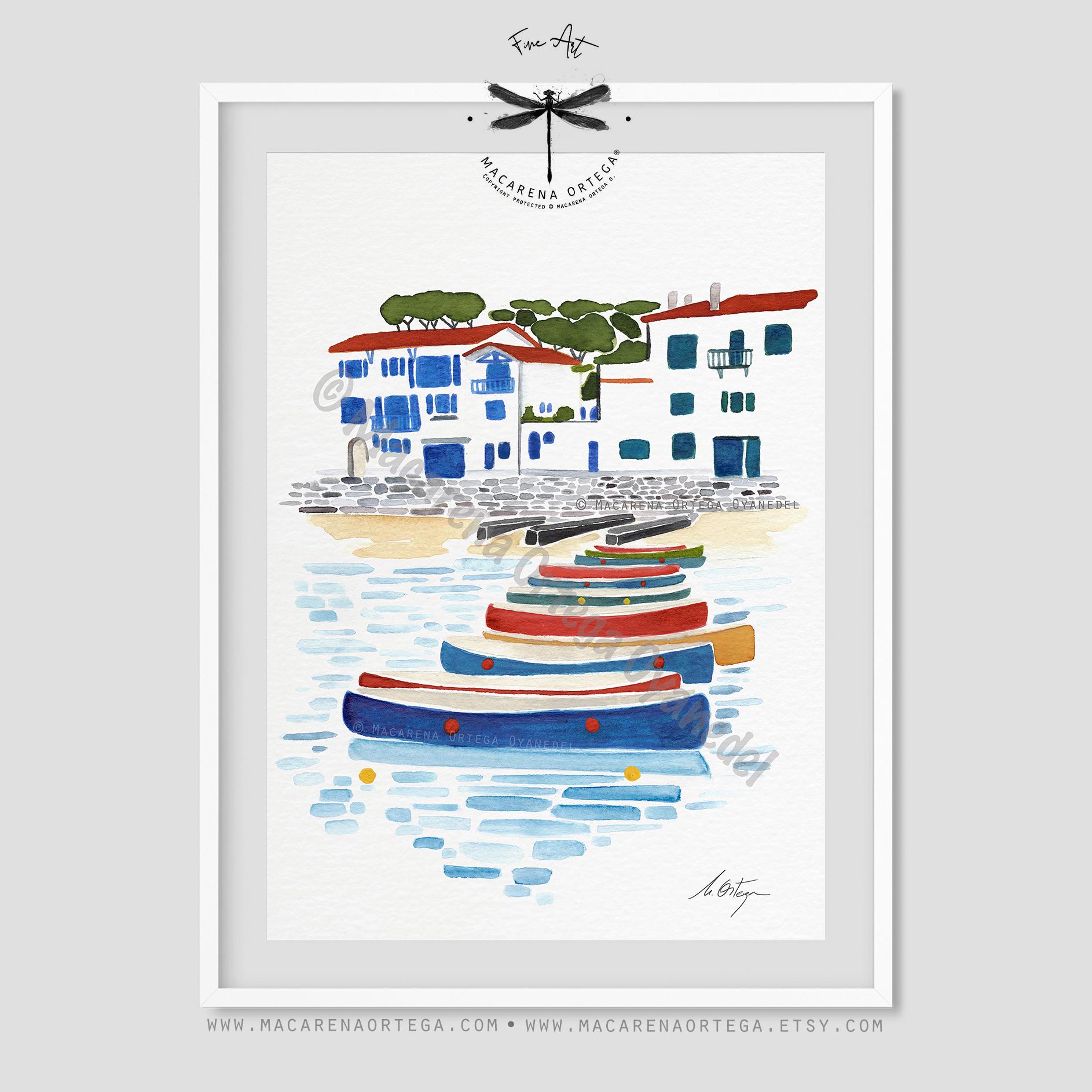 A modern, minimalist watercolor of Saint-Jean-de-Luz, capturing the colorful boats of Zokoa resting on calm waters in the Basque Country.