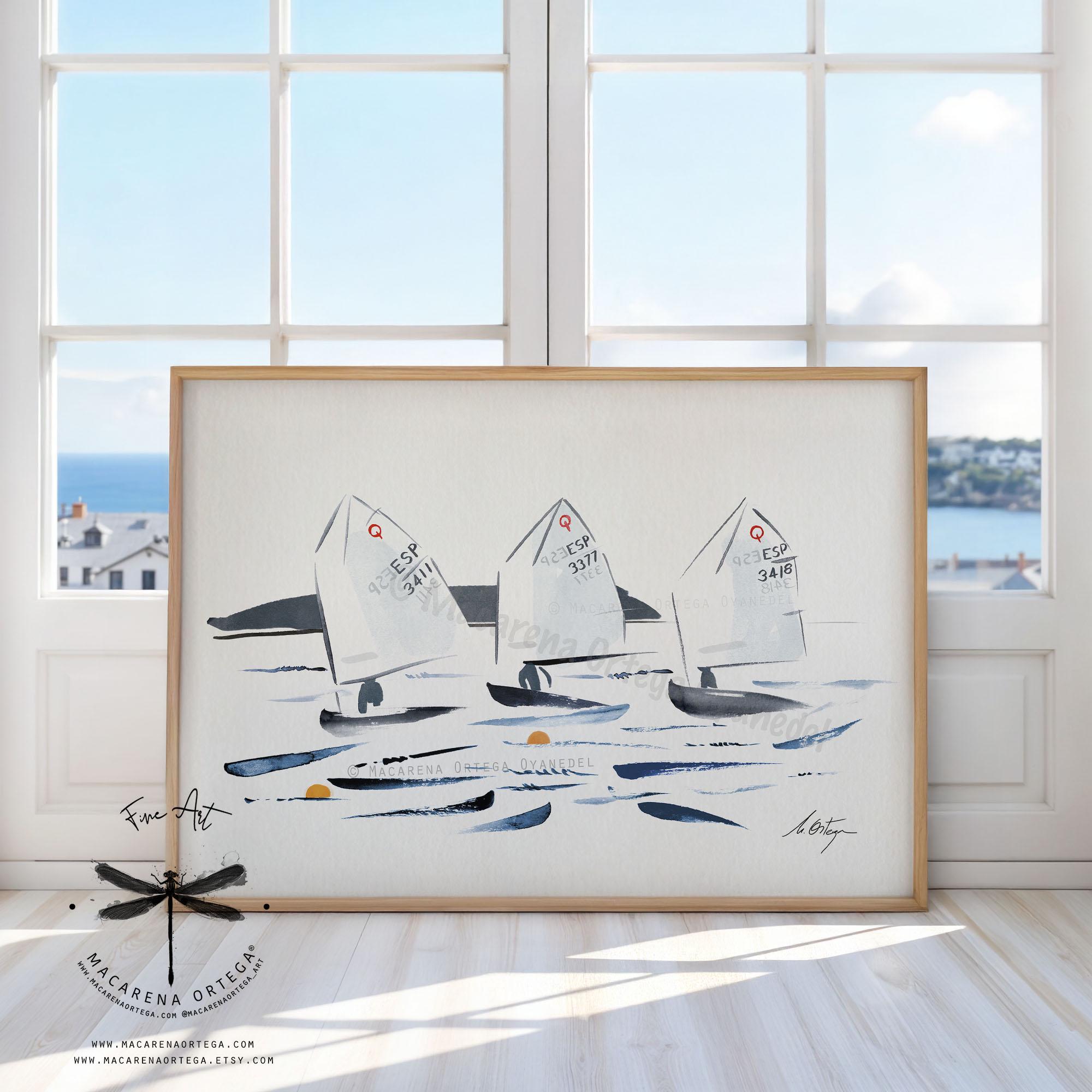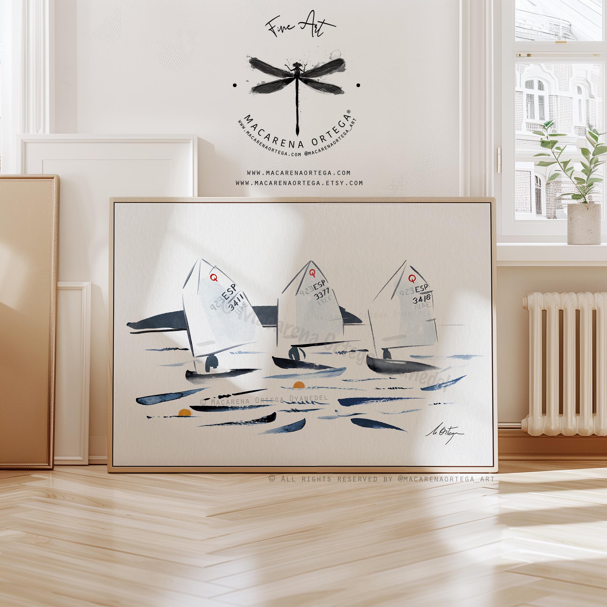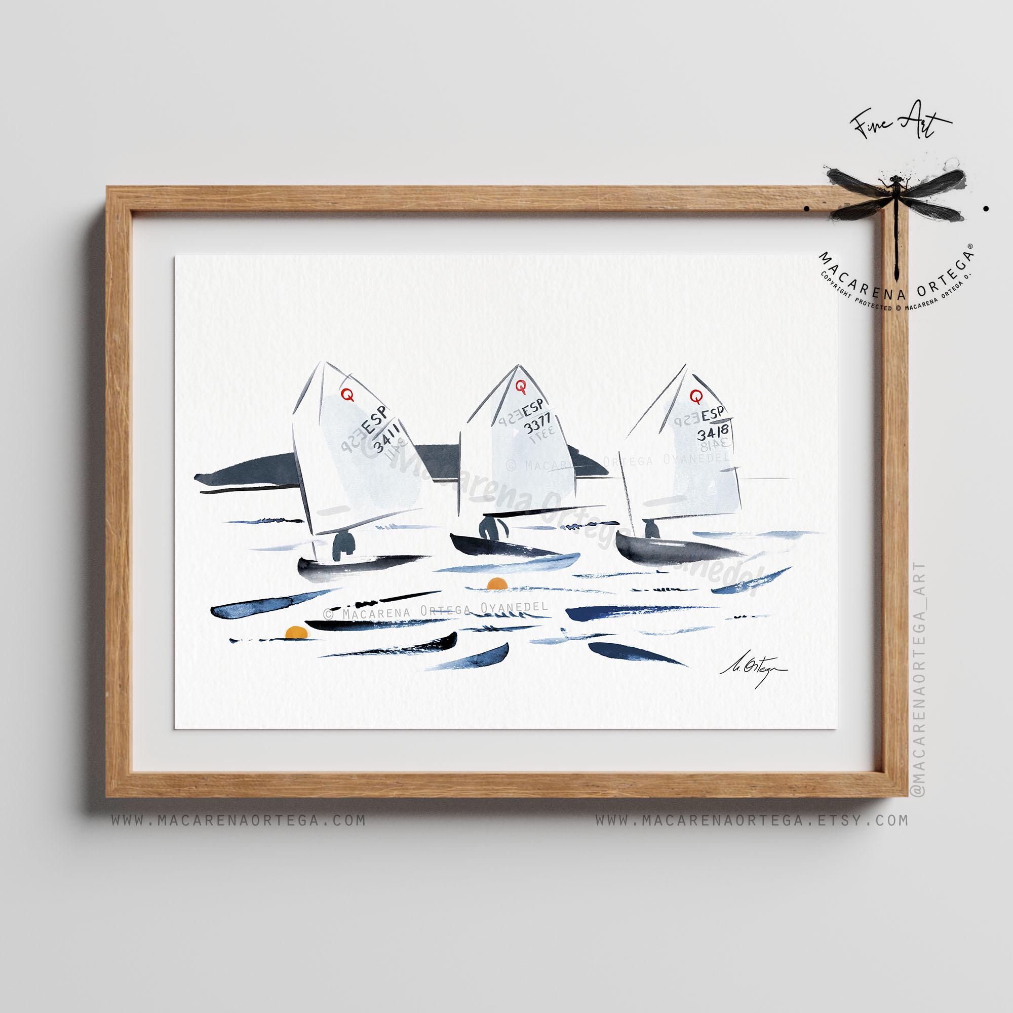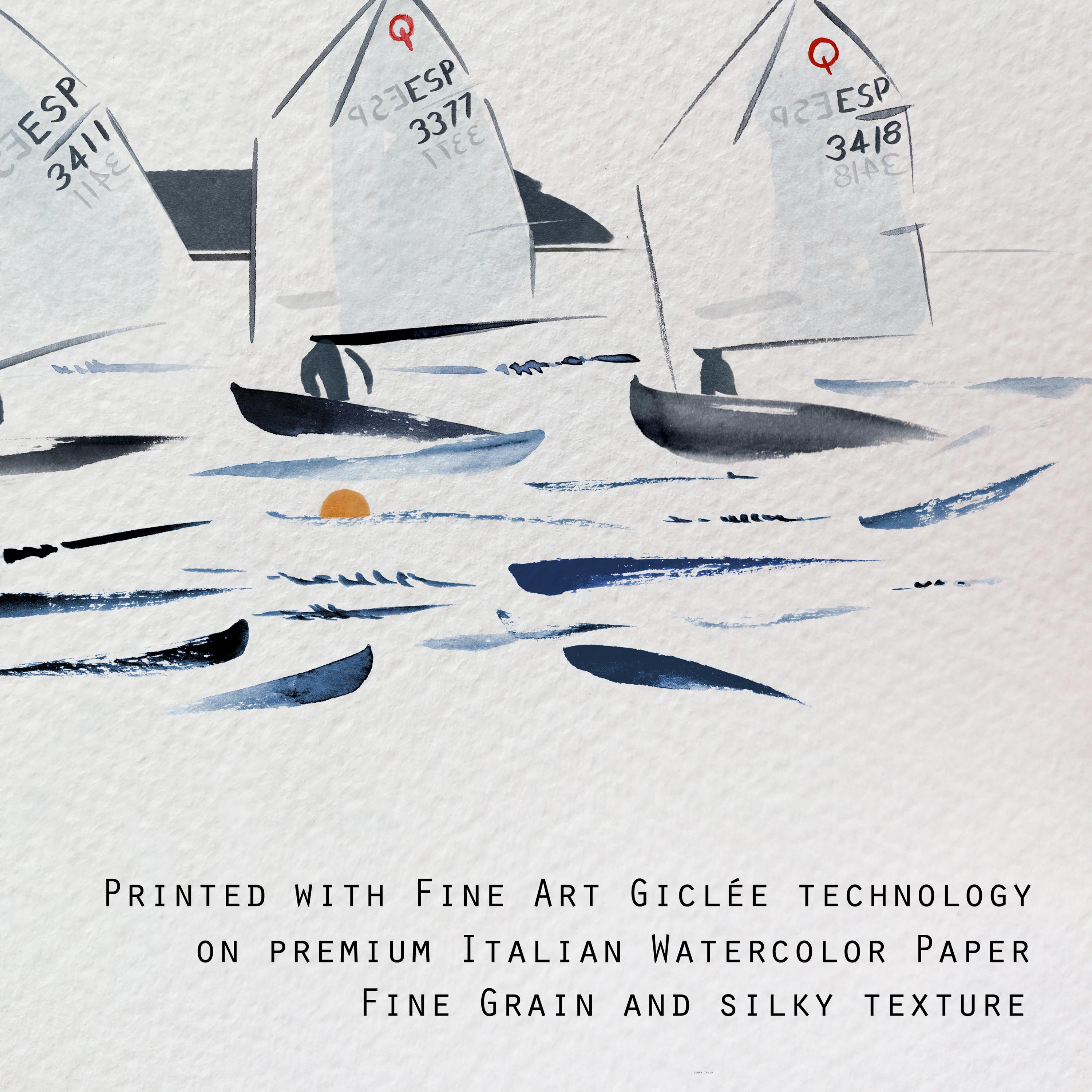 Minimalist watercolor of Optimist sailboats during a regatta, capturing movement, light, and the calm energy of the sea.