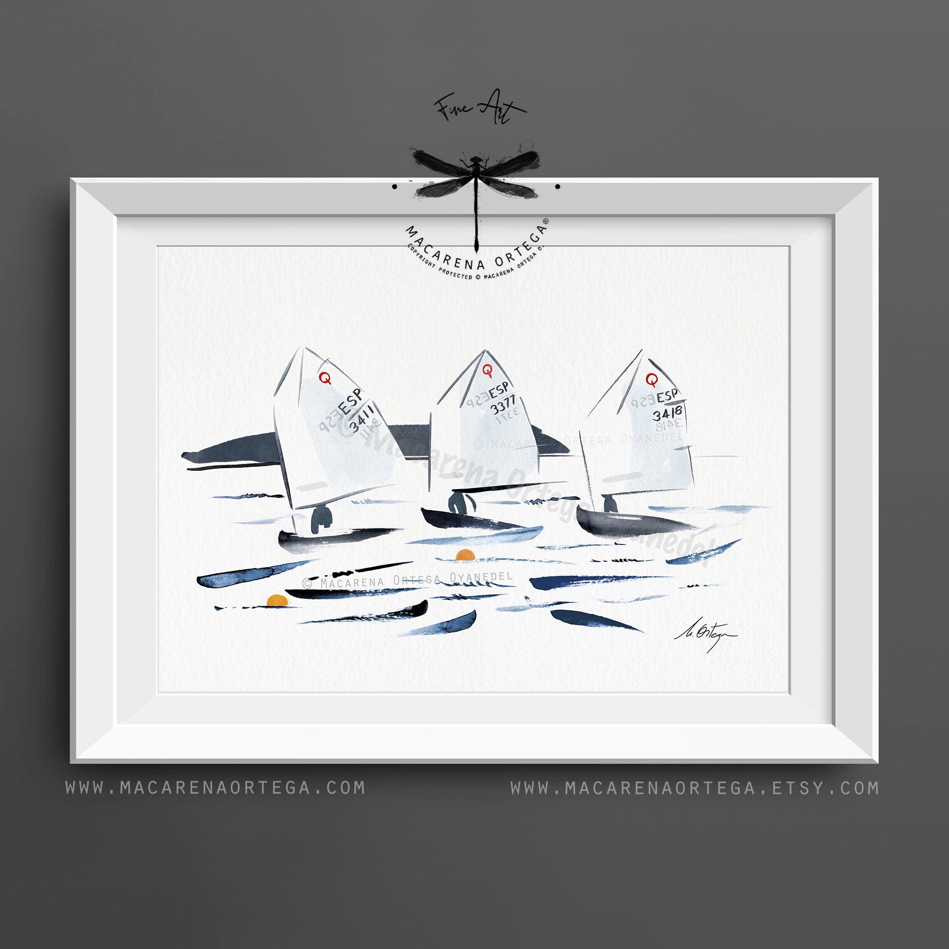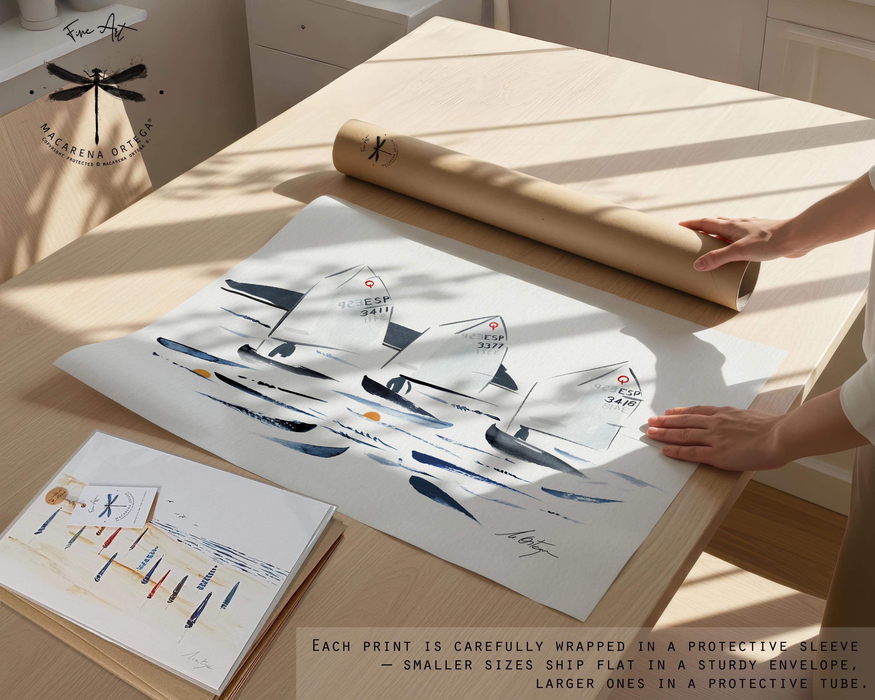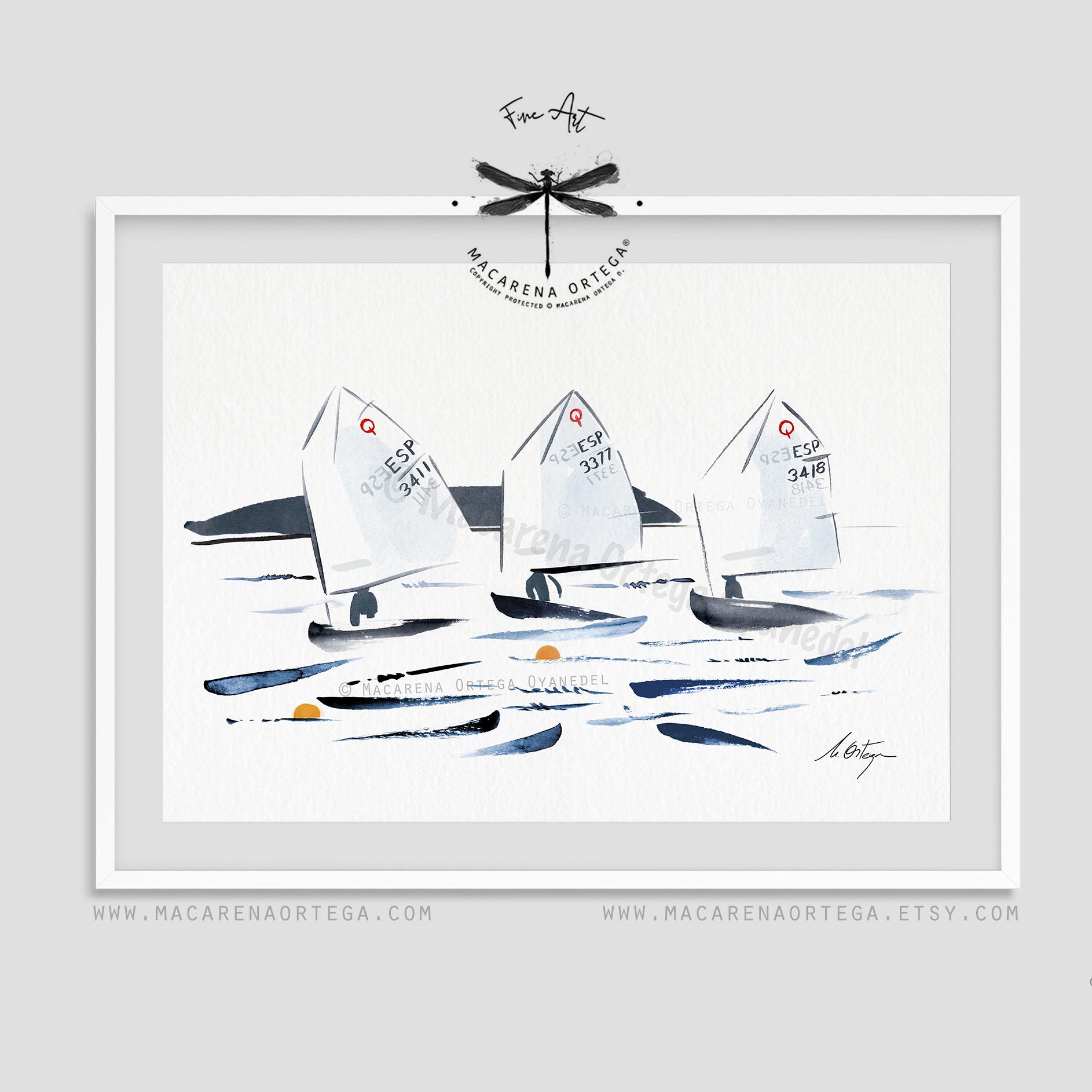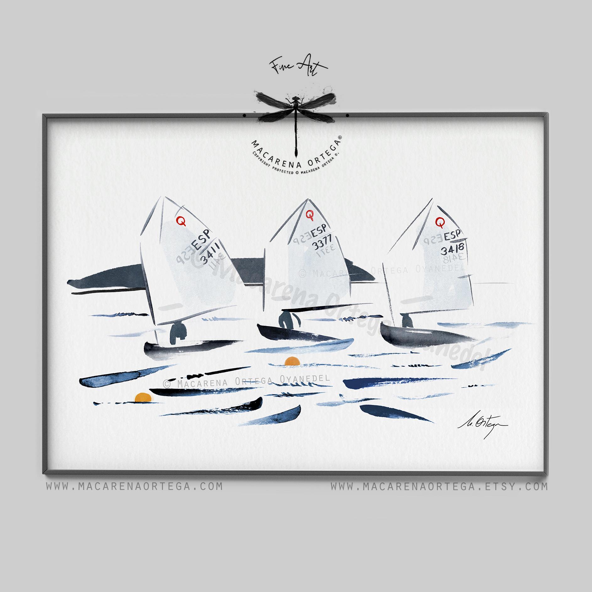 Minimalist watercolor of Optimist sailboats during a regatta, capturing movement, light, and the calm energy of the sea.