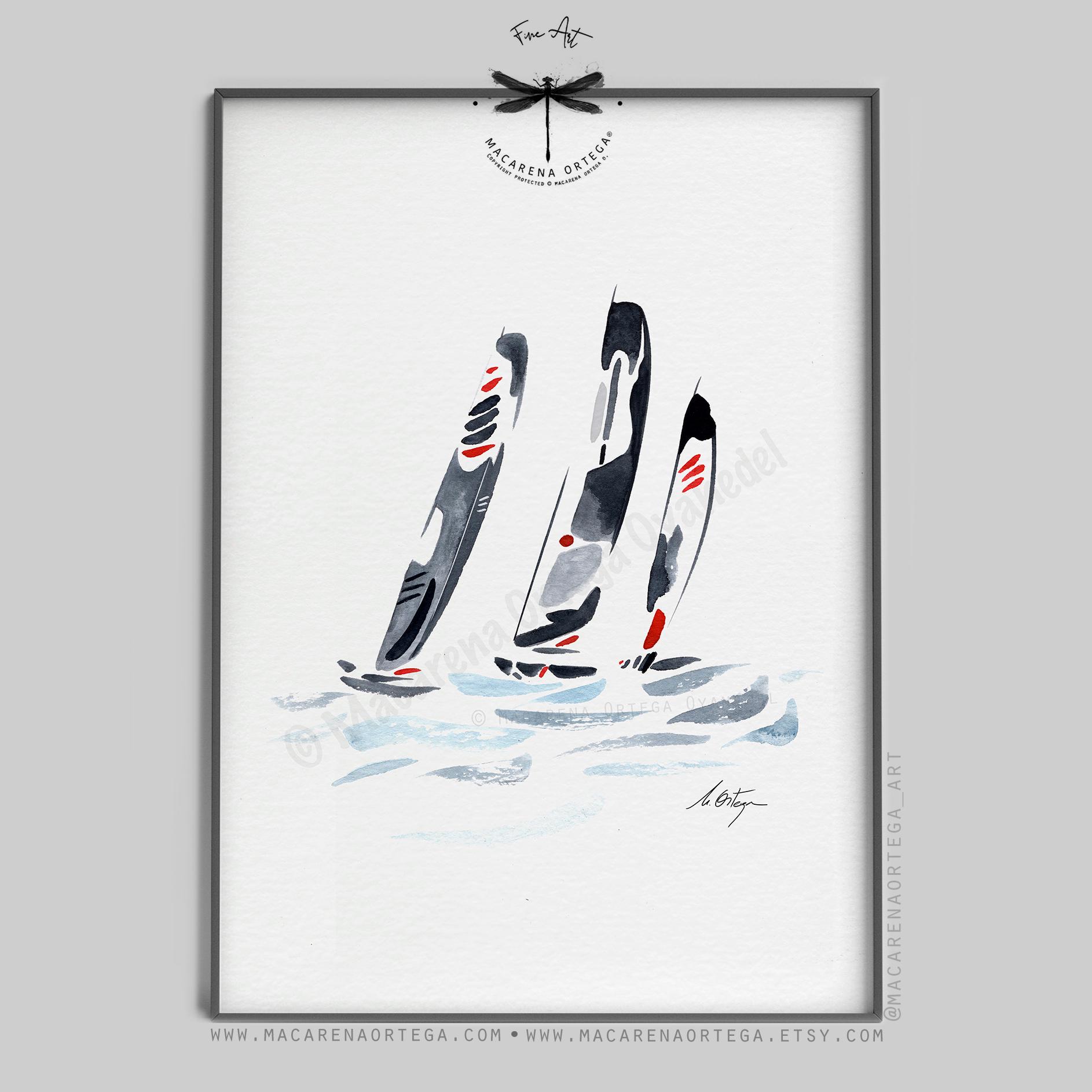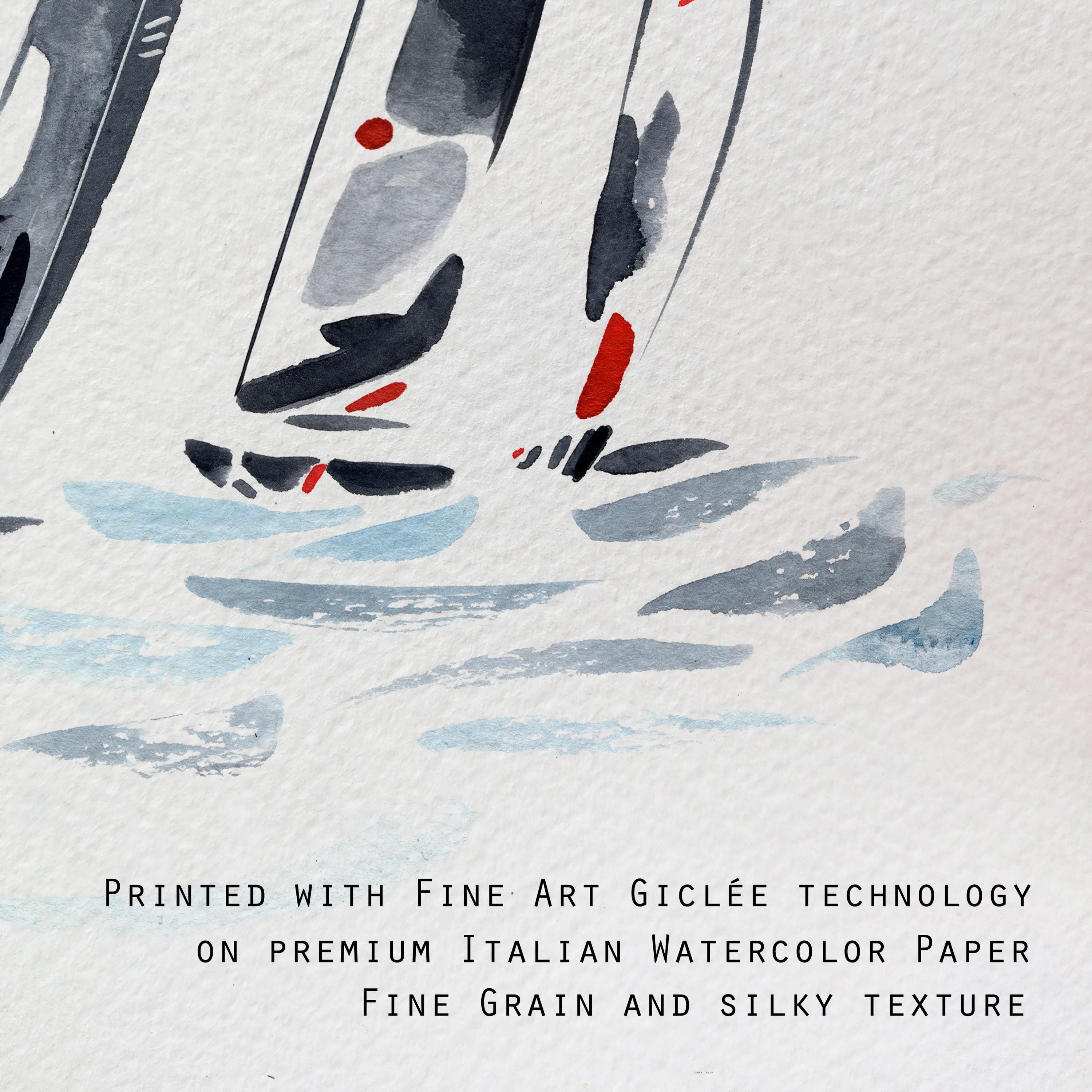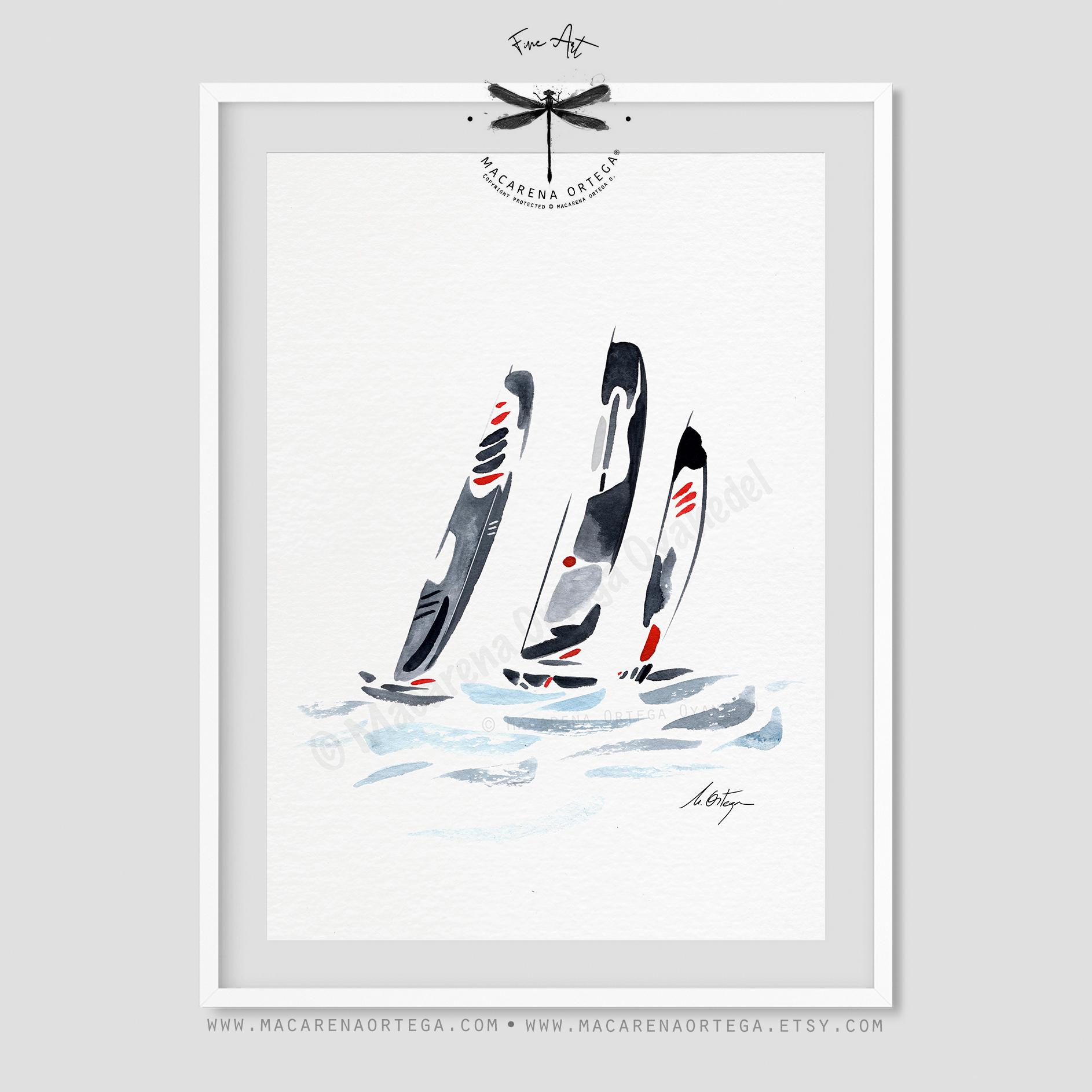 Minimalist watercolor inspired by sailing regattas, featuring elegant Figaro sailboats cutting through the ocean.