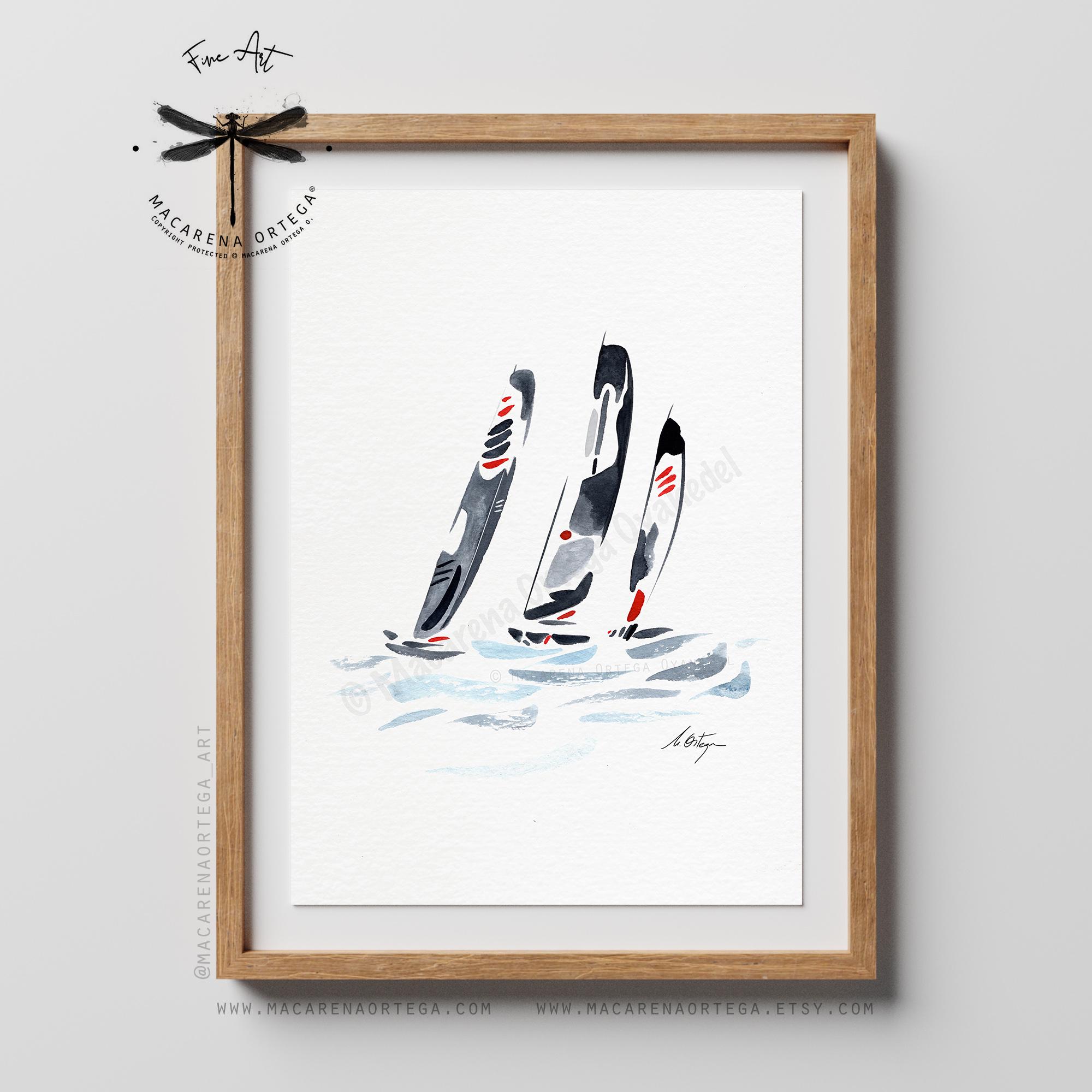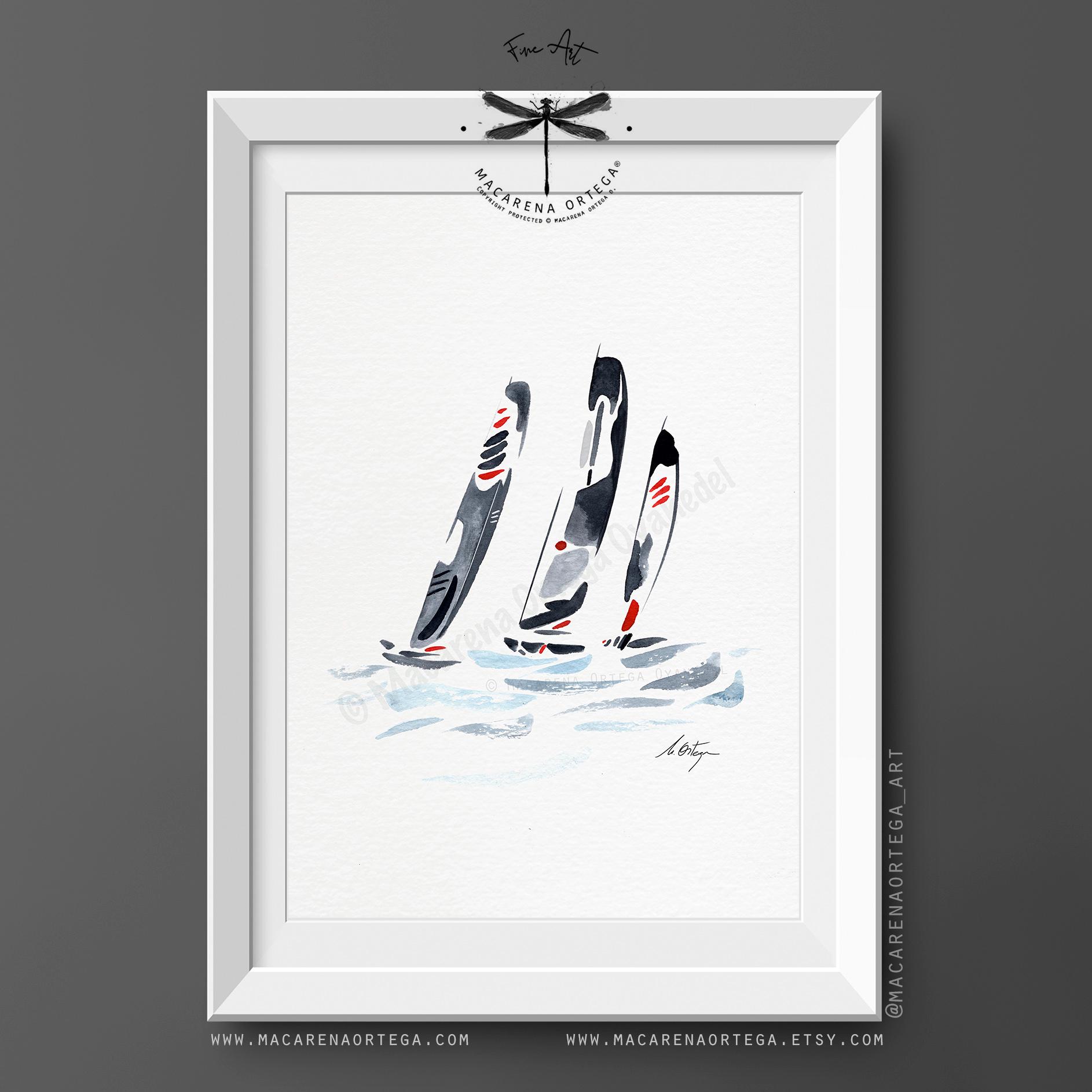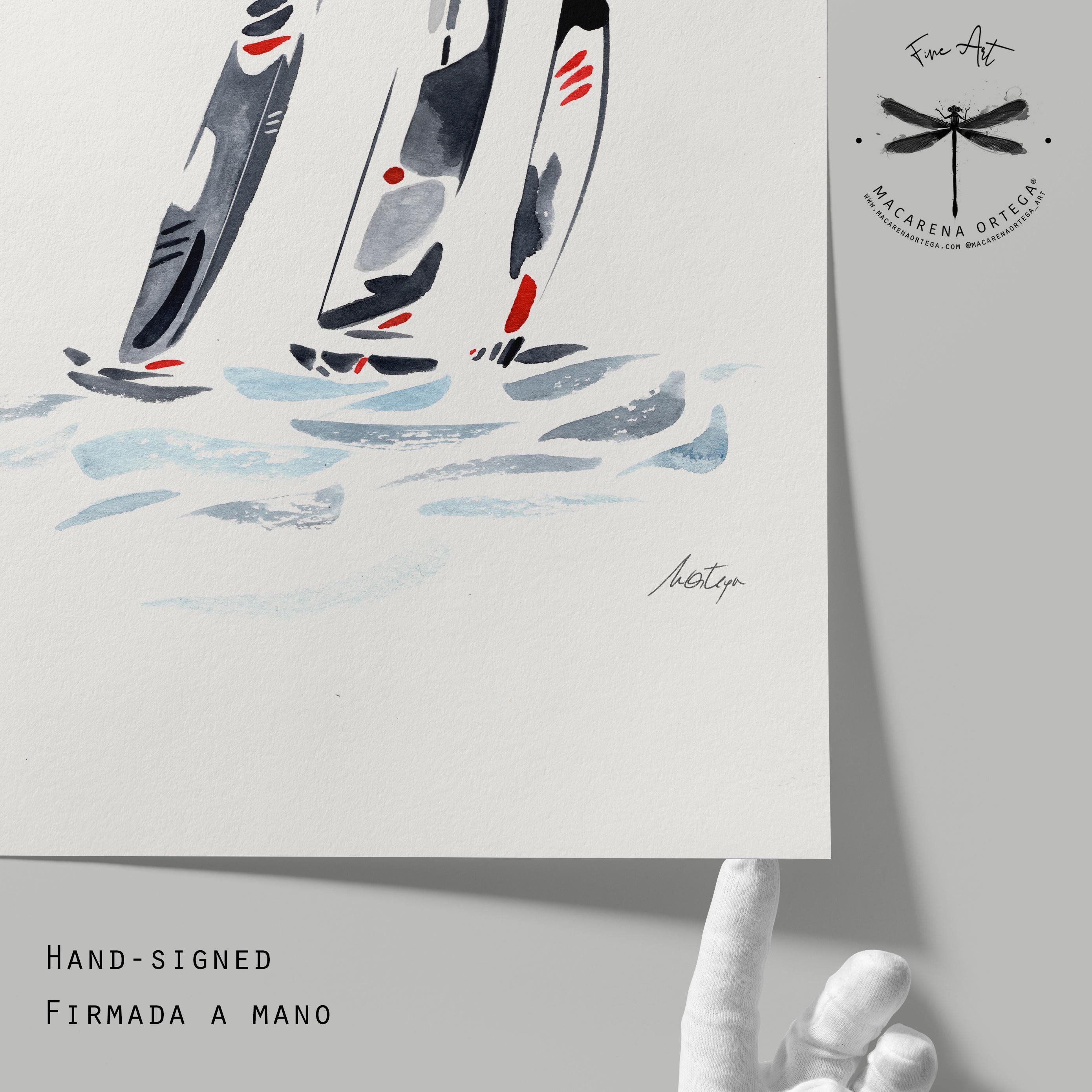 Minimalist watercolor inspired by sailing regattas, featuring elegant Figaro sailboats cutting through the ocean.