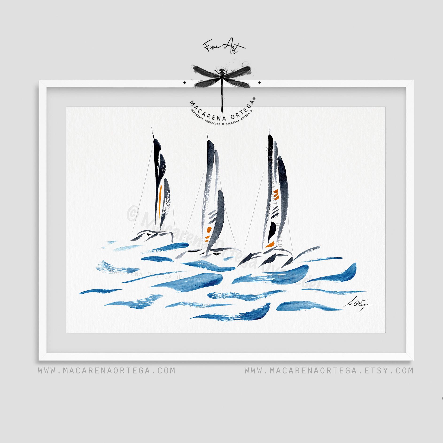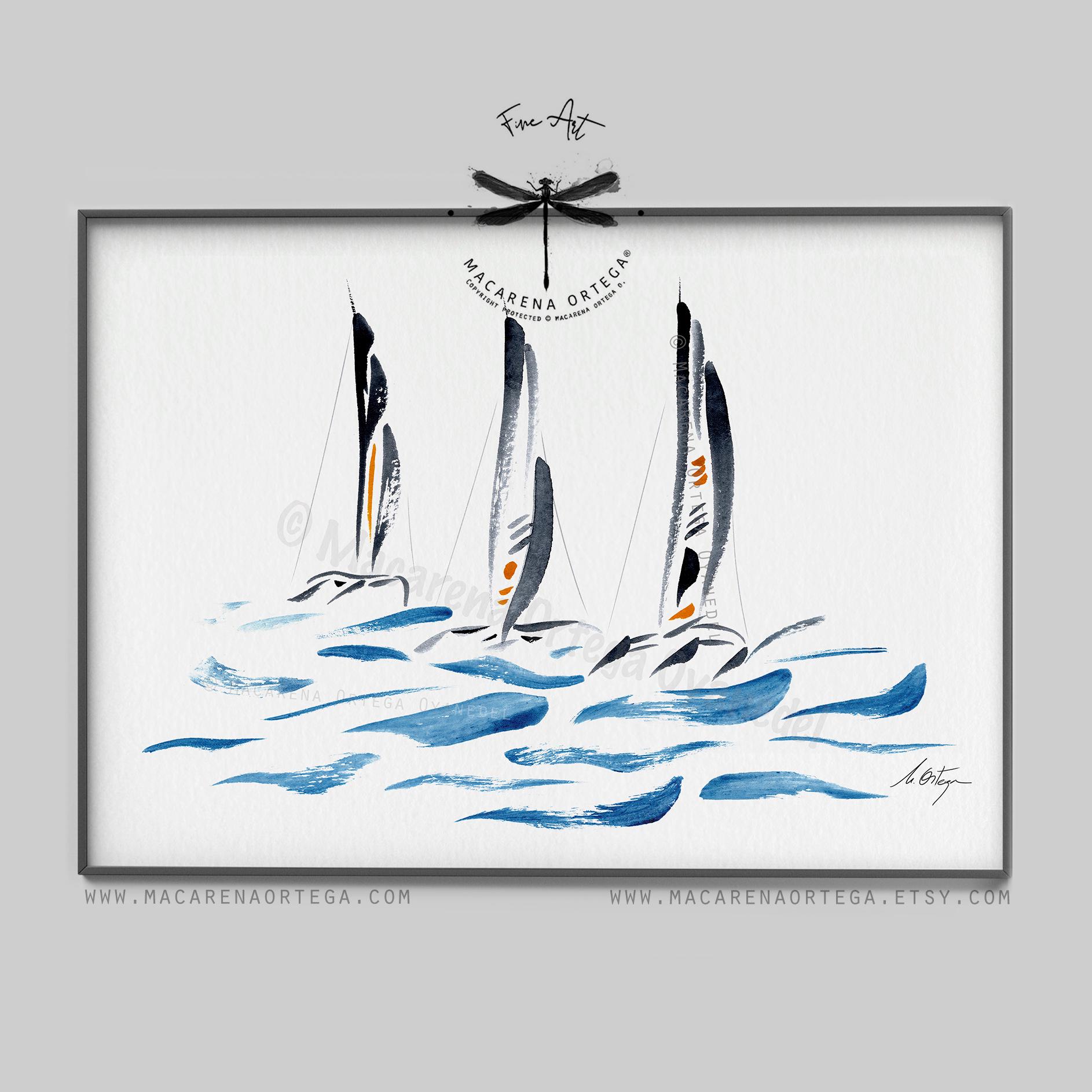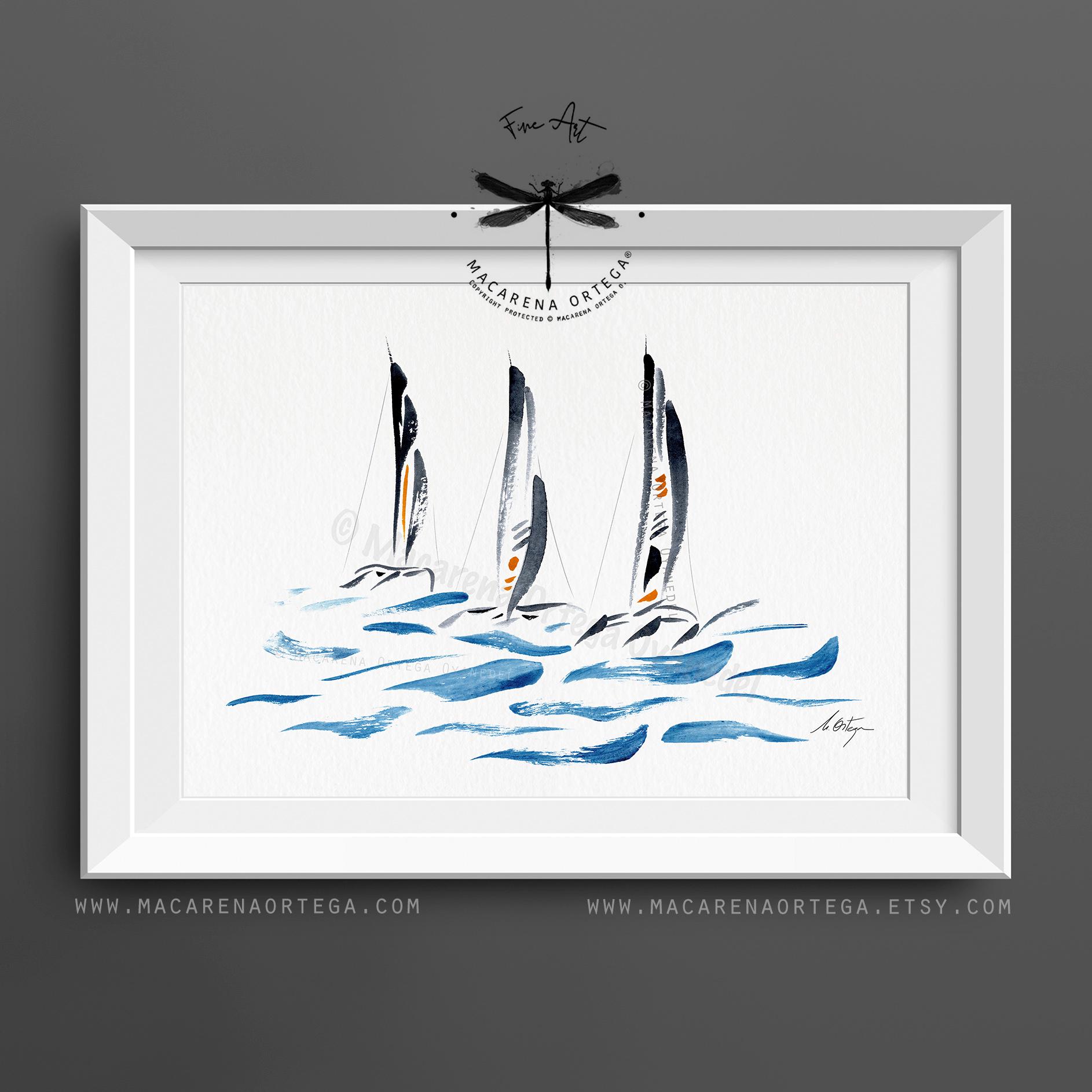 Minimal trimaran sailboats — a watercolor in modern, elegant tones. I really enjoyed painting this piece; it was a challenge to capture their unique structure and movement using just a few expressive, simple strokes.
