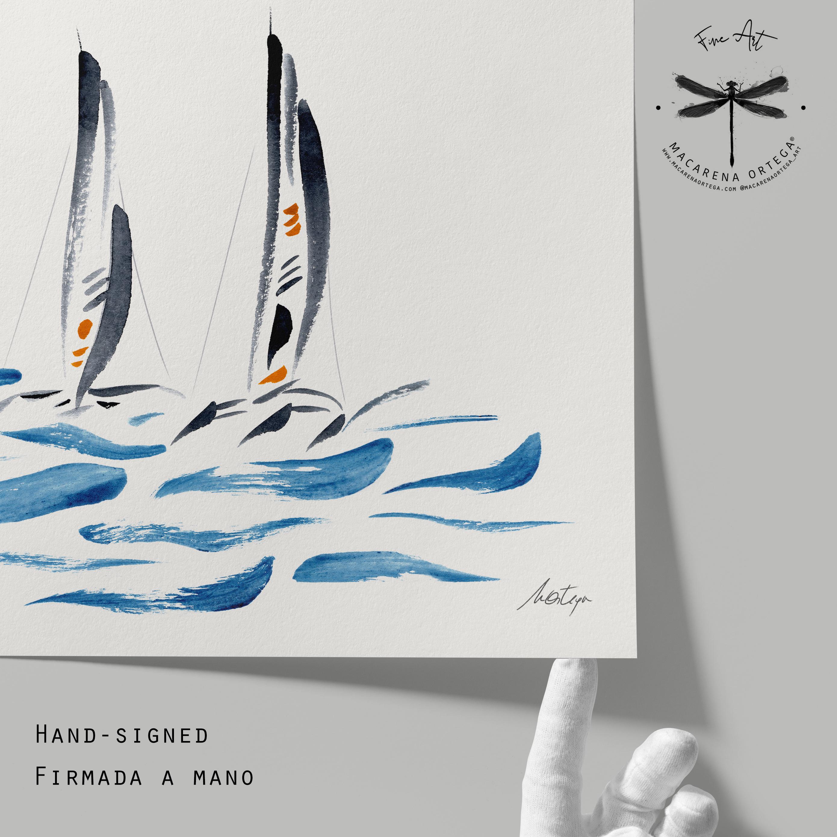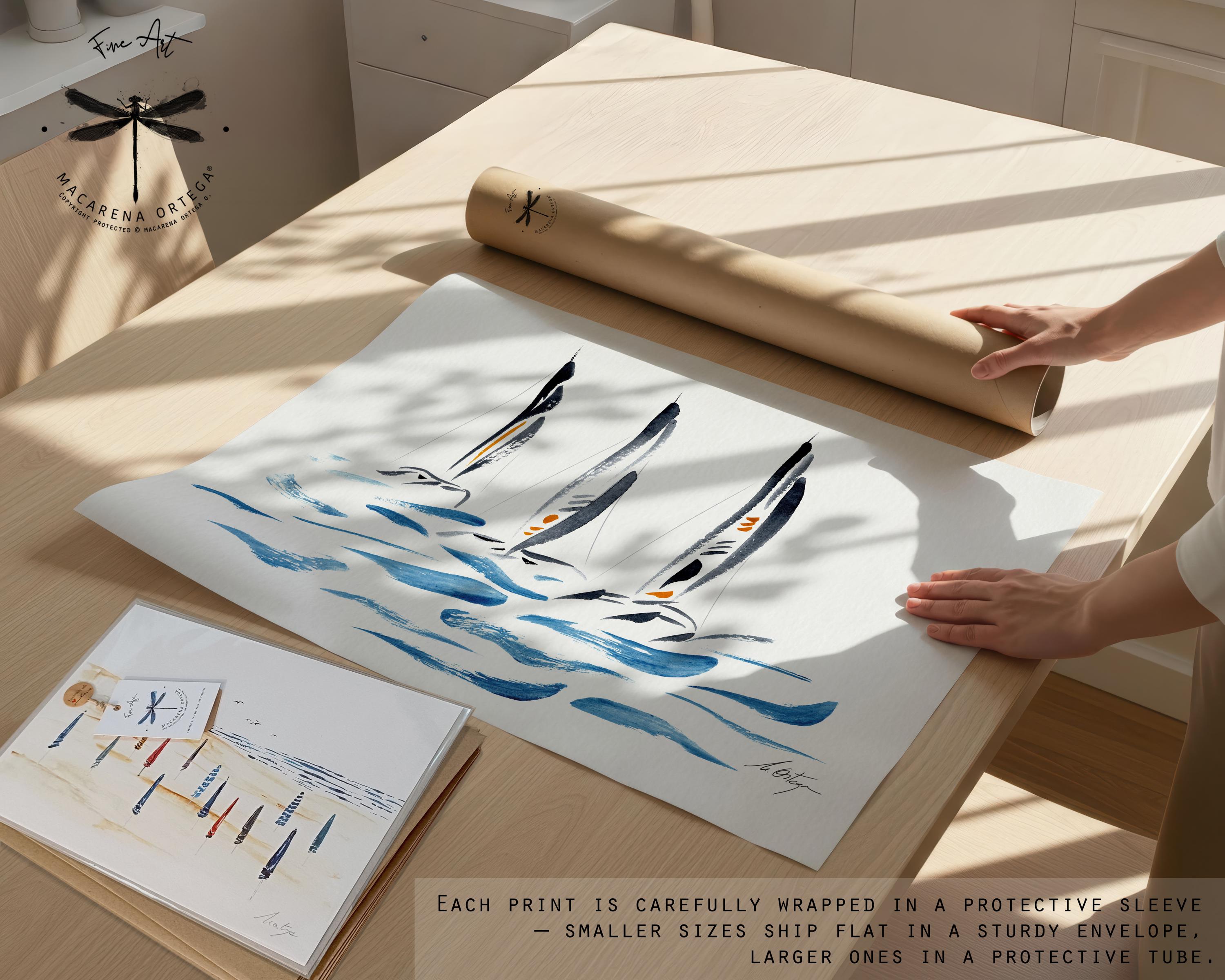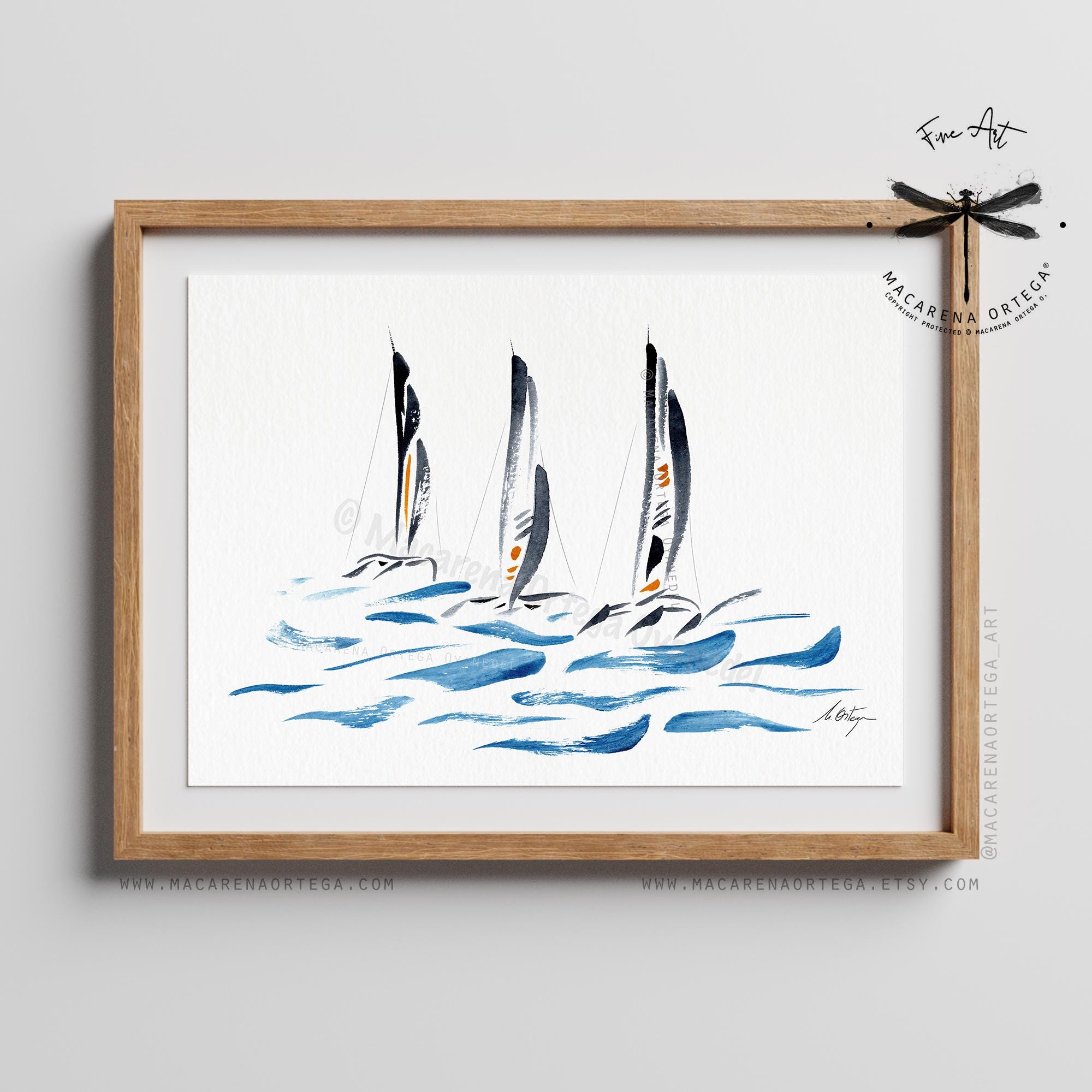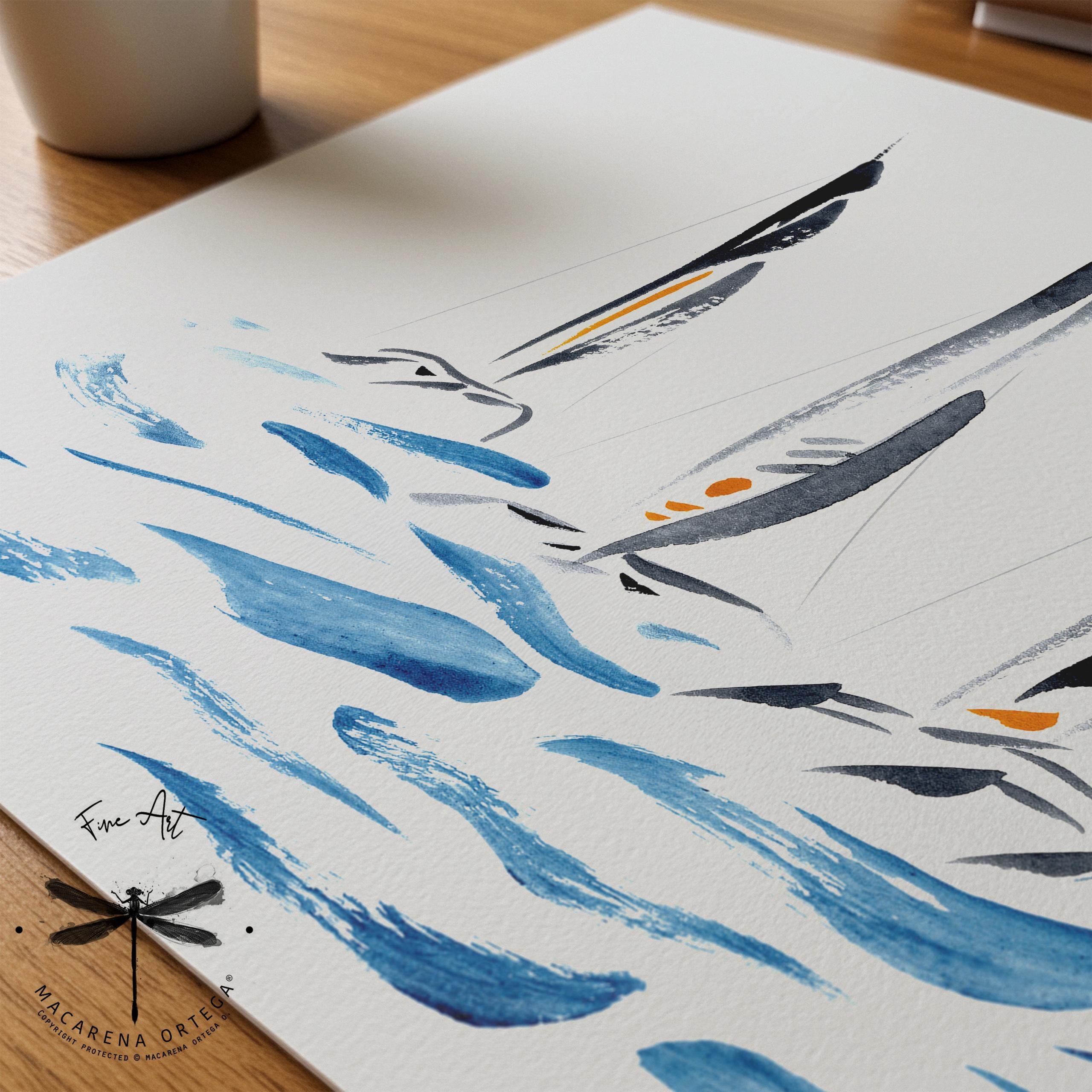 Minimal trimaran sailboats — a watercolor in modern, elegant tones. I really enjoyed painting this piece; it was a challenge to capture their unique structure and movement using just a few expressive, simple strokes.